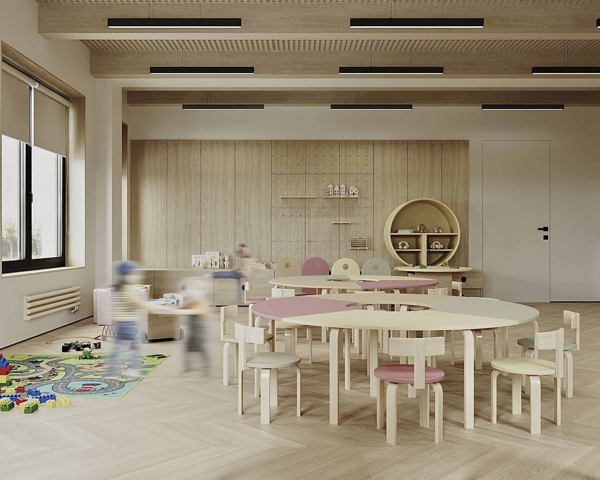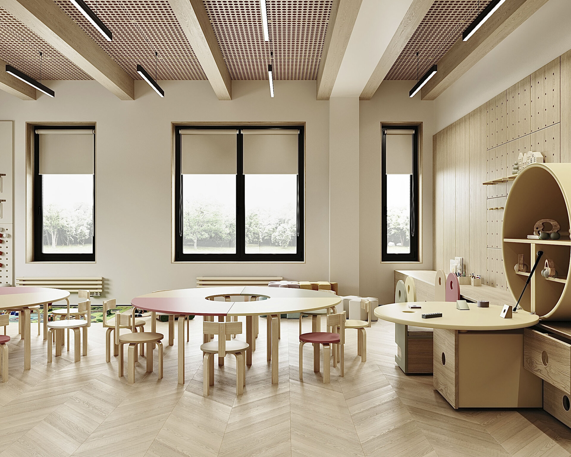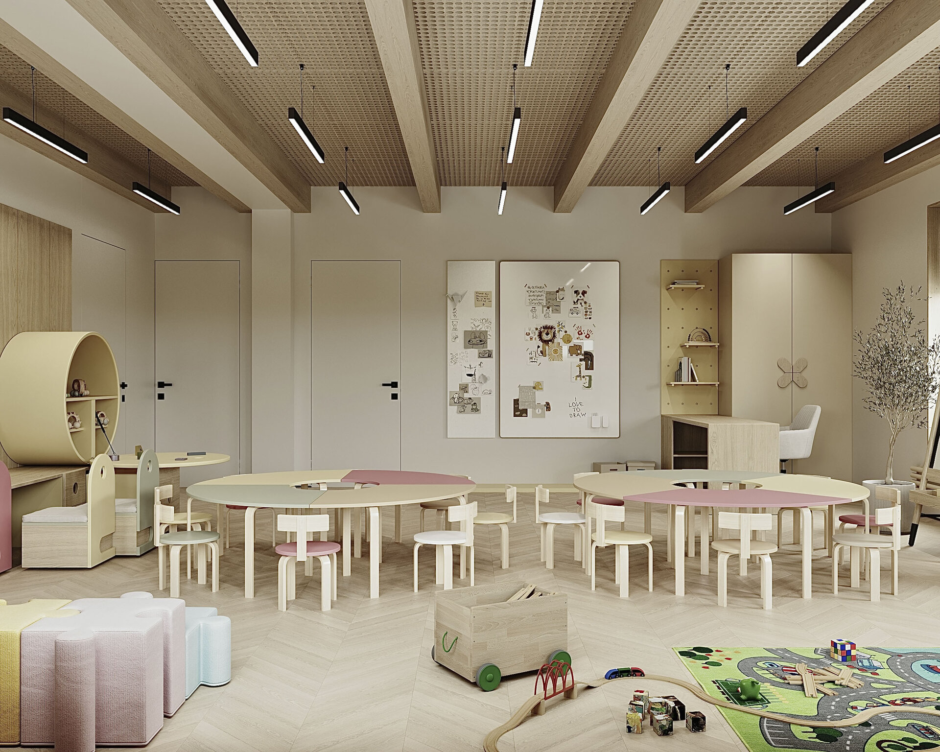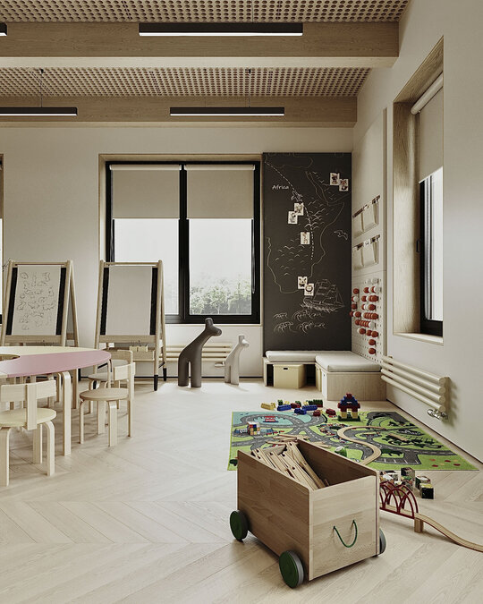 S-a pus accent pe organizarea clară a spațiilor: săli de grupă, dormitoare, grupuri sanitare, spații administrative, sală de festivități, bucătărie și spații tehnice. Toate încăperile au fost compartimentate astfel încât circulația să fie logică, sigură și ușor de urmărit de către copii. Materialele folosite sunt durabile, ecologice, ușor de întreținut și adaptate pentru un spațiu frecventat de copii mici. Pardoselile SPC, gresia în băi, vopseaua hipoalergenică, panourile decorative din MDF sau perforate și mobilierul ergonomic asigură un mediu funcțional, dar și prietenos.