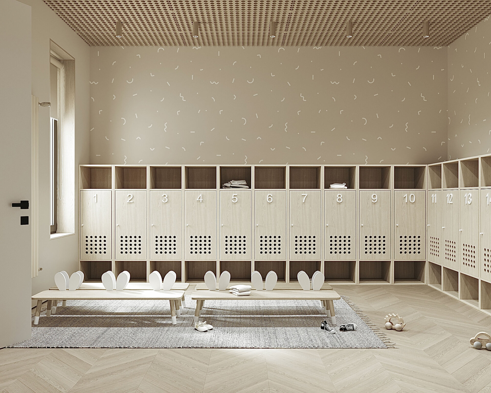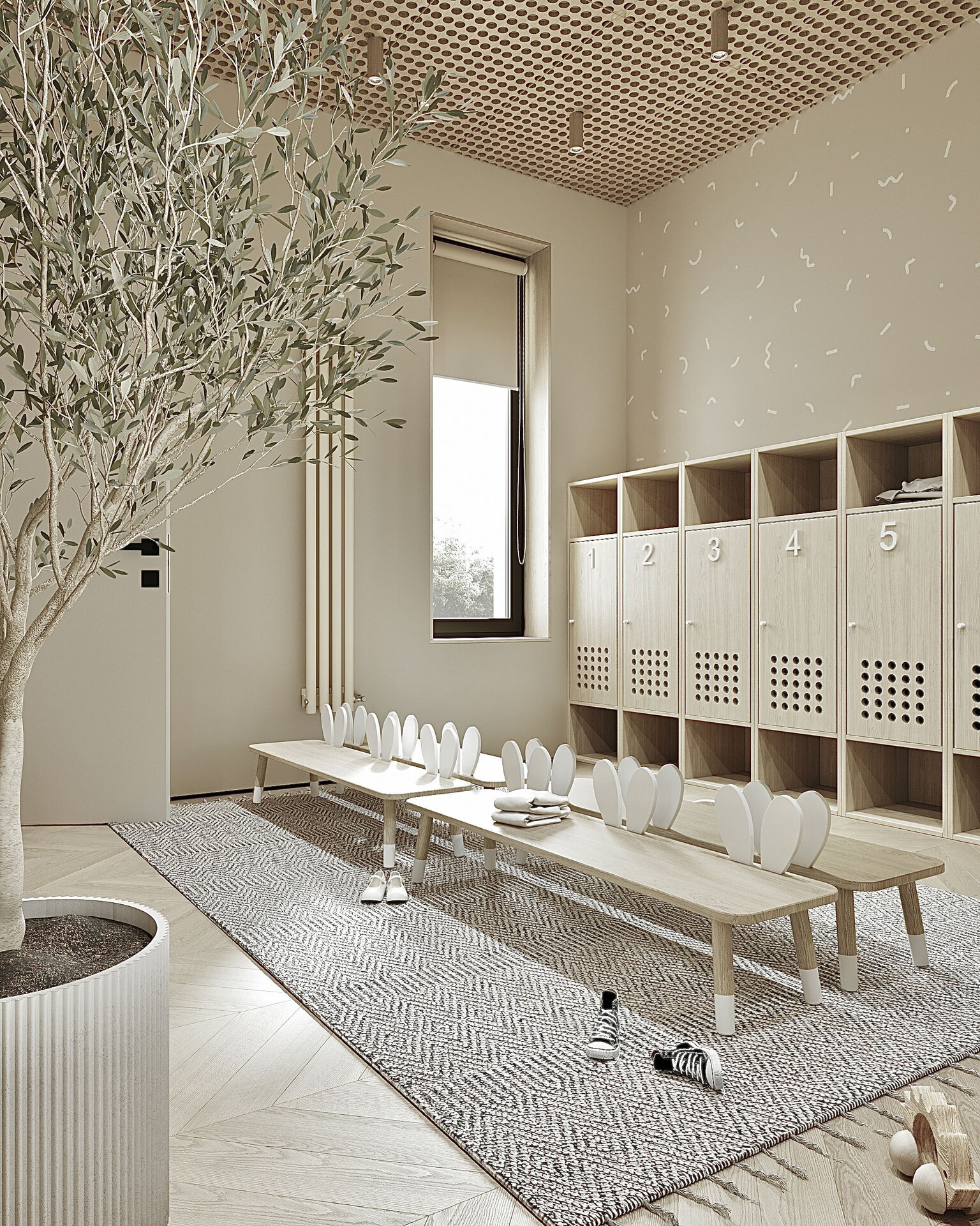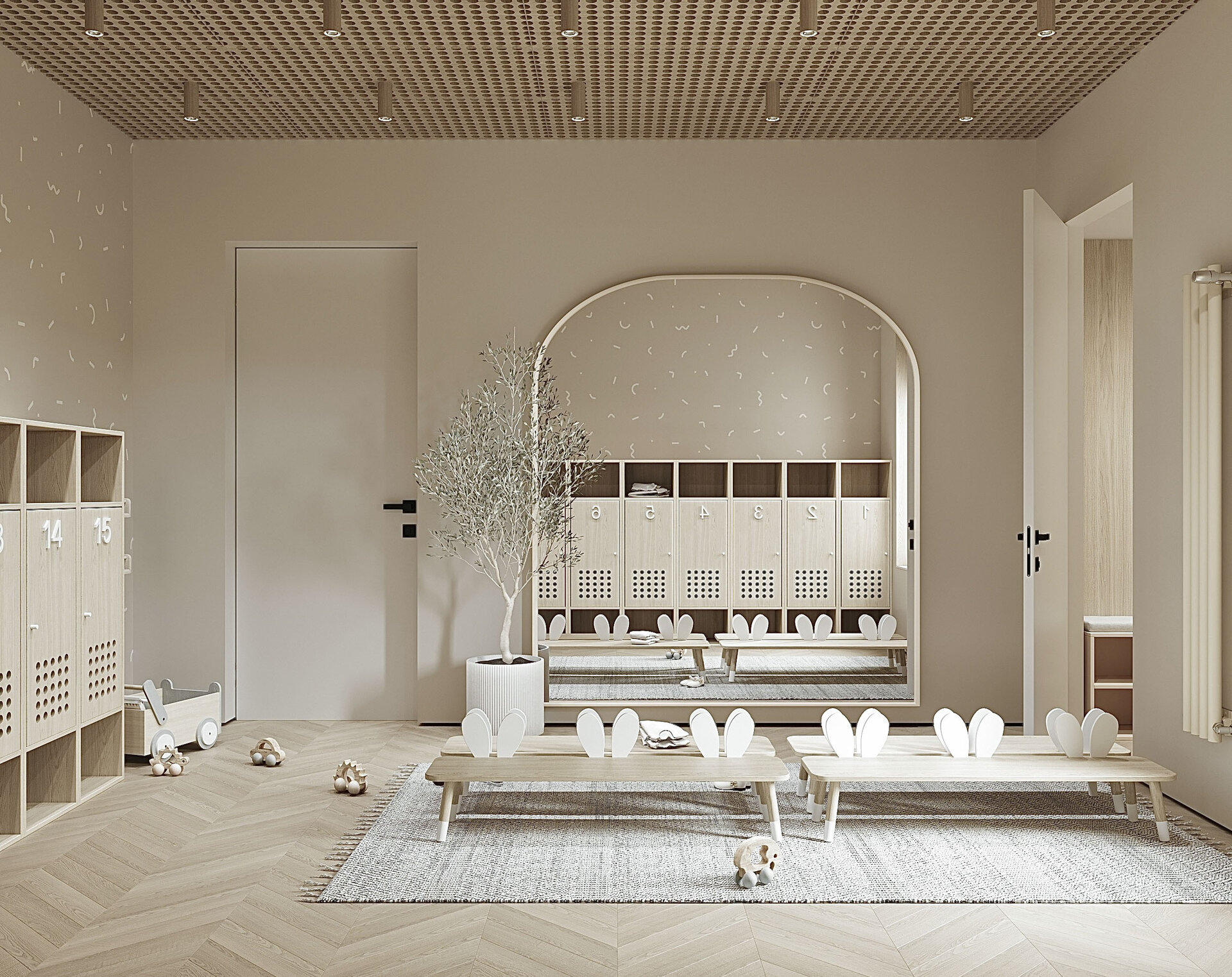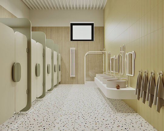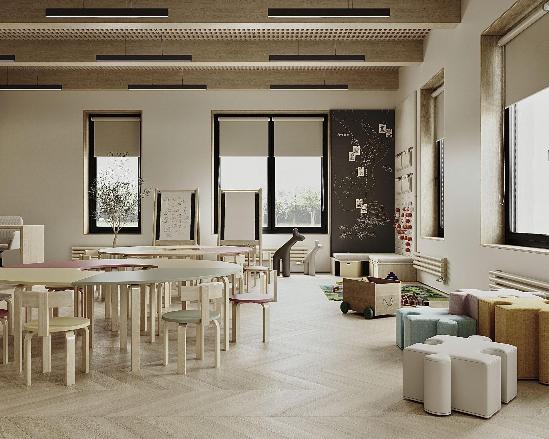 S-a pus accent pe organizarea clară a spațiilor: săli de grupă, dormitoare, grupuri sanitare, spații administrative, sală de festivități, bucătărie și spații tehnice. Toate încăperile au fost compartimentate astfel încât circulația să fie logică, sigură și ușor de urmărit de către copii. Materialele folosite sunt durabile, ecologice, ușor de întreținut și adaptate pentru un spațiu frecventat de copii mici. Pardoselile SPC, gresia în băi, vopseaua hipoalergenică, panourile decorative din MDF sau perforate și mobilierul ergonomic asigură un mediu funcțional, dar și prietenos.