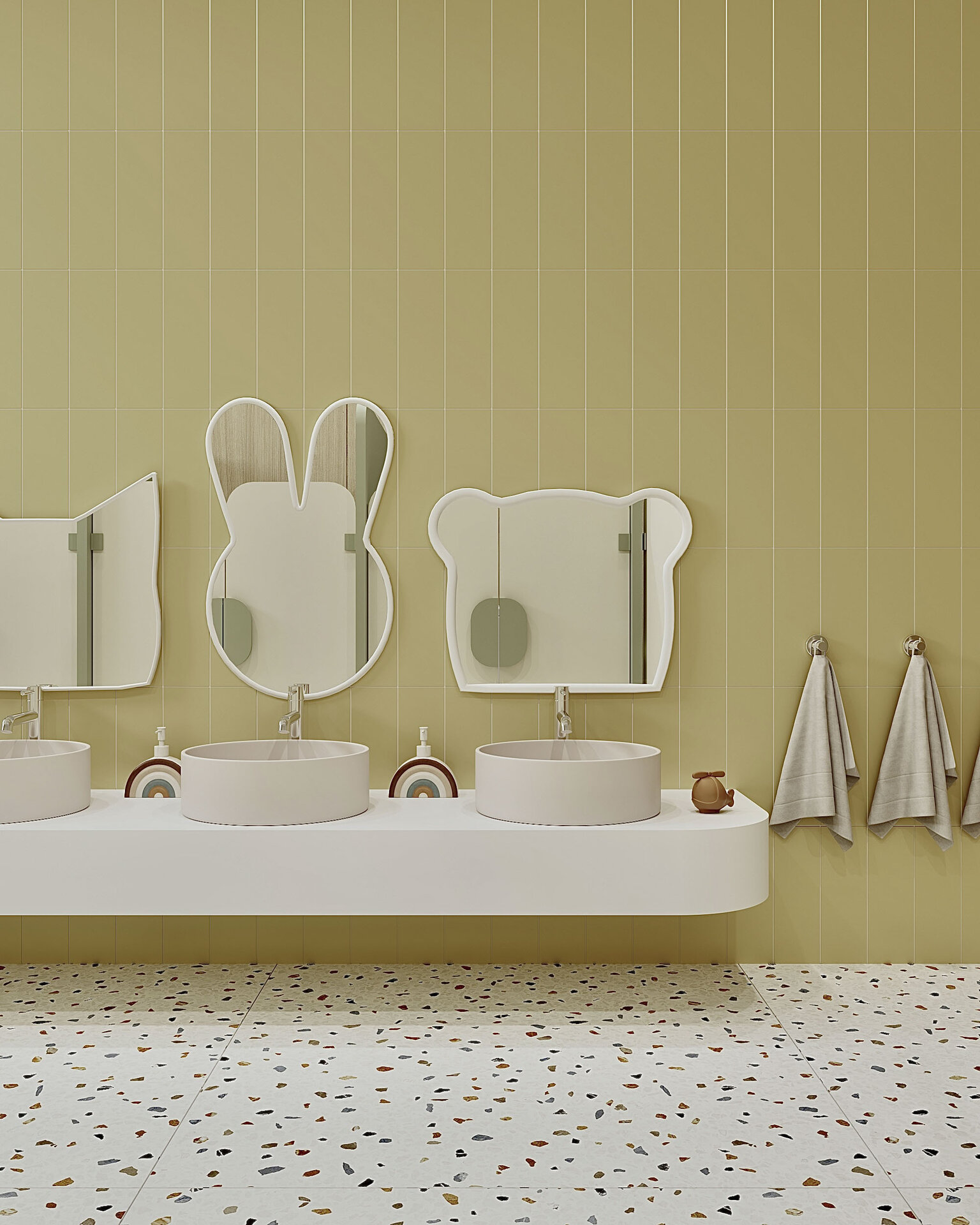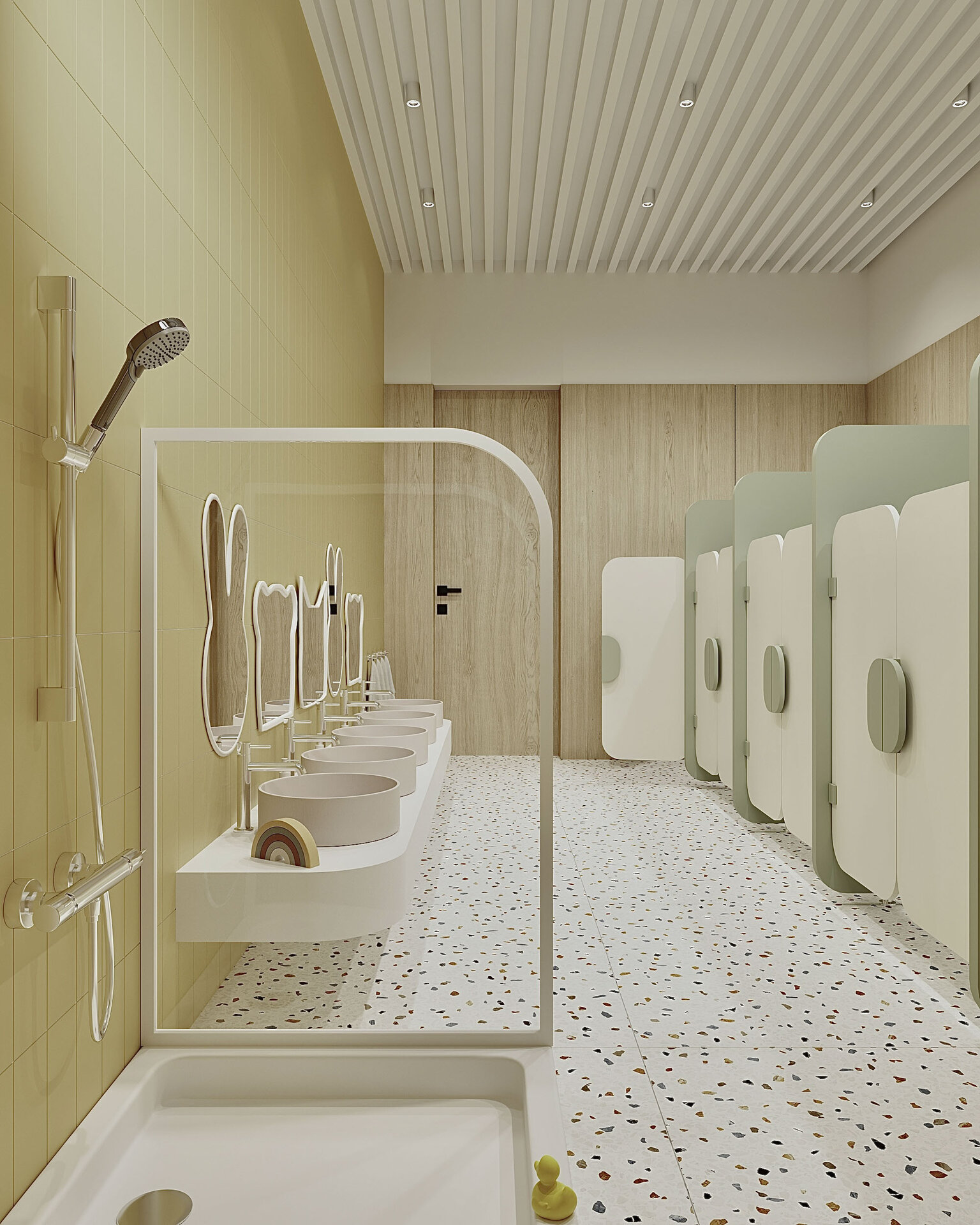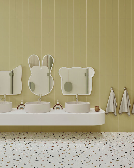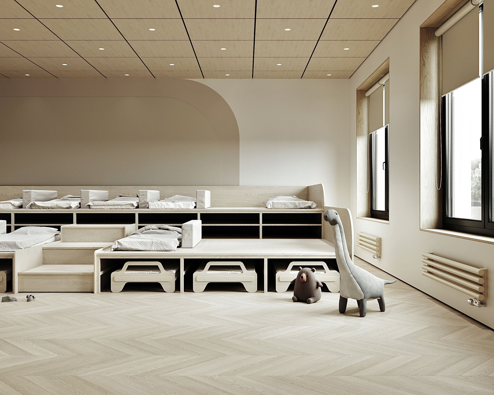S-a pus accent pe organizarea clară a spațiilor: săli de grupă, dormitoare, grupuri sanitare, spații administrative, sală de festivități, bucătărie și spații tehnice. Toate încăperile au fost compartimentate astfel încât circulația să fie logică, sigură și ușor de urmărit de către copii. Materialele folosite sunt durabile, ecologice, ușor de întreținut și adaptate pentru un spațiu frecventat de copii mici. Pardoselile SPC, gresia în băi, vopseaua hipoalergenică, panourile decorative din MDF sau perforate și mobilierul ergonomic asigură un mediu funcțional, dar și prietenos.