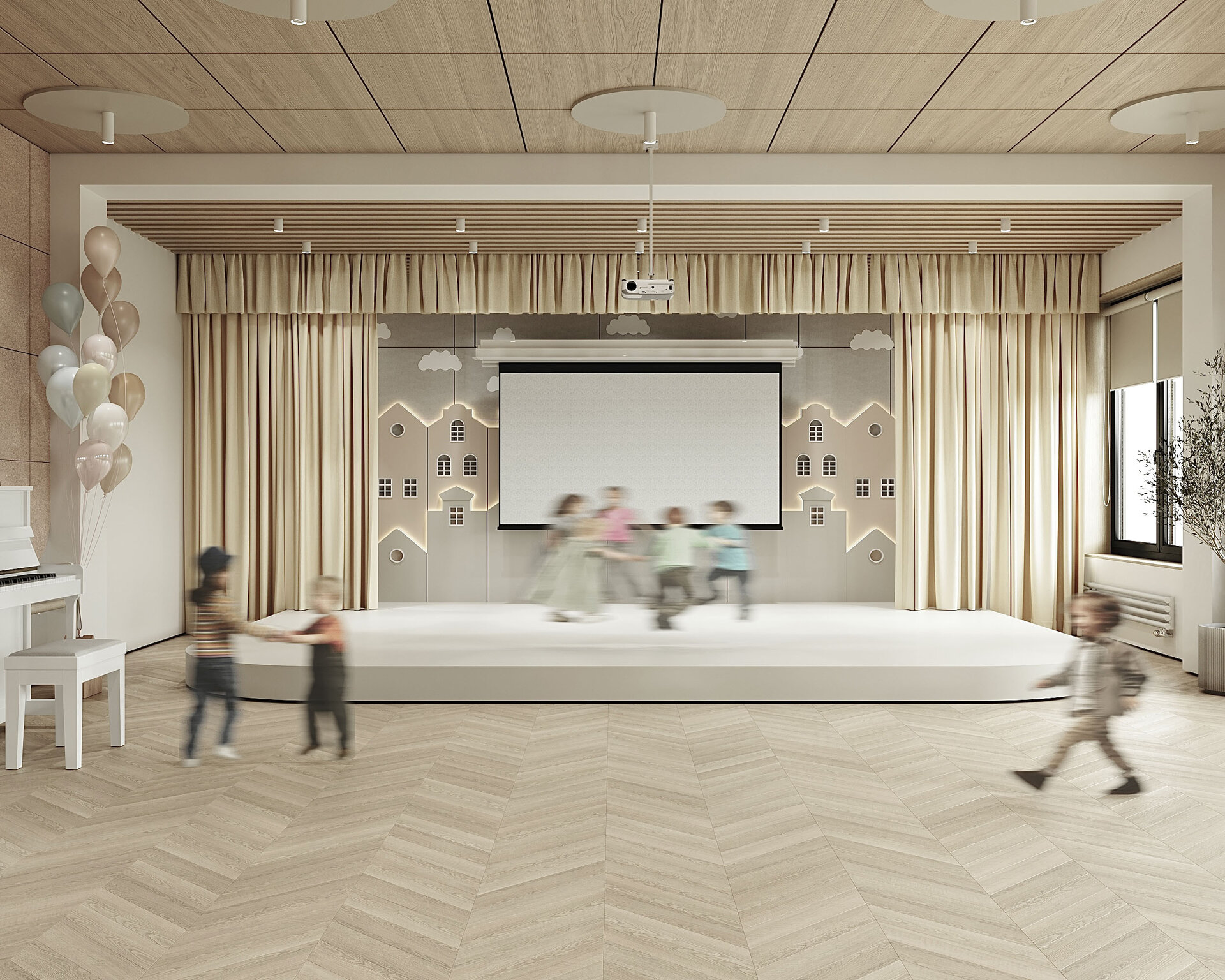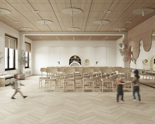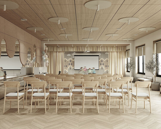 Un punct important în proiect l-a reprezentat confortul acustic, mai ales în sala de festivități, unde au fost aplicate măsuri de izolare fonică prin utilizarea de panouri moi, draperii și elemente absorbante pe tavan și pereți. Aceste soluții ajută la reducerea zgomotului și îmbunătățesc claritatea sunetului în timpul activităților colective.