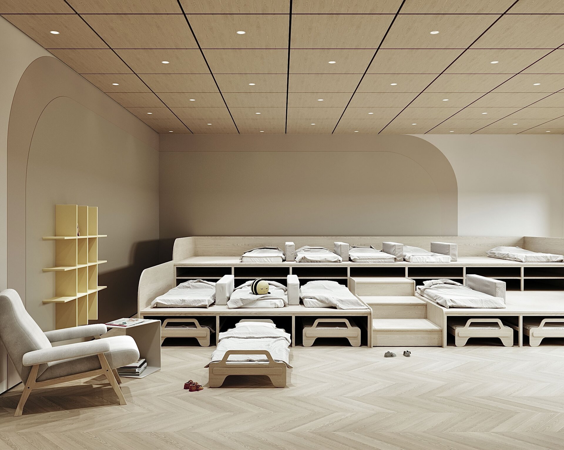 Grădinița „Guguță” nu a fost doar modernizată estetic, ci și adaptată din punct de vedere funcțional, astfel încât fiecare spațiu să servească în mod clar un scop: educație, joacă, odihnă sau organizare. Spațiile sunt flexibile, mobilierul este modular, iar încăperile pot fi adaptate rapid pentru diverse activități. Siguranța copiilor a fost prioritară: toate colțurile sunt rotunjite, materialele sunt non-toxice, iar accesul la diverse funcțiuni este ușor și sigur. Proiectul reflectă o abordare centrată pe copil, unde fiecare element este gândit pentru a sprijini creșterea armonioasă, starea de bine și dezvoltarea abilităților necesare vârstei. Grădinița „Guguță” devine astfel un spațiu modern, cald și funcțional, unde copiii pot învăța, se pot juca și pot crește într-un mediu sigur și echilibrat.