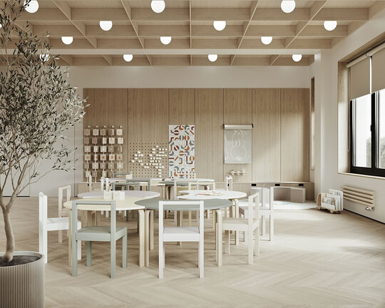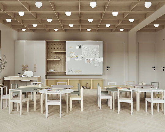 Din punct de vedere stilistic, grădinița combină elemente ale stilului scandinav cu cele moderne. Stilul scandinav aduce simplitate, naturalețe și multă lumină, în timp ce elementele moderne oferă funcționalitate, linii clare și soluții inteligente pentru depozitare și iluminat. Paleta cromatică este alcătuită din nuanțe deschise, cu accente naturale, care creează o atmosferă calmă și caldă. Corpurile de iluminat, precum spoturile aplicate, corpuri liniare suspendare sau sferele suspendate au fost alese atât pentru funcționalitate, cât și pentru aspectul decorativ.