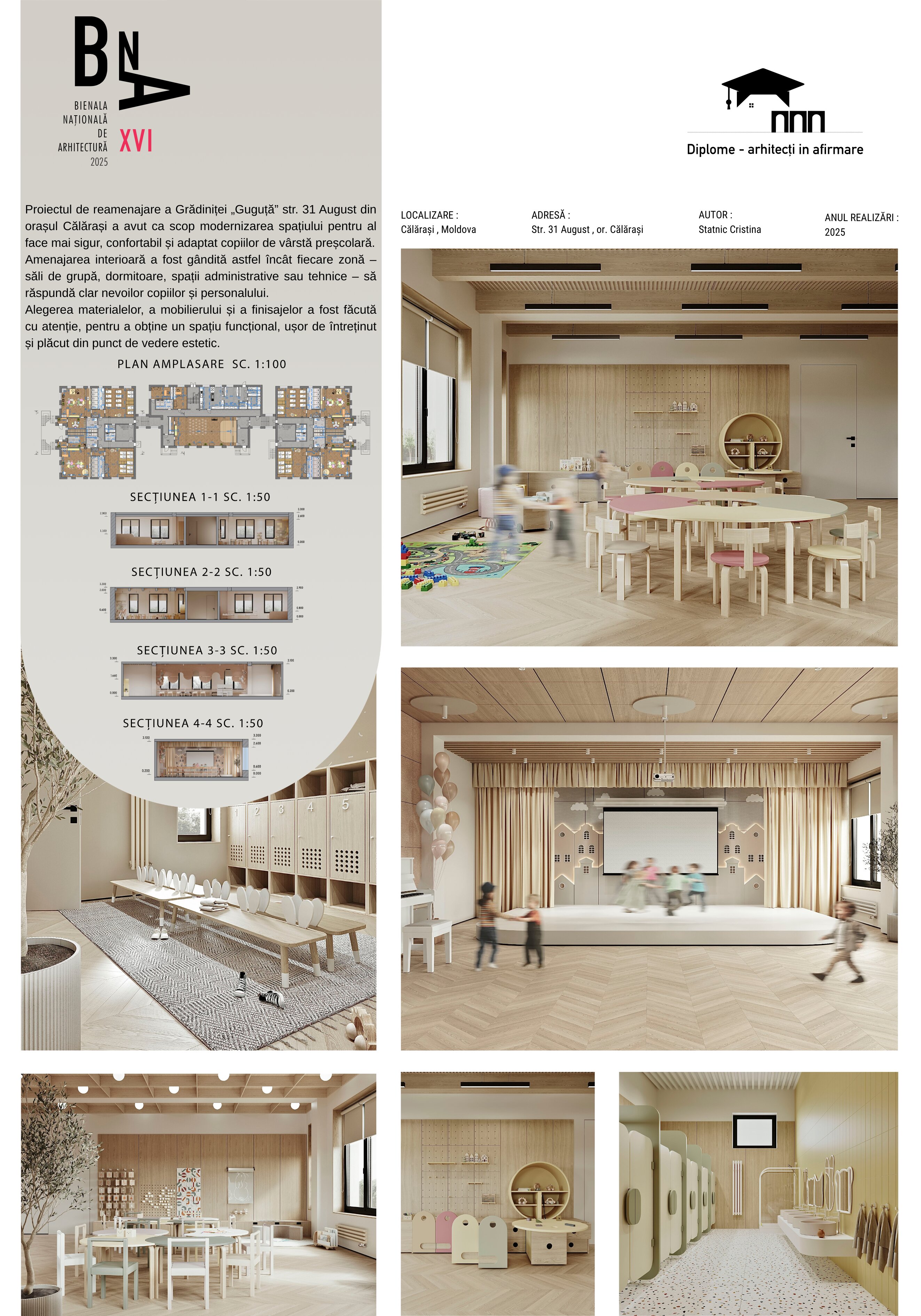 Proiectul de reamenajare a Grădiniței „Guguță” a pornit de la nevoia de a crea un mediu educațional modern, sigur și plăcut pentru copiii de vârstă preșcolară. Clădirea grădiniței se află în orașul Călărași și este organizată pe trei niveluri: subsol, parter și etaj. Fiecare zonă a fost regândită pentru a răspunde nevoilor reale ale copiilor, educatorilor și întregului personal.