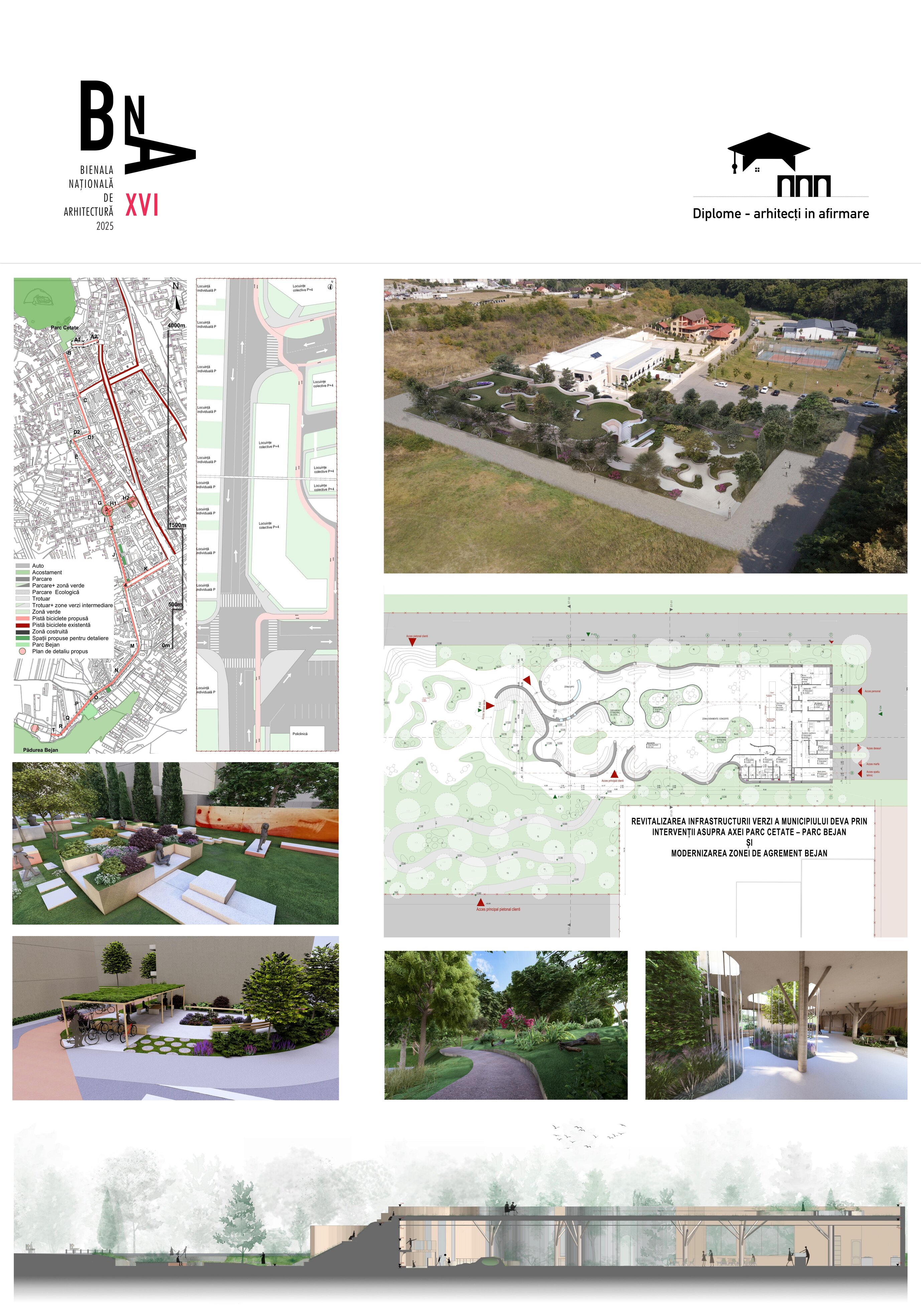 1. Soluția de intervenție propune amenajarea unei zone verzi echipate cu mobilier urban, menită să servească atât trecătorii, cât și locuitorii din zonă. Spațiul a fost conceput ca o stație de odihnă pentru bicicliști, amplasată strategic la o distanță optimă pe axa principală a pistei velo, în punctul în care aceasta se ramifică.