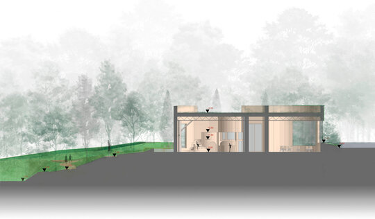 Accesul pietonal a fost gândit să imite o plimbare prin pădure. Traseul de intrare urmează o cale sinuoasă, iar succesiunea de spații cu diverse dimensiuni și forme generează un sentiment de descoperire și surpriză.