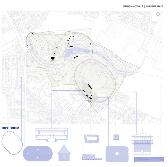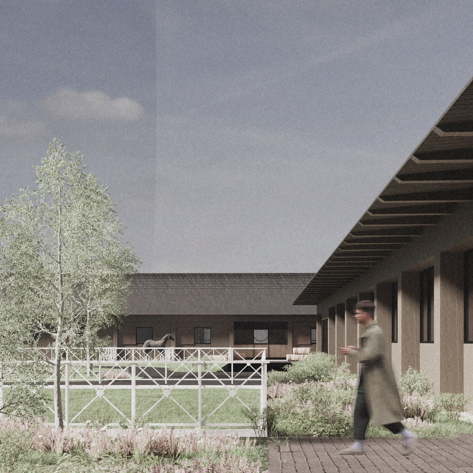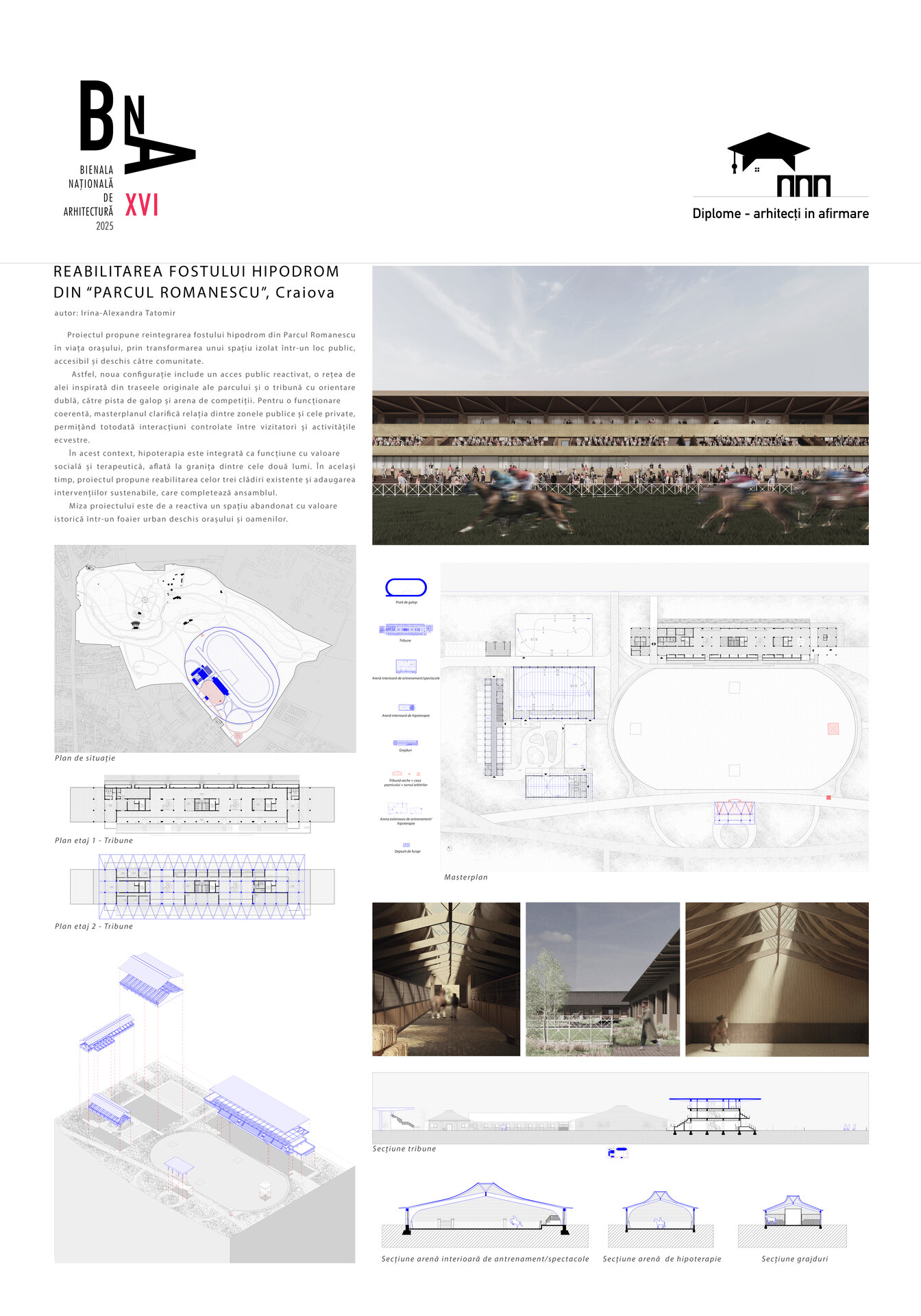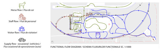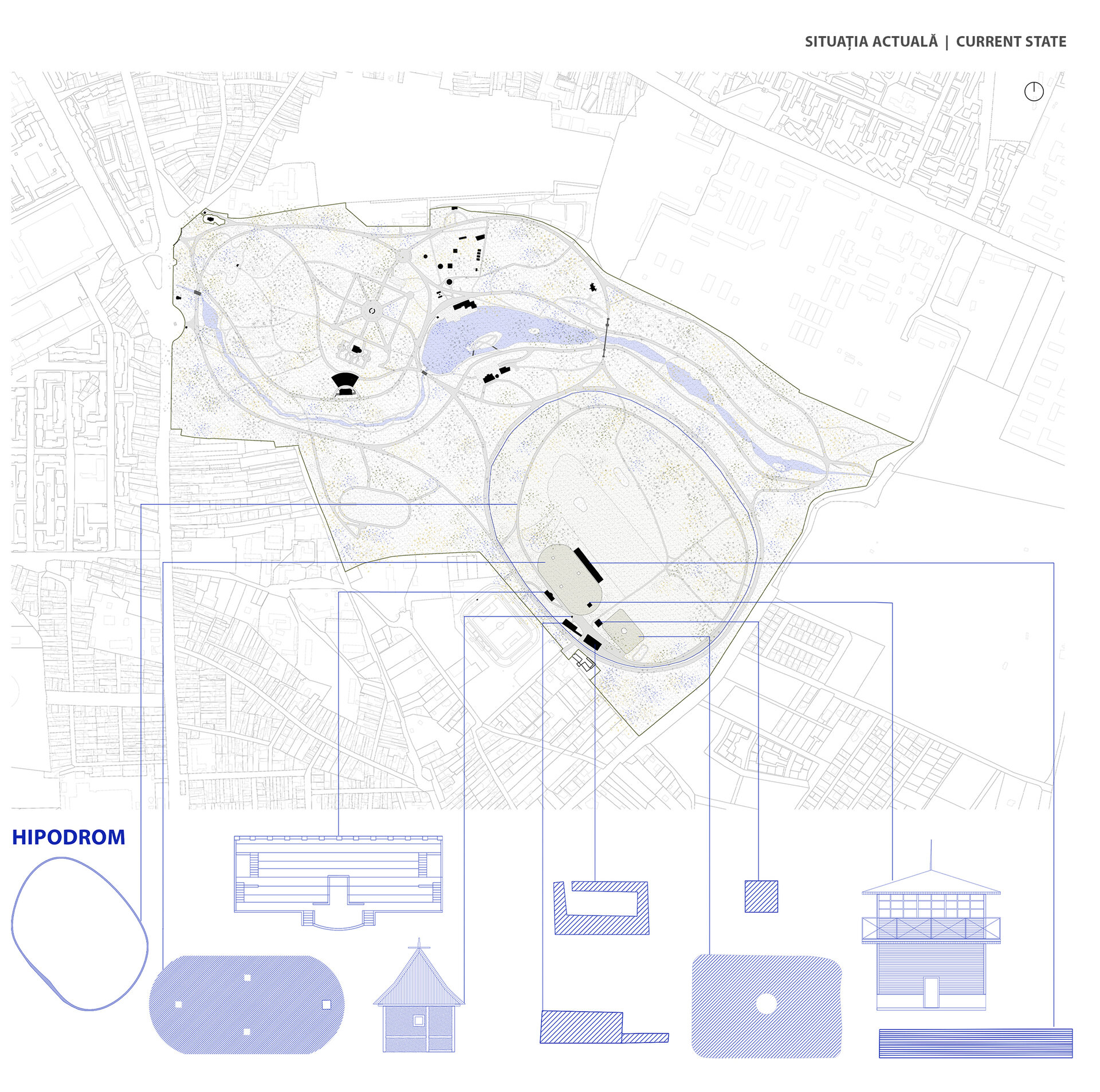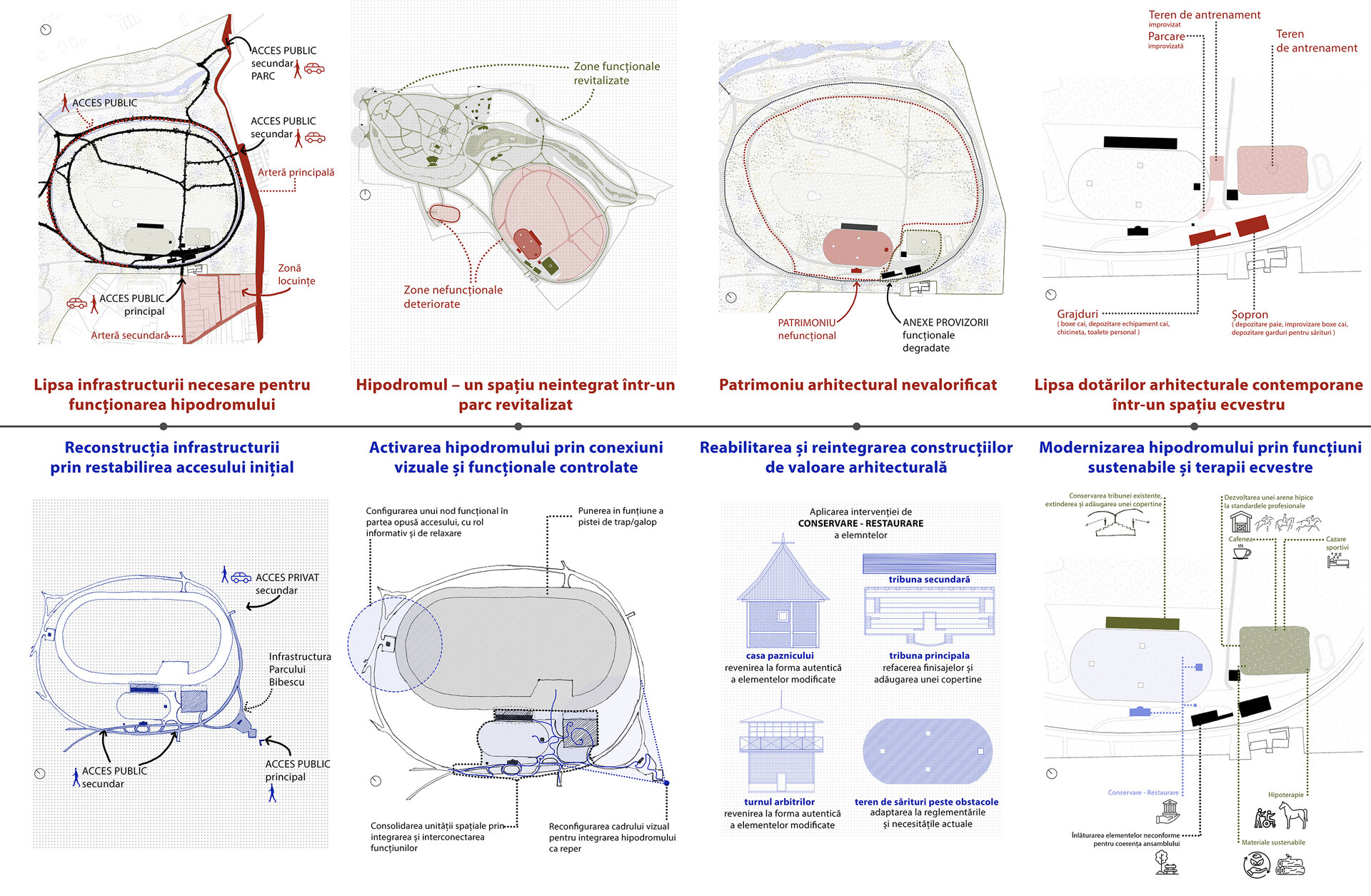 Pentru a atinge acest obiectiv, este propusă o restructurare a infrastructurii existente. Se introduce un acces public nou, inspirat din planul original al Parcului Bibescu, care reconectează situl cu traseele principale de circulație. Totodata, este restaurată rețeaua de alei istorice din interiorul hipodromului, iar tribuna este reactivată. La nivel funcțional, masterplanul organizează clar relația dintre zona publică și cea destinată personalului și activităților ecvestre. Partea estică este destinată vizitatorilor, în timp ce zona vestică este dedicată exclusiv activităților private. Această separare permite siguranța circulației, dar lasă loc și pentru interacțiuni controlate. Proiectul propune reabilitarea celor trei clădiri existente pe sit: tribuna istorică, turnul arbitrilor și casa paznicului. În plus, propun o nouă tribună cu orientare dublă, care deschide două perspective majore: una către pista de galop și cealaltă către arena de competiții deja existentă. Astfel, tribuna devine un punct de sprijin și orientare pentru întregul ansamblu.Așadar, hipodromul devine un foaier urban, cu funcțiuni contemporane, dar ancorate în specificul locului, cu limite flexibile și relații firești între oameni, animale și arhitectură.