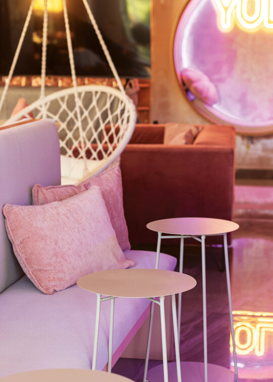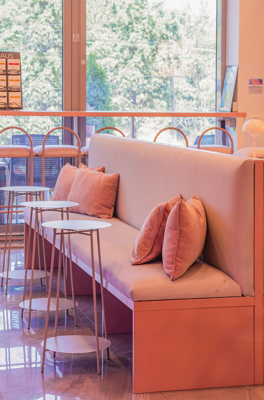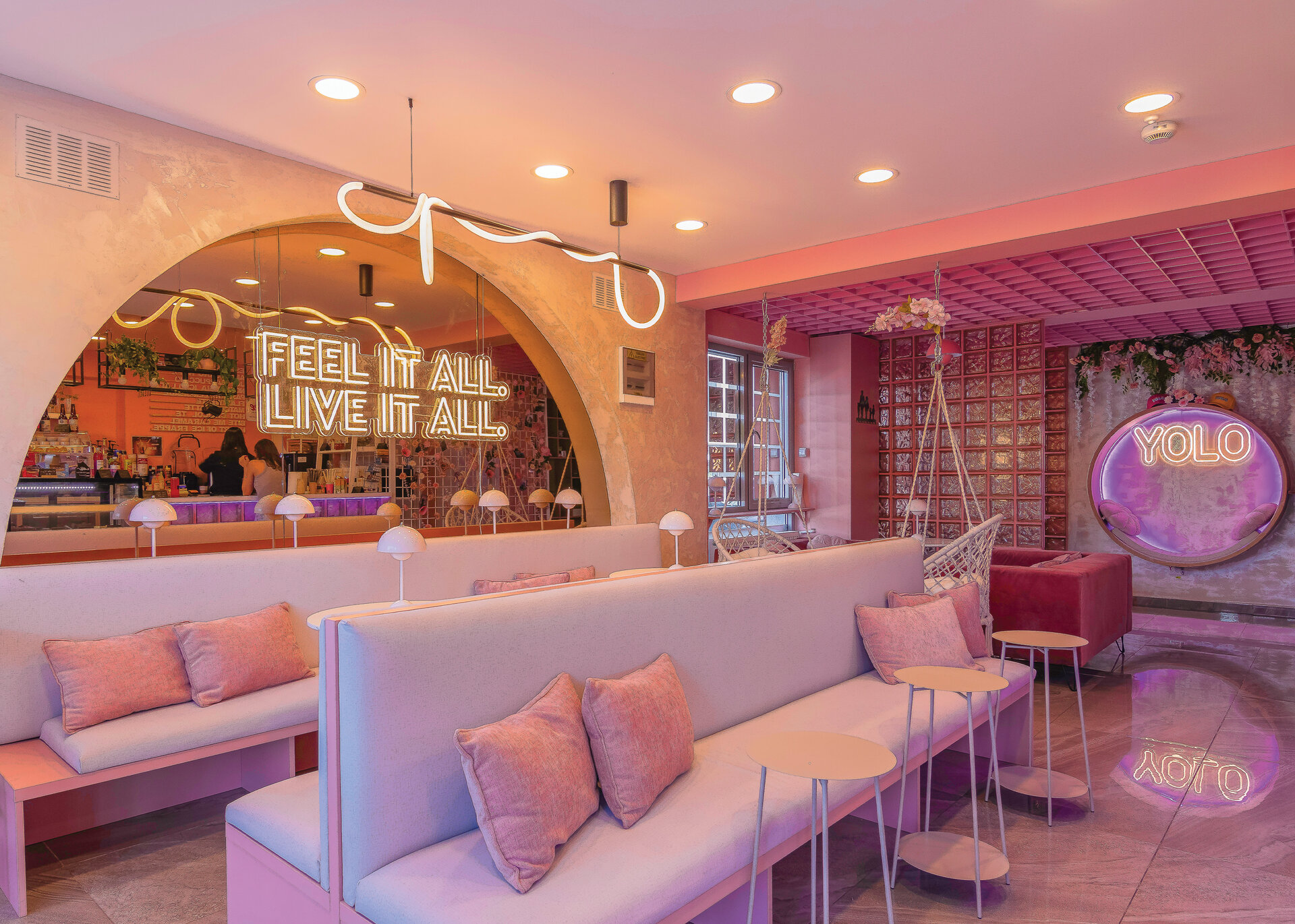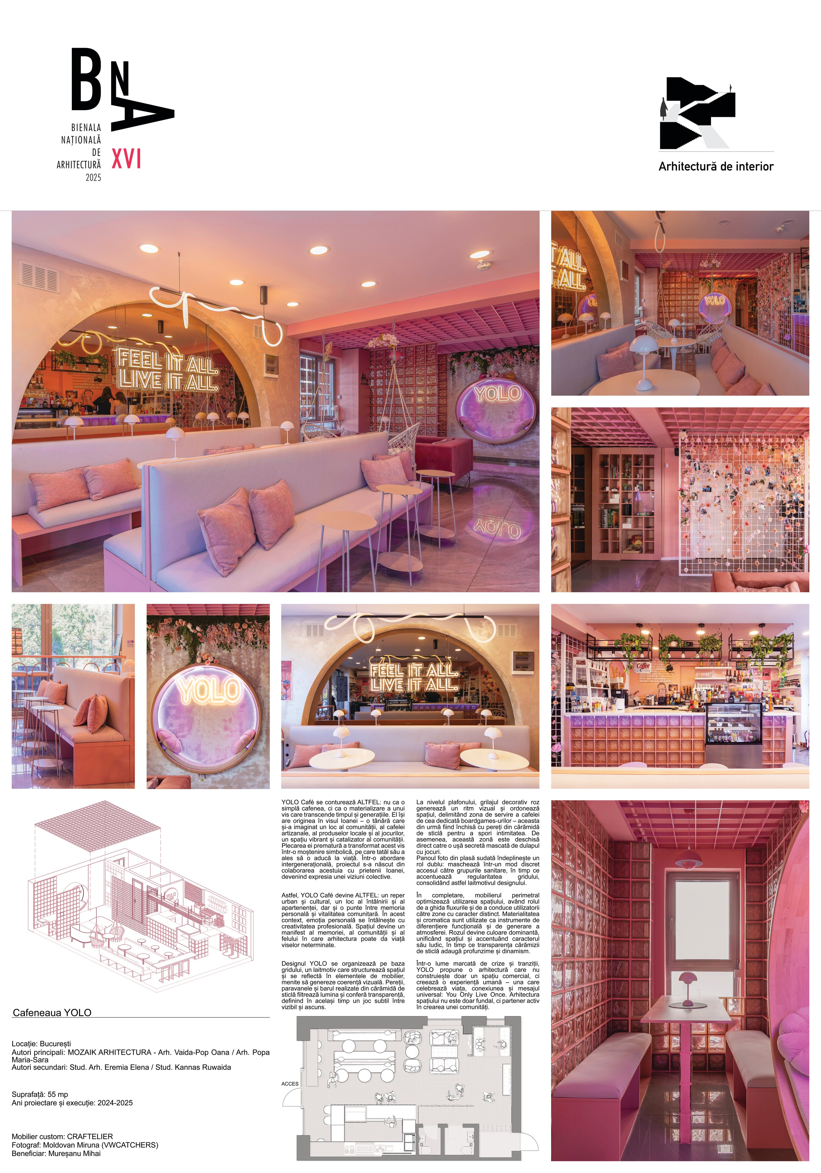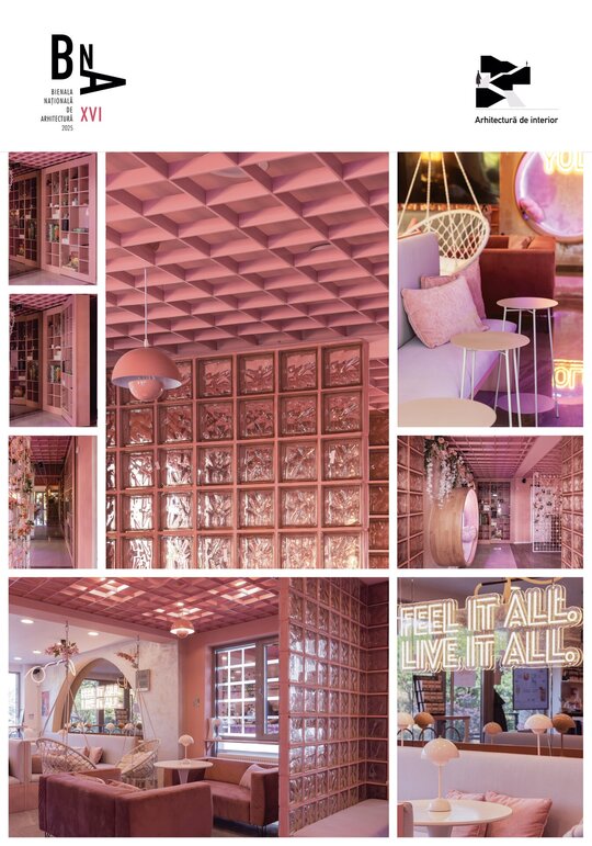 În completare, mobilierul perimetral optimizează utilizarea spațiului, având rolul de a ghida fluxurile și de a conduce utilizatorii către zone cu caracter distinct. Materialitatea și cromatica sunt utilizate ca instrumente de diferențiere funcțională și de generare a atmosferei. Rozul devine culoare dominantă, unificând spațiul și accentuând caracterul său ludic, în timp ce transparența cărămizii de sticlă adaugă profunzime și dinamism. În ansamblu, spațiul Yolo dezvoltă o atmosferă definită de surpriză și descoperire, dar unificată printr-o estetică coerentă, susținută de cromatică și materialitate.