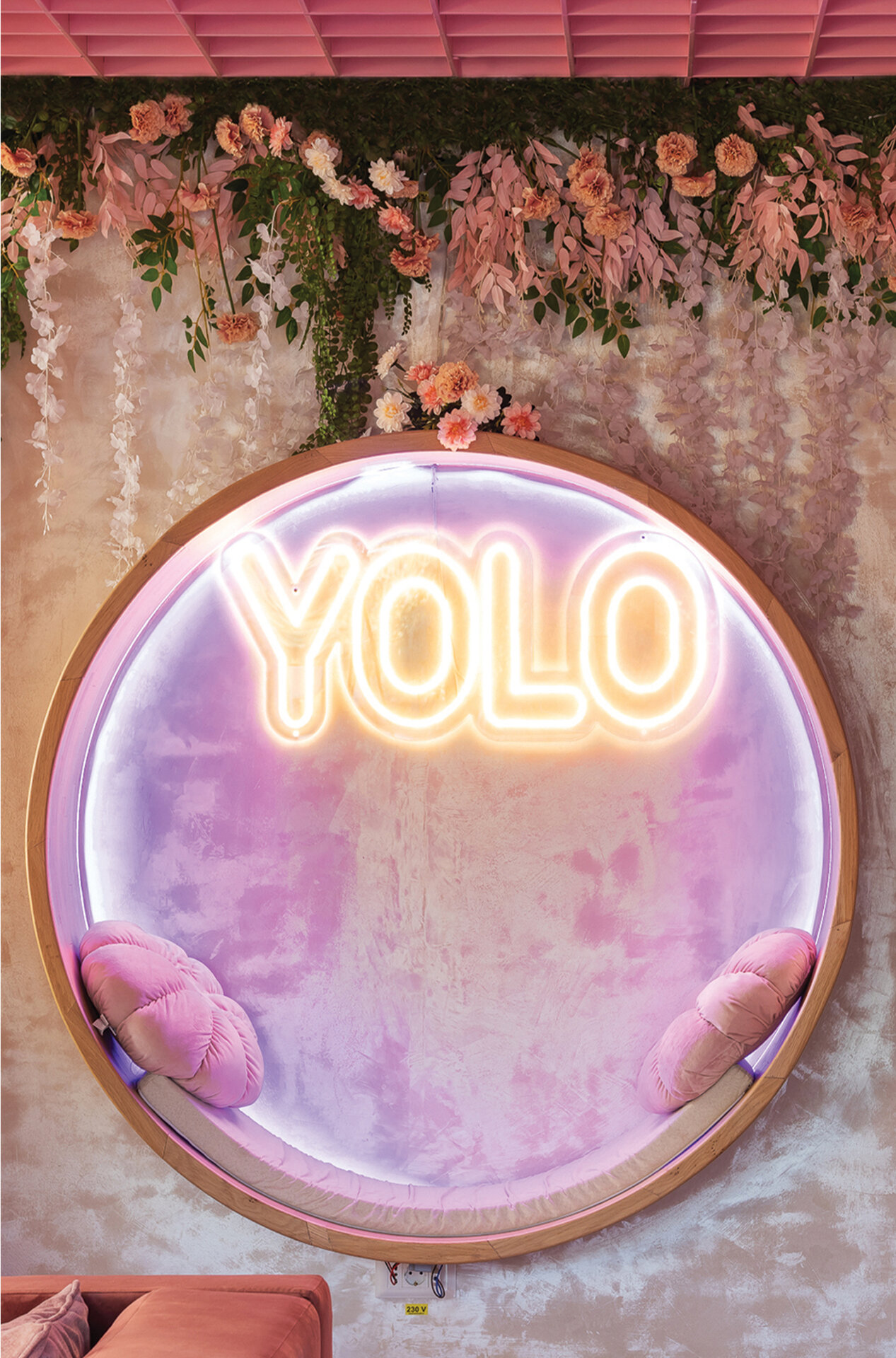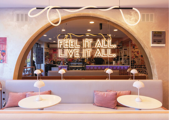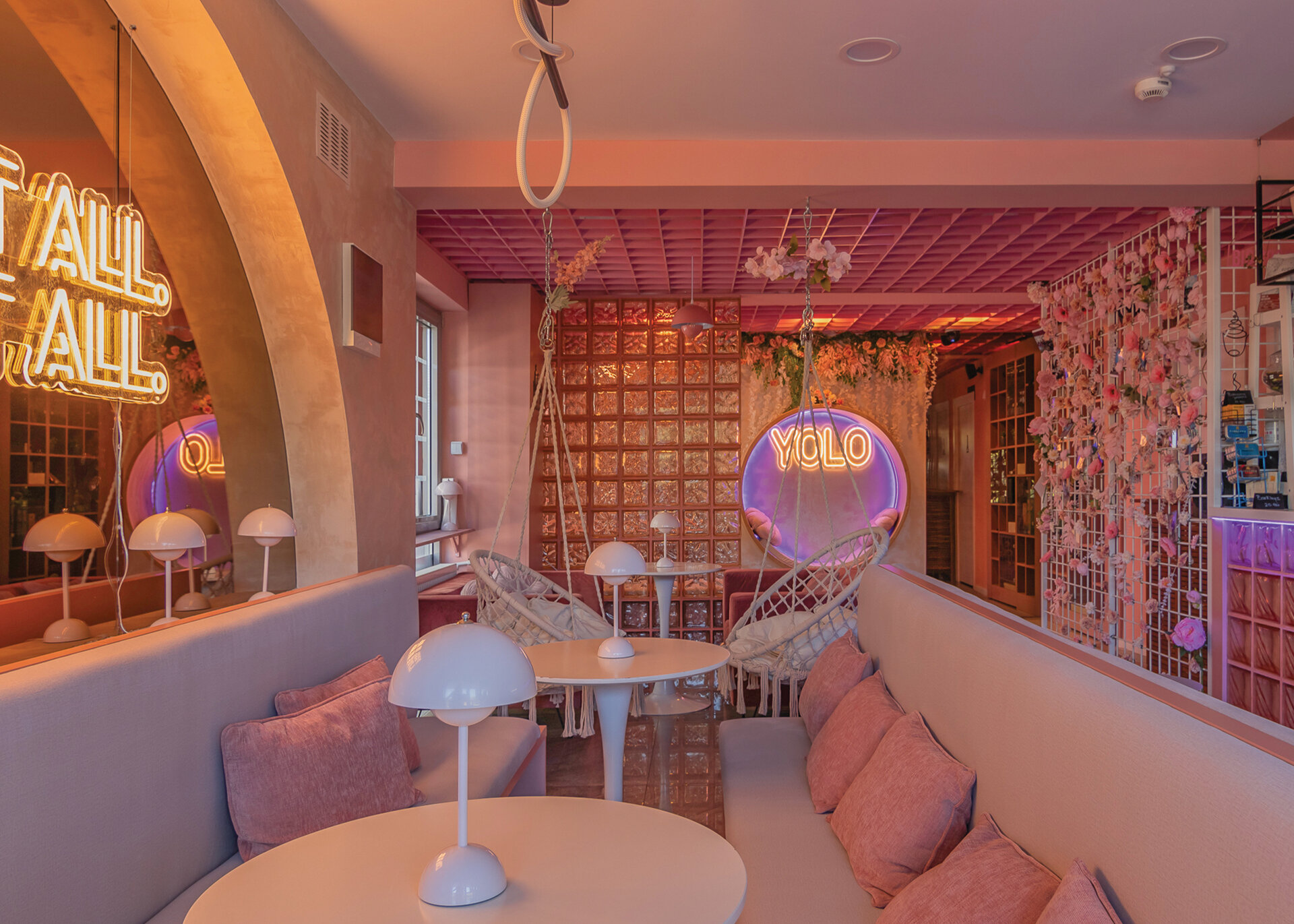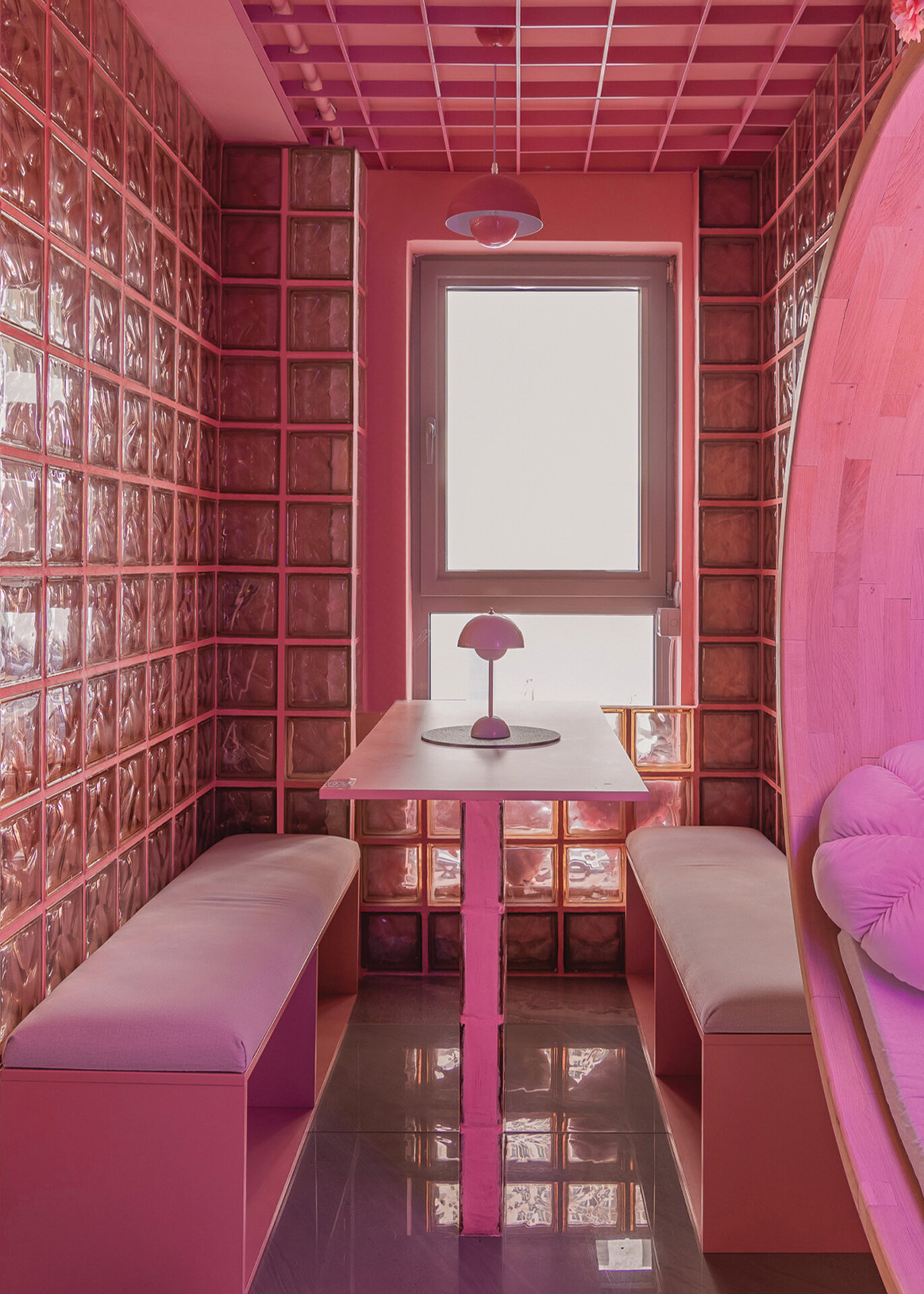 În completare, mobilierul perimetral optimizează utilizarea spațiului, având rolul de a ghida fluxurile și de a conduce utilizatorii către zone cu caracter distinct. Materialitatea și cromatica sunt utilizate ca instrumente de diferențiere funcțională și de generare a atmosferei. Rozul devine culoare dominantă, unificând spațiul și accentuând caracterul său ludic, în timp ce transparența cărămizii de sticlă adaugă profunzime și dinamism. În ansamblu, spațiul Yolo dezvoltă o atmosferă definită de surpriză și descoperire, dar unificată printr-o estetică coerentă, susținută de cromatică și materialitate.