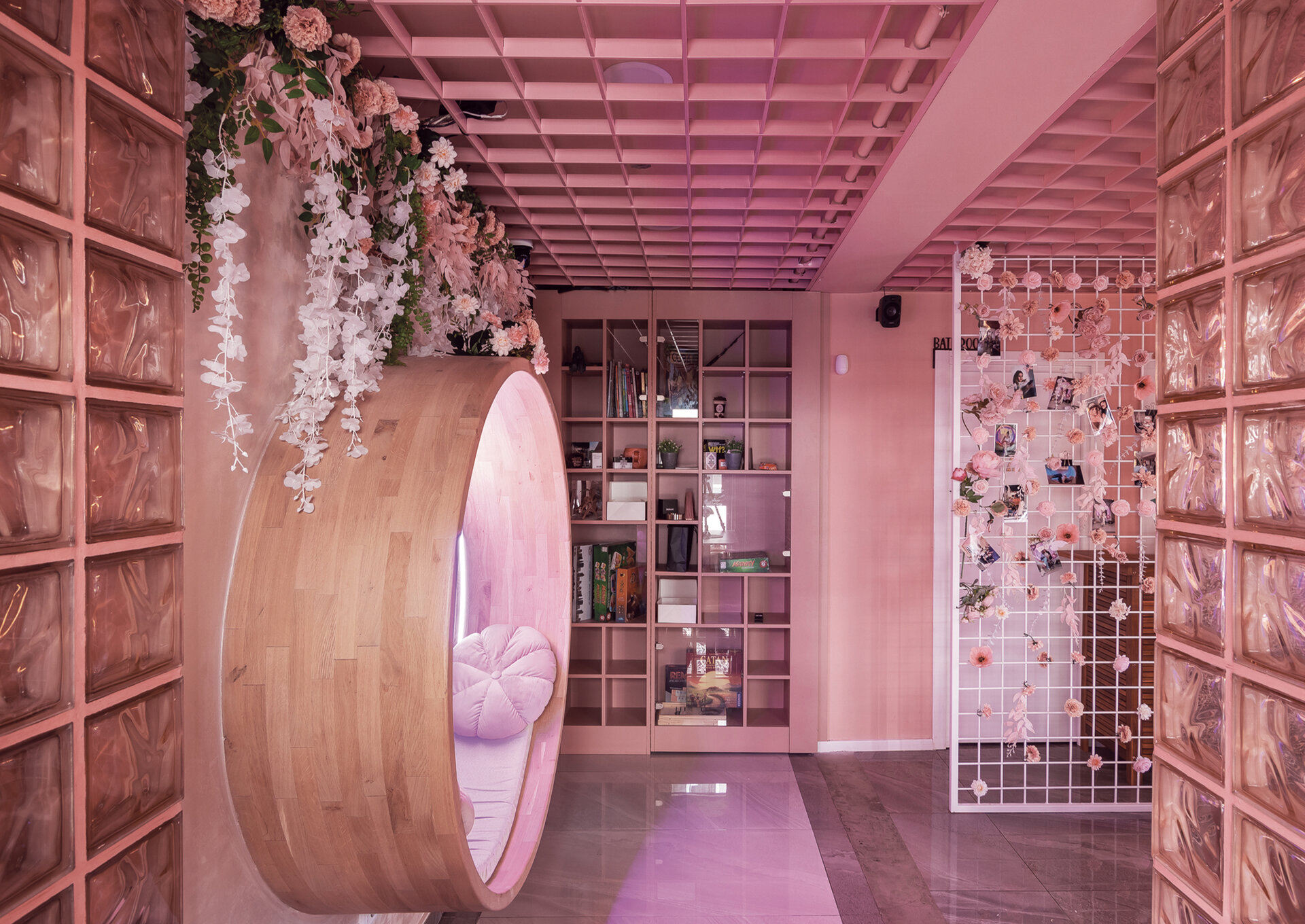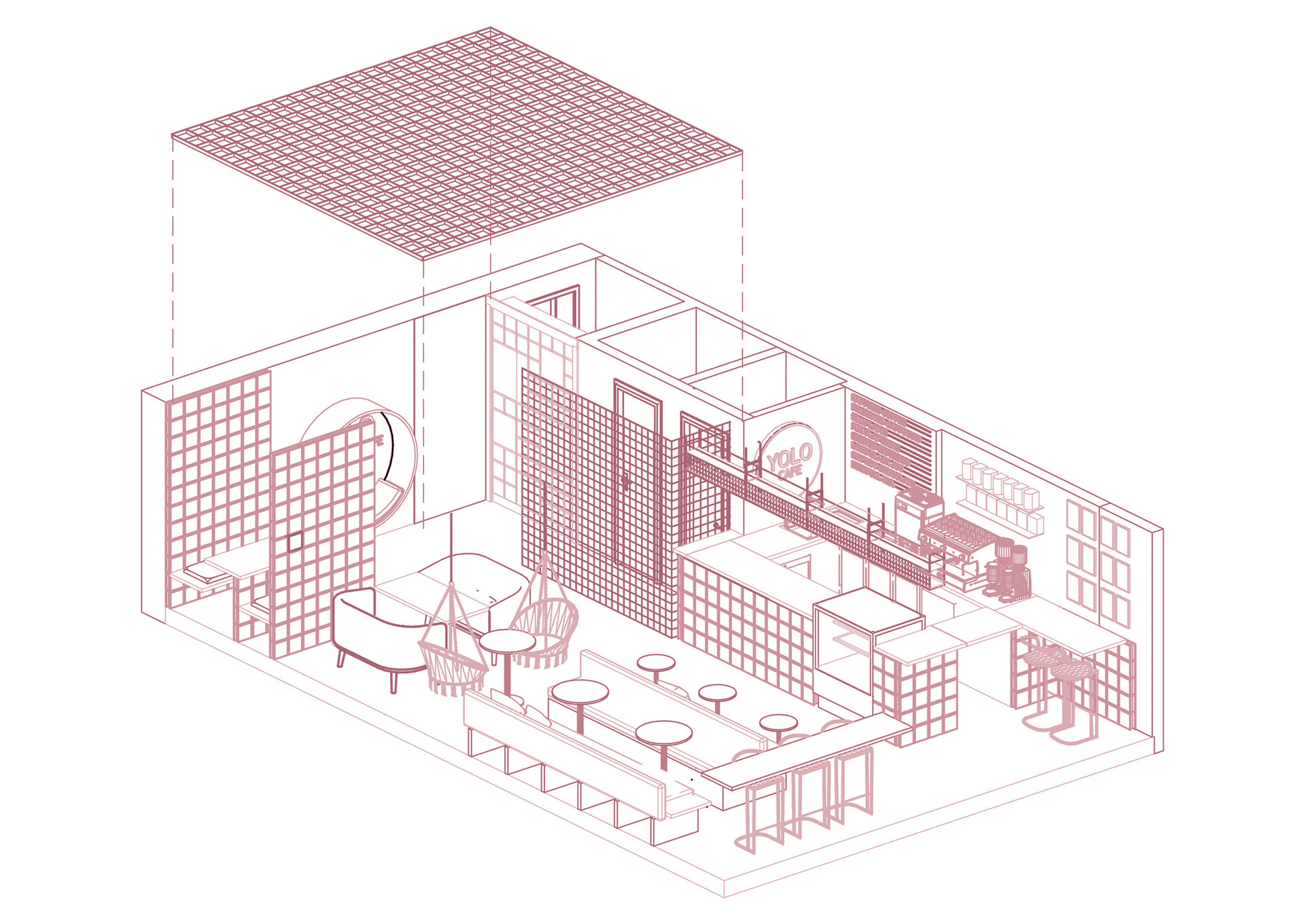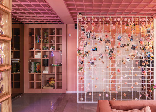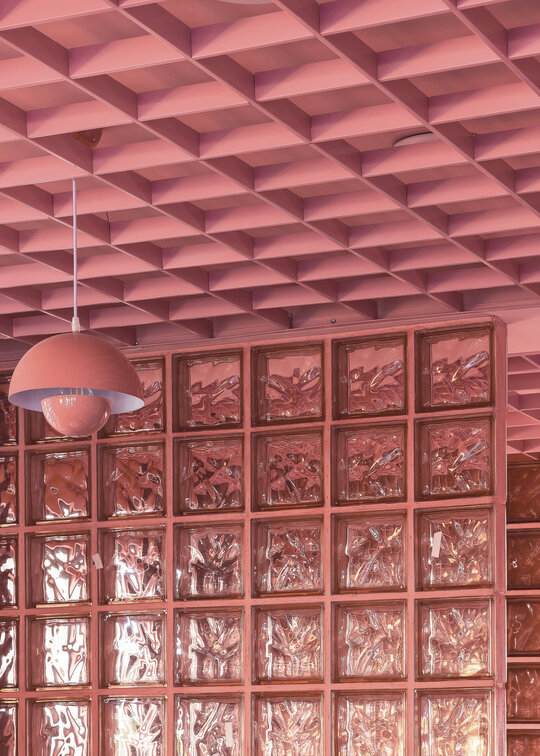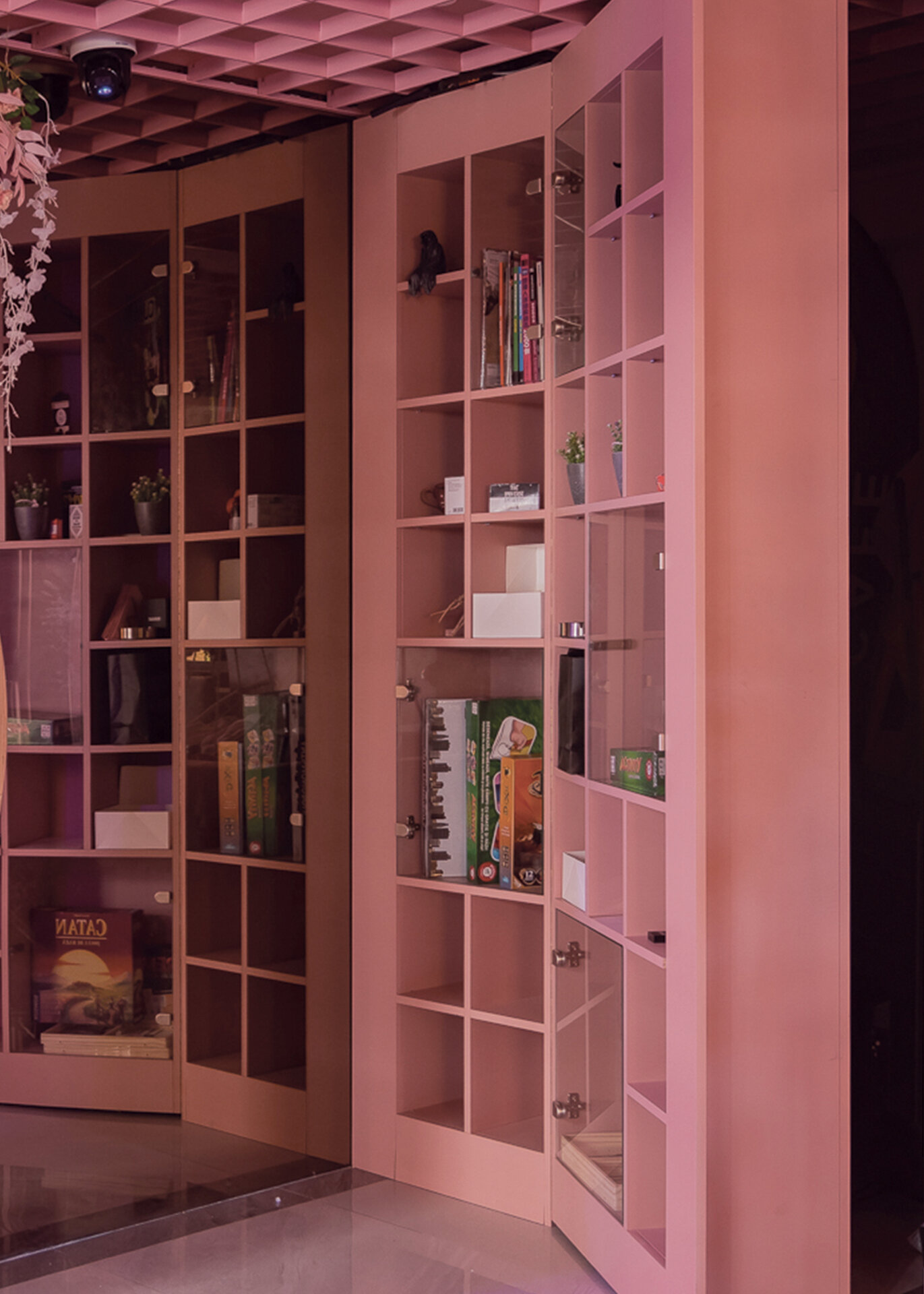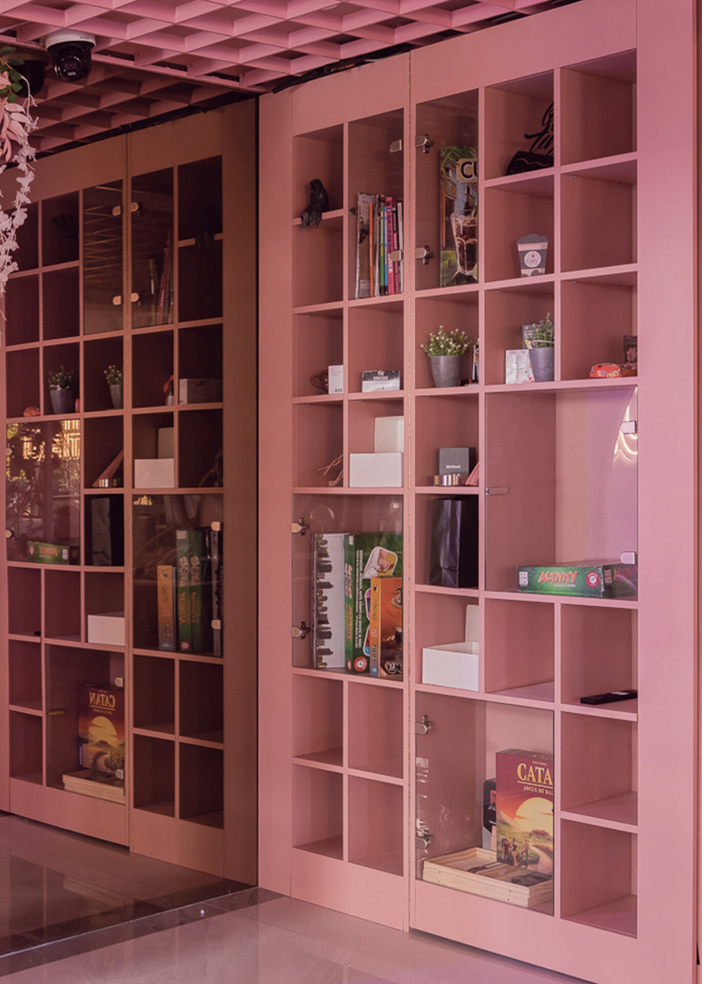 La nivelul plafonului, grilajul decorativ roz generează un ritm vizual și ordonează spațiul, delimitând zona de servire a cafelei de cea dedicată boardgames-urilor – aceasta din urmă fiind închisă cu pereți din cărămidă de sticlă pentru a spori intimitatea. De asemenea, această zonă este deschisă direct către o ușă secretă, mascată de dulapul cu jocuri. Panoul foto din plasă sudată îndeplinește un rol dublu: maschează într-un mod discret accesul către grupurile sanitare, în timp ce accentuează regularitatea gridului, consolidând astfel laitmotivul designului.