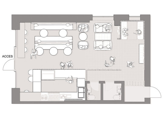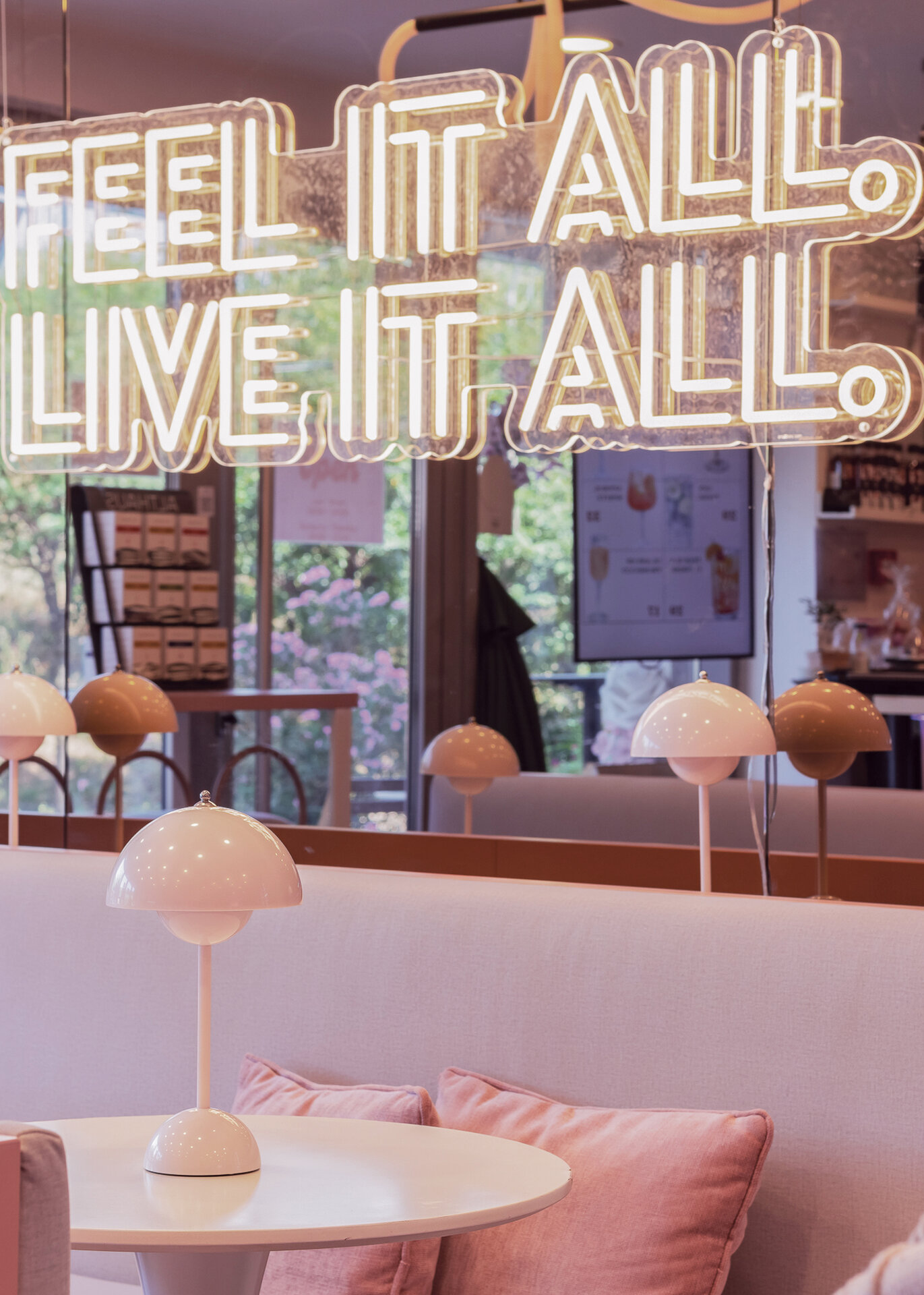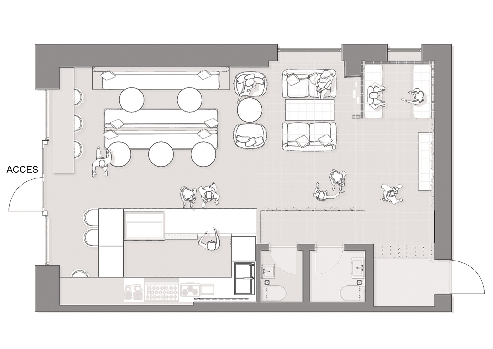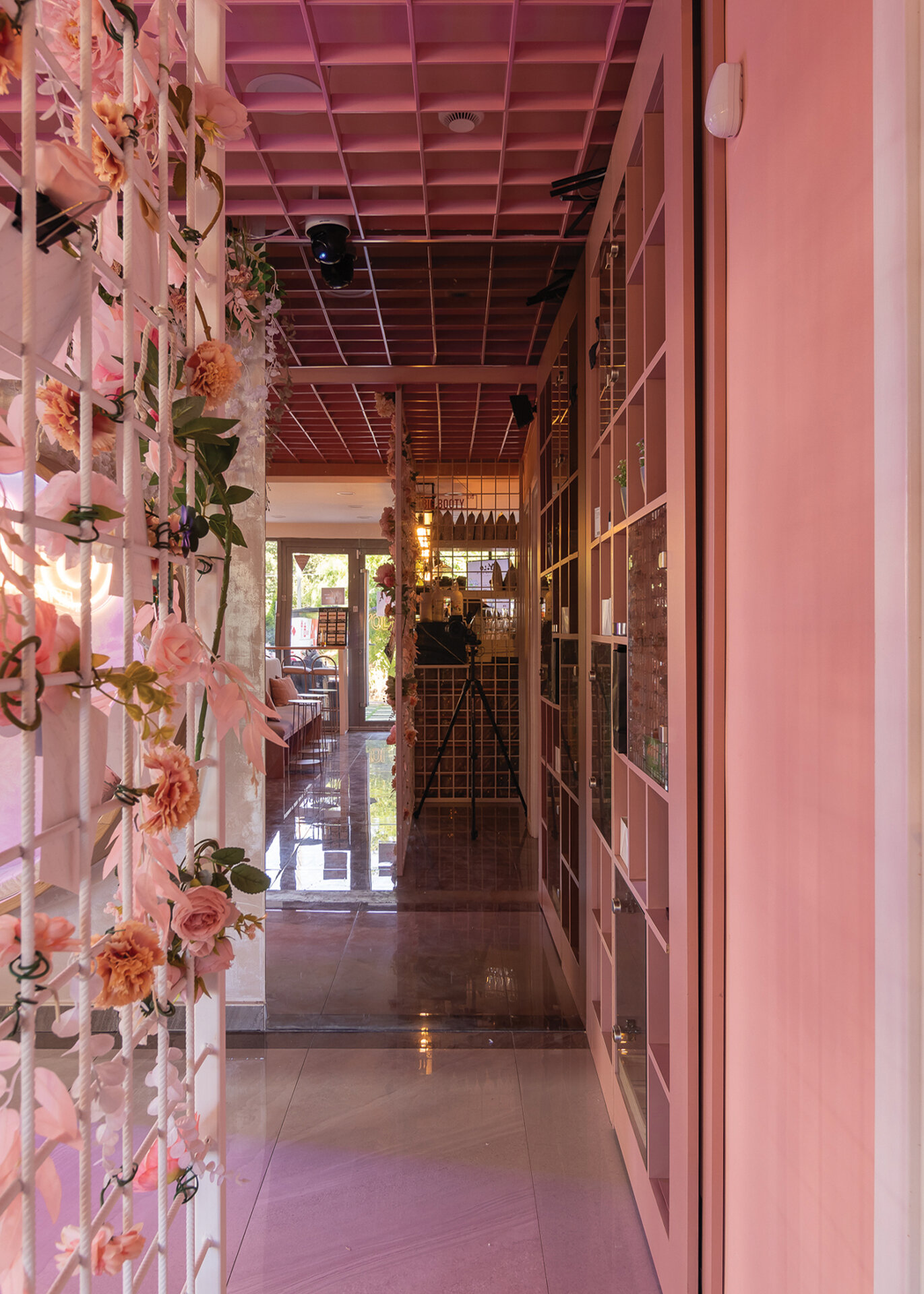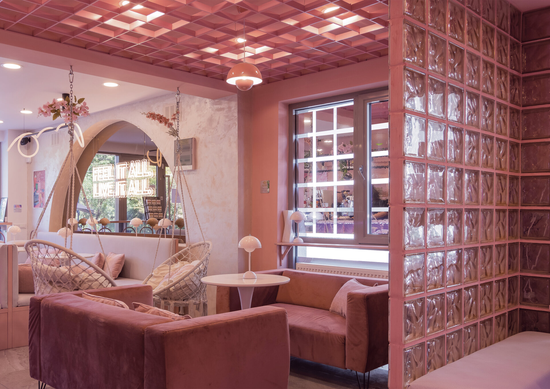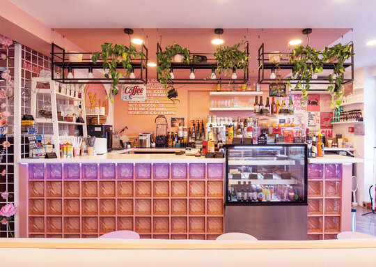 La nivelul plafonului, grilajul decorativ roz generează un ritm vizual și ordonează spațiul, delimitând zona de servire a cafelei de cea dedicată boardgames-urilor – aceasta din urmă fiind închisă cu pereți din cărămidă de sticlă pentru a spori intimitatea. De asemenea, această zonă este deschisă direct către o ușă secretă, mascată de dulapul cu jocuri. Panoul foto din plasă sudată îndeplinește un rol dublu: maschează într-un mod discret accesul către grupurile sanitare, în timp ce accentuează regularitatea gridului, consolidând astfel laitmotivul designului.