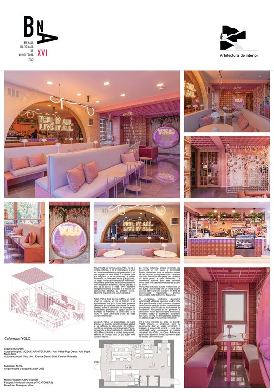 Cafeneaua Yolo se conturează ,,altfel’’: nu ca o simplă cafenea, ci ca o materializare a unui vis care transcende timpul și generațiile. El își are originea în visul Ioanei - o tânără care și-a imaginat un loc al comunității, al cafelei artizanale, al produselor locale și al jocurilor, un spațiu vibrant și catalizator al comunității. Plecarea ei prematură din această lume a transformat visul său într-o moștenire simbolică, pe care tatăl său a ales să o aducă la viață. Într-o abordare intergenerațională, proiectul s-a născut din colaborarea acestuia cu prietenii Ioanei, devenind expresia unei viziuni colective. Abordarea ludică și plină de energie a tinerilor, în procesul de proiectare a spațiului, combinată cu viziunea orientată spre confort și calitate a tatălui Ioanei, a condus la crearea unui loc unitar, în care oricine intră are o stare de bine.