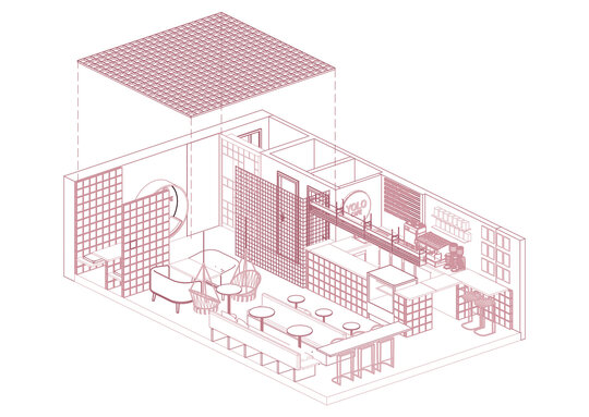 Designul Yolo se organizează pe baza gridului, un laitmotiv care structurează spațiul și se reflectă în elementele de mobilier, menite să genereze coerență vizuală. Pereții, paravanele și barul, realizate din cărămidă de sticlă, filtrează lumina și conferă transparență, definind în același timp un joc subtil între vizibil și ascuns.