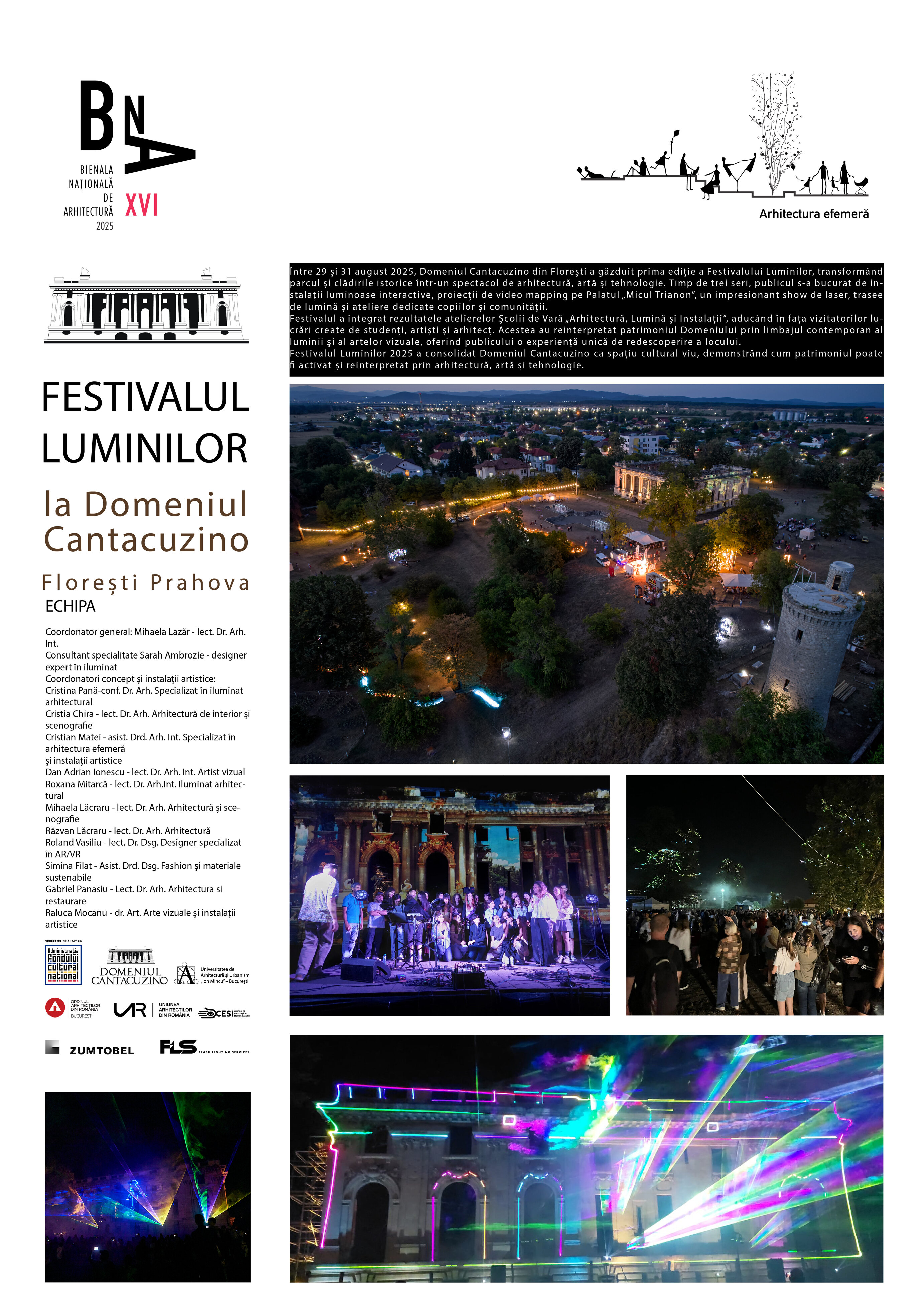 Între 29 și 31 august 2025, Domeniul Cantacuzino din Florești s-a transformat într-un spațiu deschis de explorare, cercetare și experiment, găzduind prima ediție a Festivalului Luminilor. Evenimentul a propus o reinterpretare a patrimoniului istoric prin mijloace efemere – instalații de lumină, video mapping, show-uri multimedia, lasere și trasee interactive – creând o scenografie temporară în care arhitectura, arta și tehnologia s-au contopit.