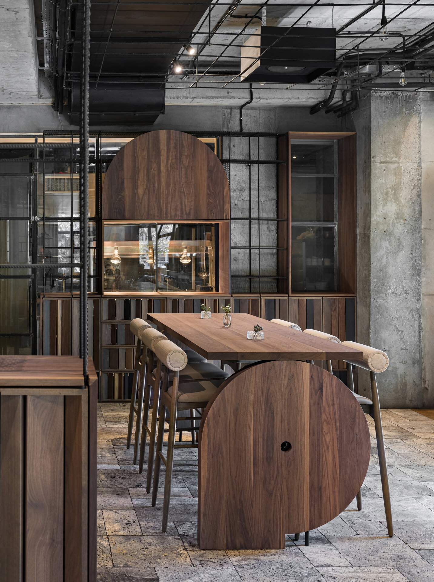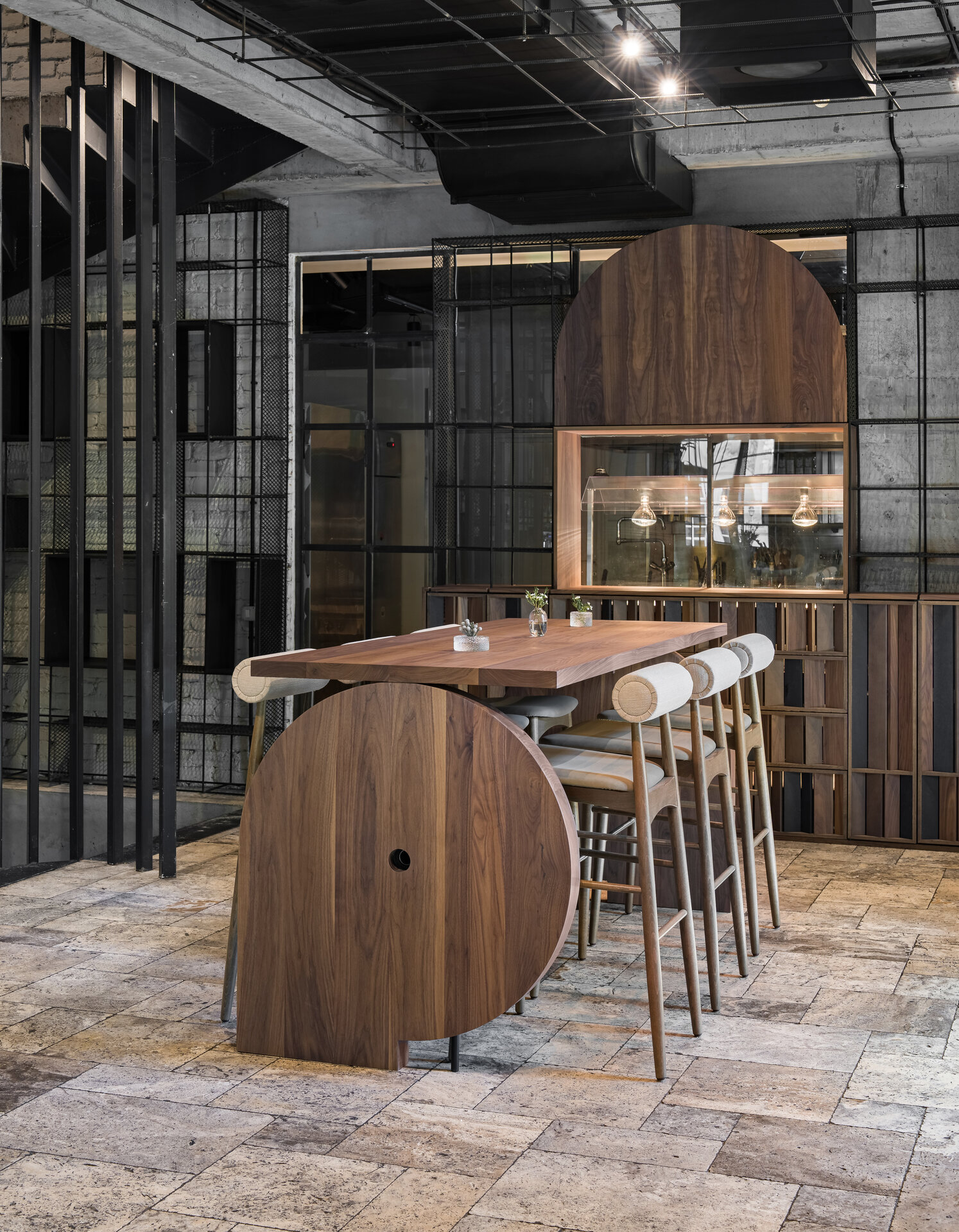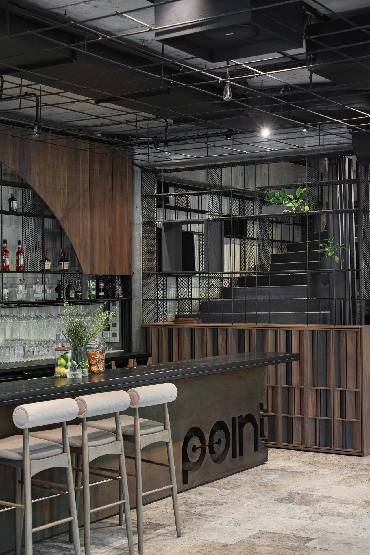 Arhitectura 'altfel' prsupune o arhitectură responsabilă, realizată cu atenție la context și resurse. S-a utilizat lemn de nuc, în contrast cu elementele metalice ‘moștenite’, iar designul barului din corten a fost reinterpretat, păstrându-i-se materialul, ca un liant între culorile și texturile regăsite în întreg spațiul.