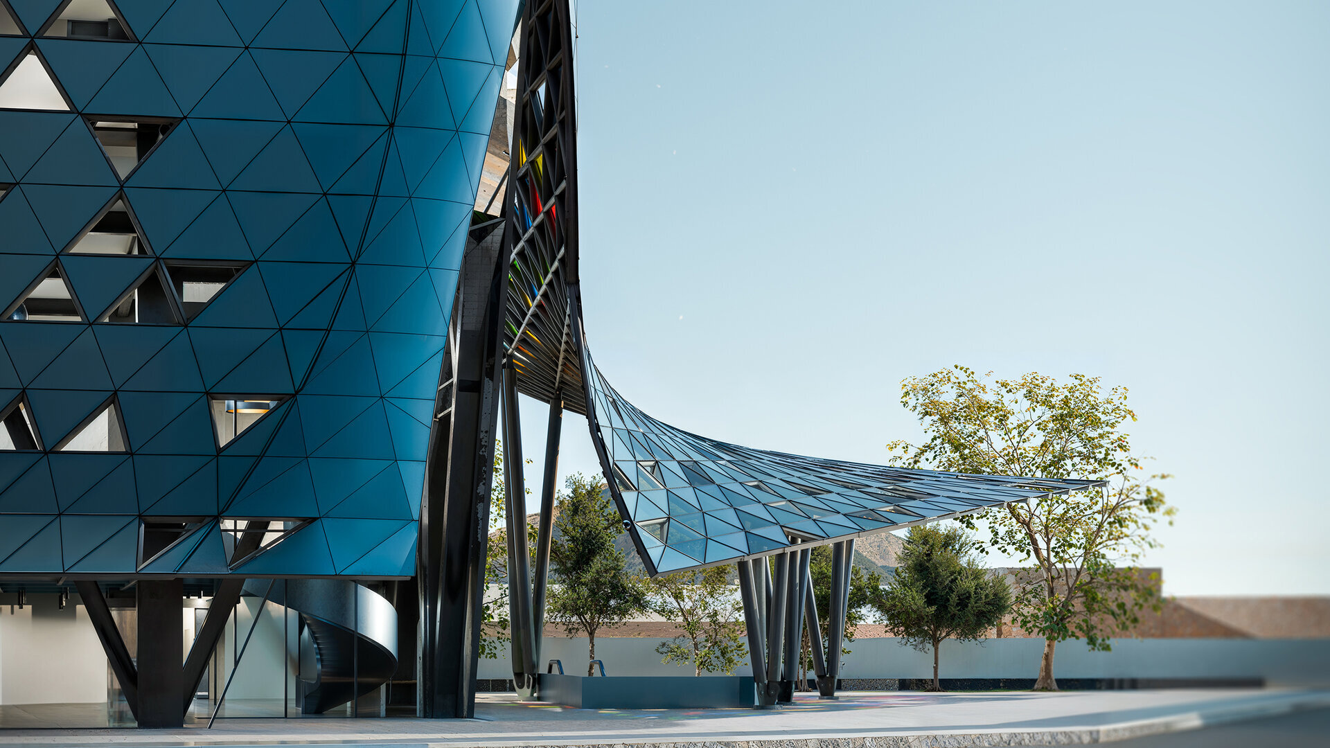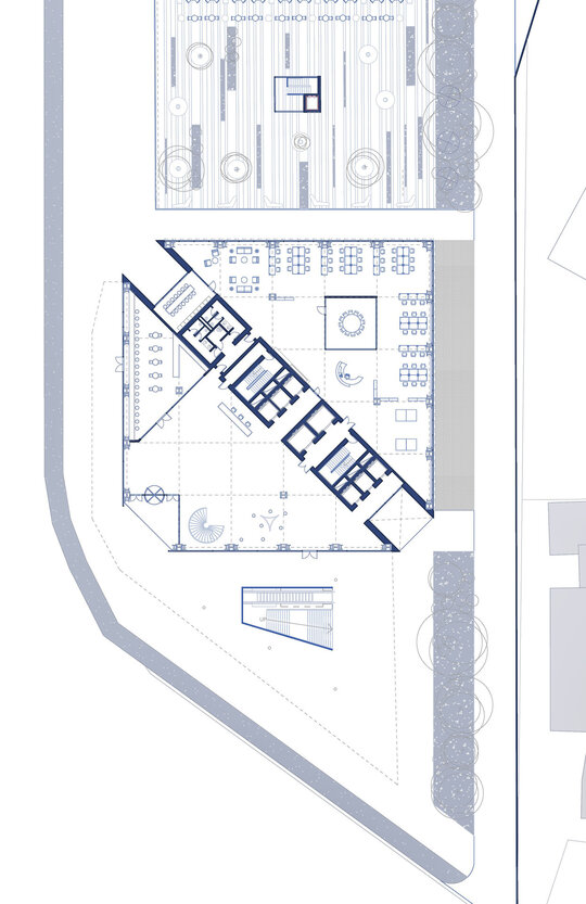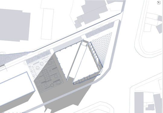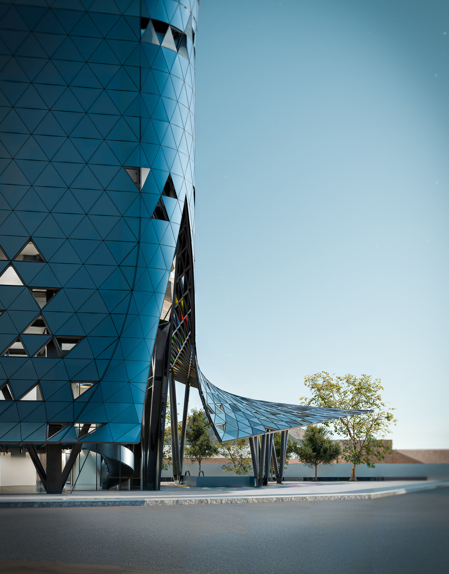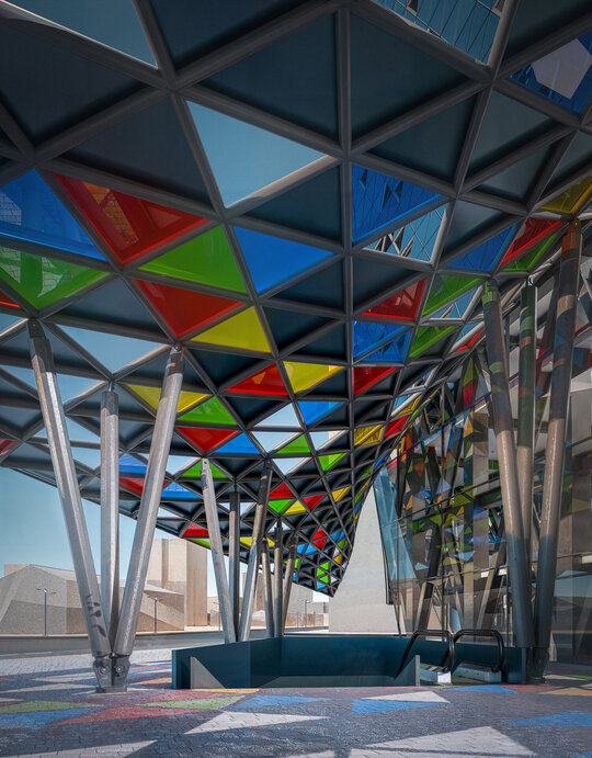 Un element esențial în definirea relației dintre clădire și oraș este copertina – un „skin” colorat, care pornește de pe fațadă și se extinde peste trotuar, marcând accesul în clădire și în același timp protejând ieșirea de metrou. Această intervenție generează un spațiu public intermediar, activ, care transformă infrastructura într-o prezență urbană vizibilă și prietenoasă.
