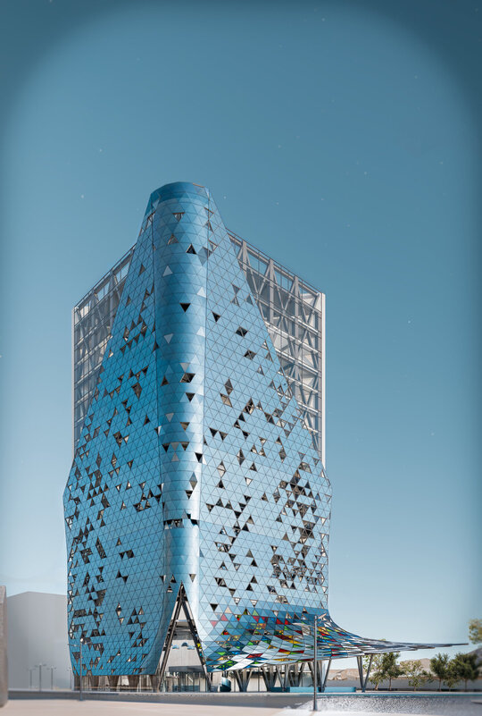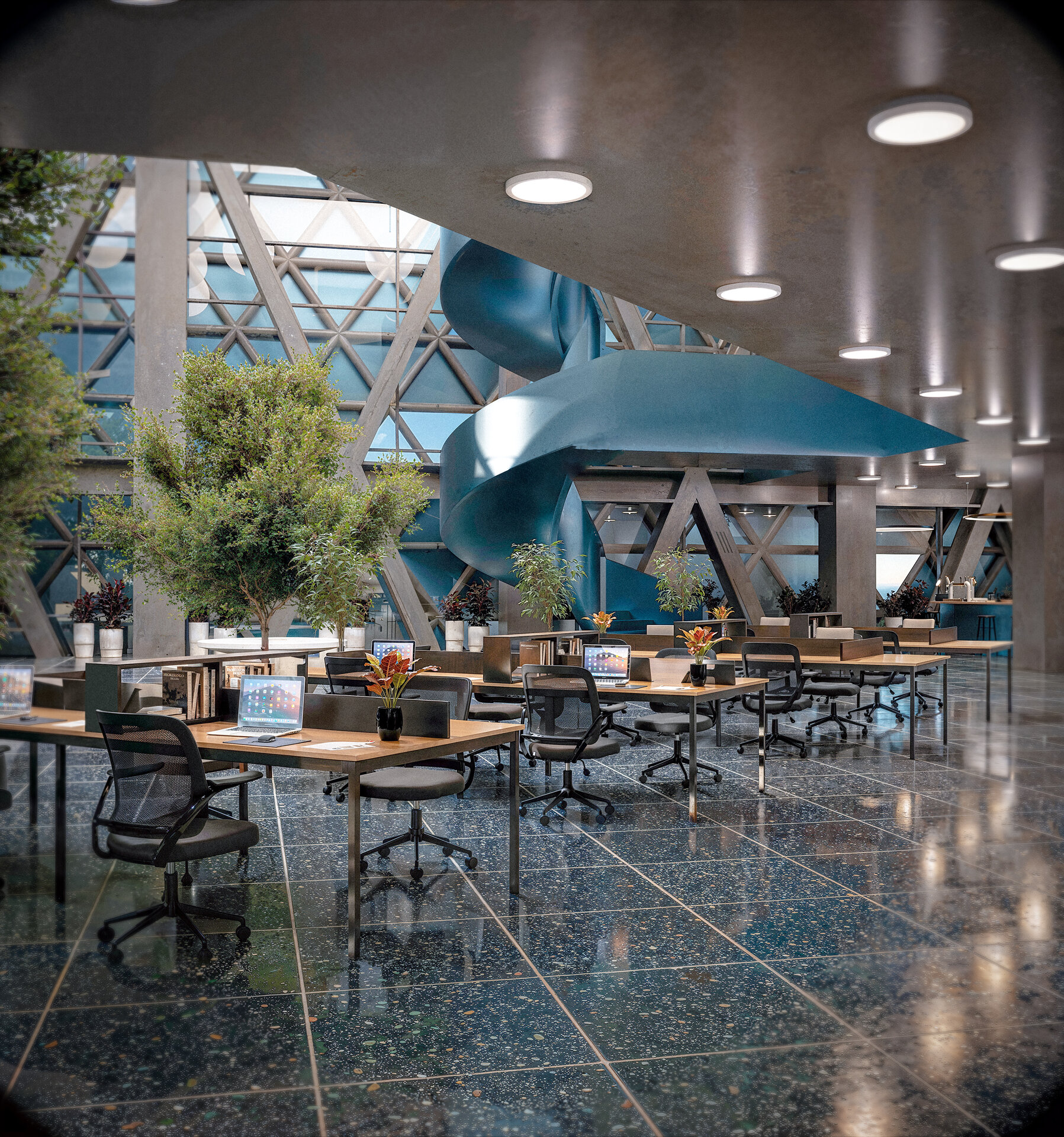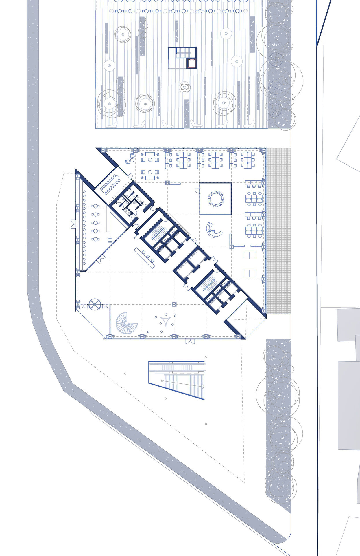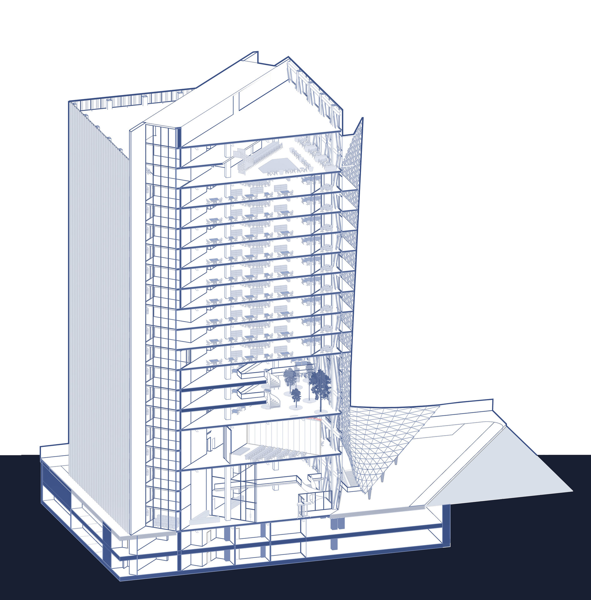 Volumetria este articulată în două corpuri principale, conectate la nivelul subsolului și parterului. Triunghiul din spate este dedicat zonelor de birouri, de la parter până la penultimul etaj, cu spații flexibile, care pot acomoda echipe de dimensiuni variabile. Triunghiul din față e destinat funcțiunilor publice și se dezvoltă pe verticală: la parter regăsim zona de recepție și o cafenea deschisă spre spațiul urban, la etajul 1 o zonă pentru conferințe și evenimente, iar la nivelul următor o grădină interioară și spații de coworking. Ultimul nivel al acestui volum este dedicat unui restaurant cu deschidere panoramică.