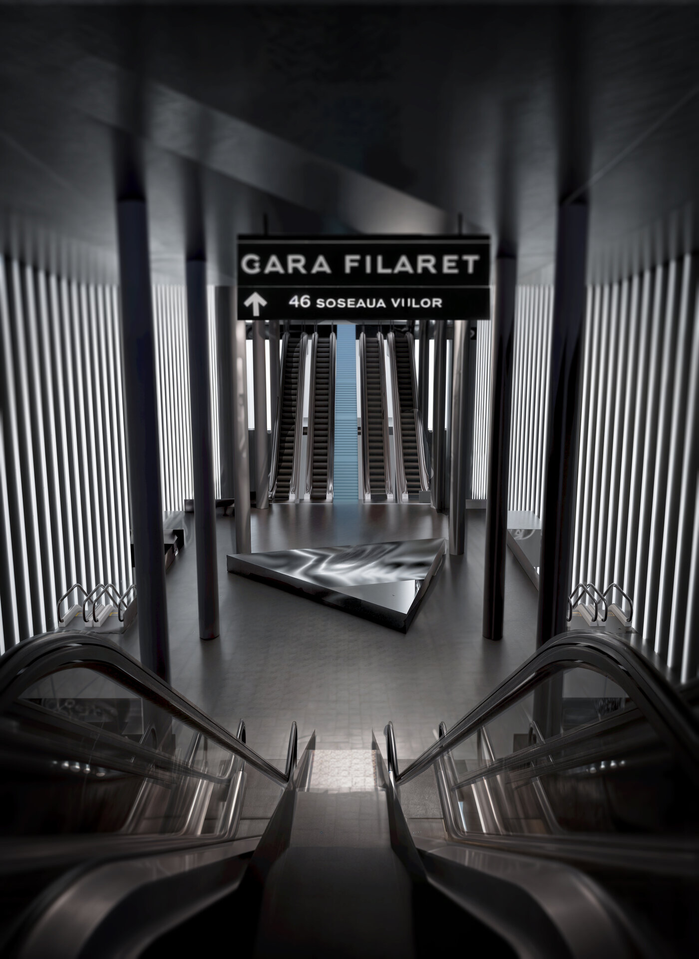 În completarea acestui exercițiu, s-a propus și o variantă conceptuală pentru amenajarea stației de metrou. Propunerea caută să aducă lumină, ritm și orientare clară într-un spațiu subteran care, de cele mai multe ori, rămâne pur funcțional. S-a mizat pe o imagine puternică, în care jocul de lumină și repetiția verticală creează o atmosferă clară și coerentă, cu o identitate proprie.