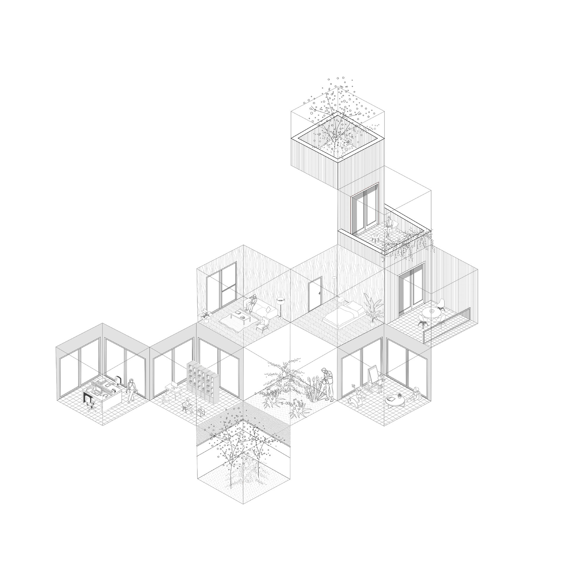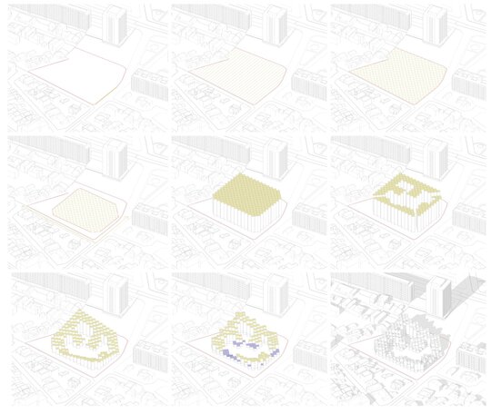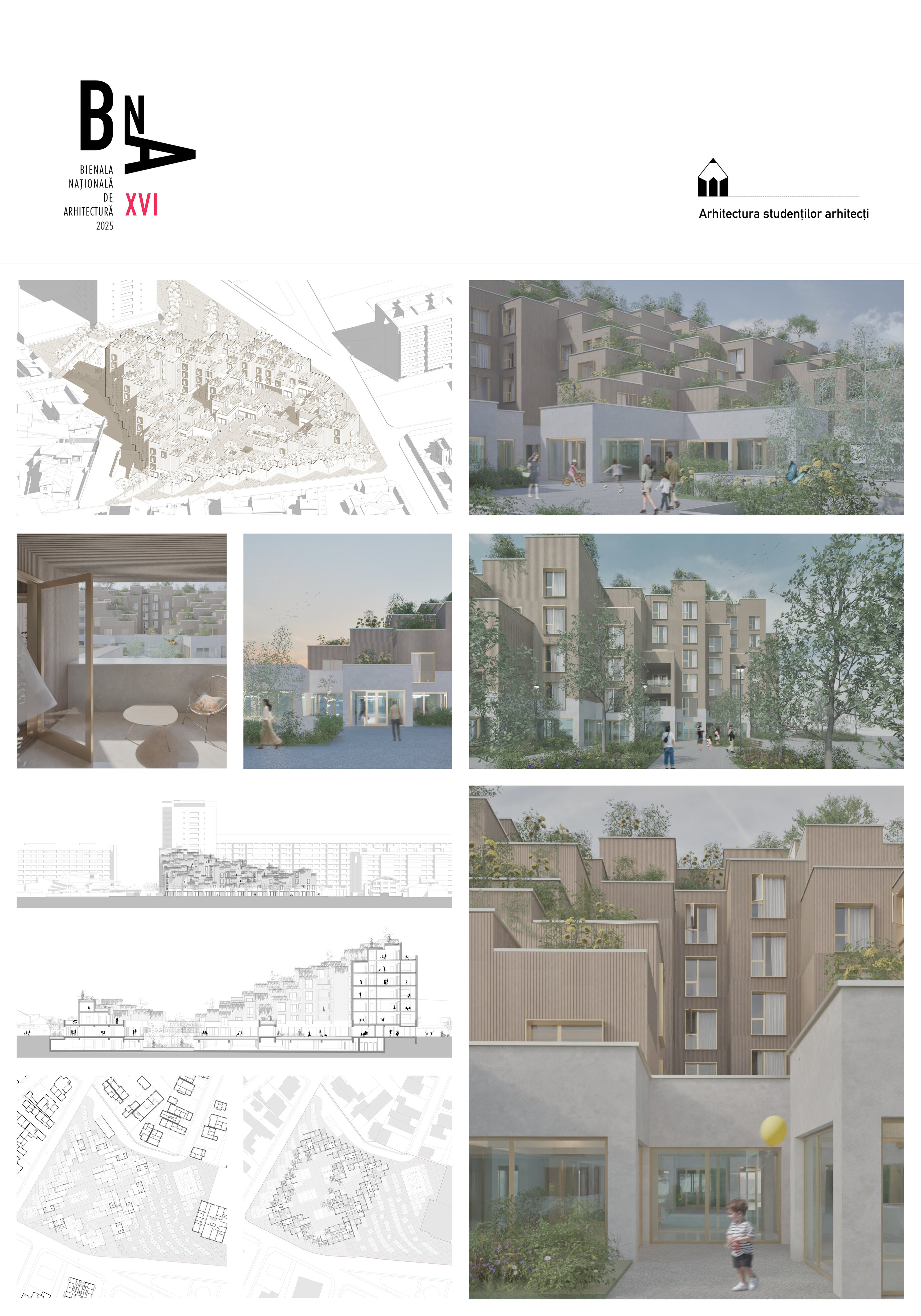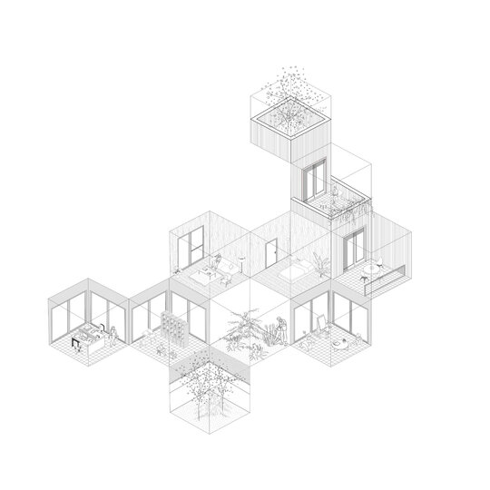 Ansamblul de locuințe este conceput ca un volum ce descrește în trepte si se revarsă în curțile interioare, format din module replicate asemenea elementelor din natură.