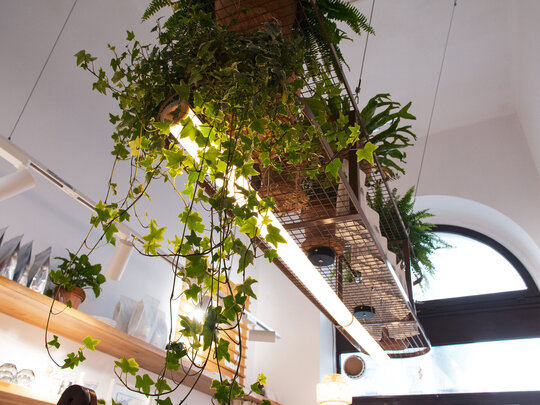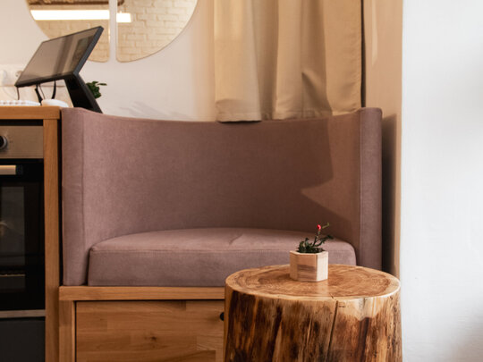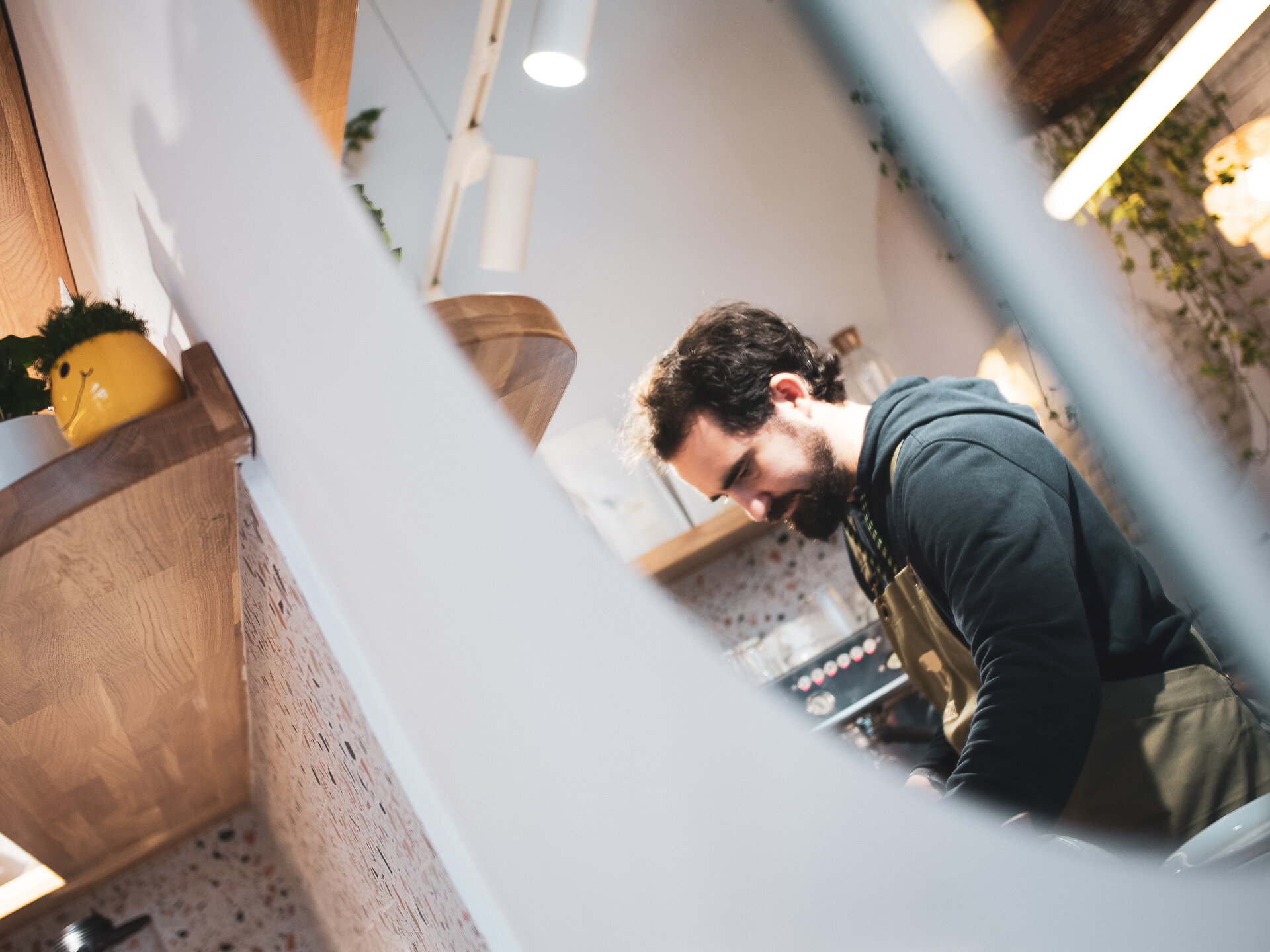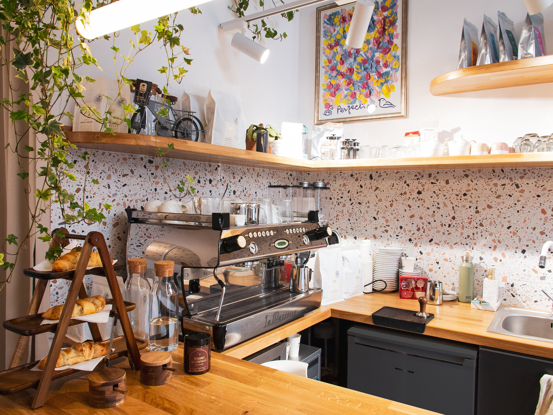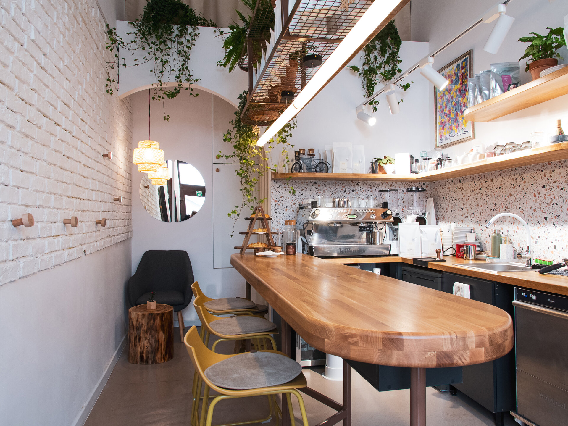 Atmosfera a fost conturată de personalitatea proprietarului. Preferința pentru cromatica luminoasă, mult lemn și vegetație abundentă a definit limbajul estetic. Plantele curg peste rafturi și îmblânzesc tranzițiile, transformând interiorul restrâns într-un refugiu proaspăt și vibrant. Paleta cromatică accentuează deschiderea și reflectă caracterul prietenos al baristei.