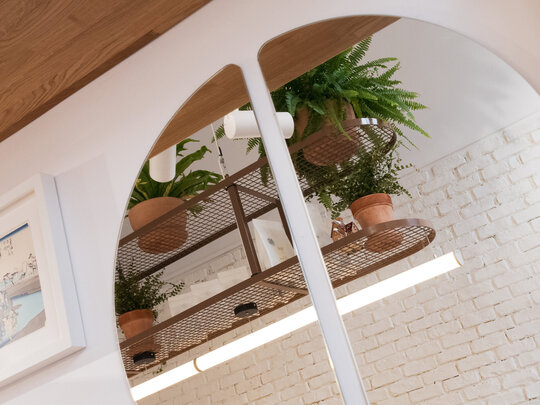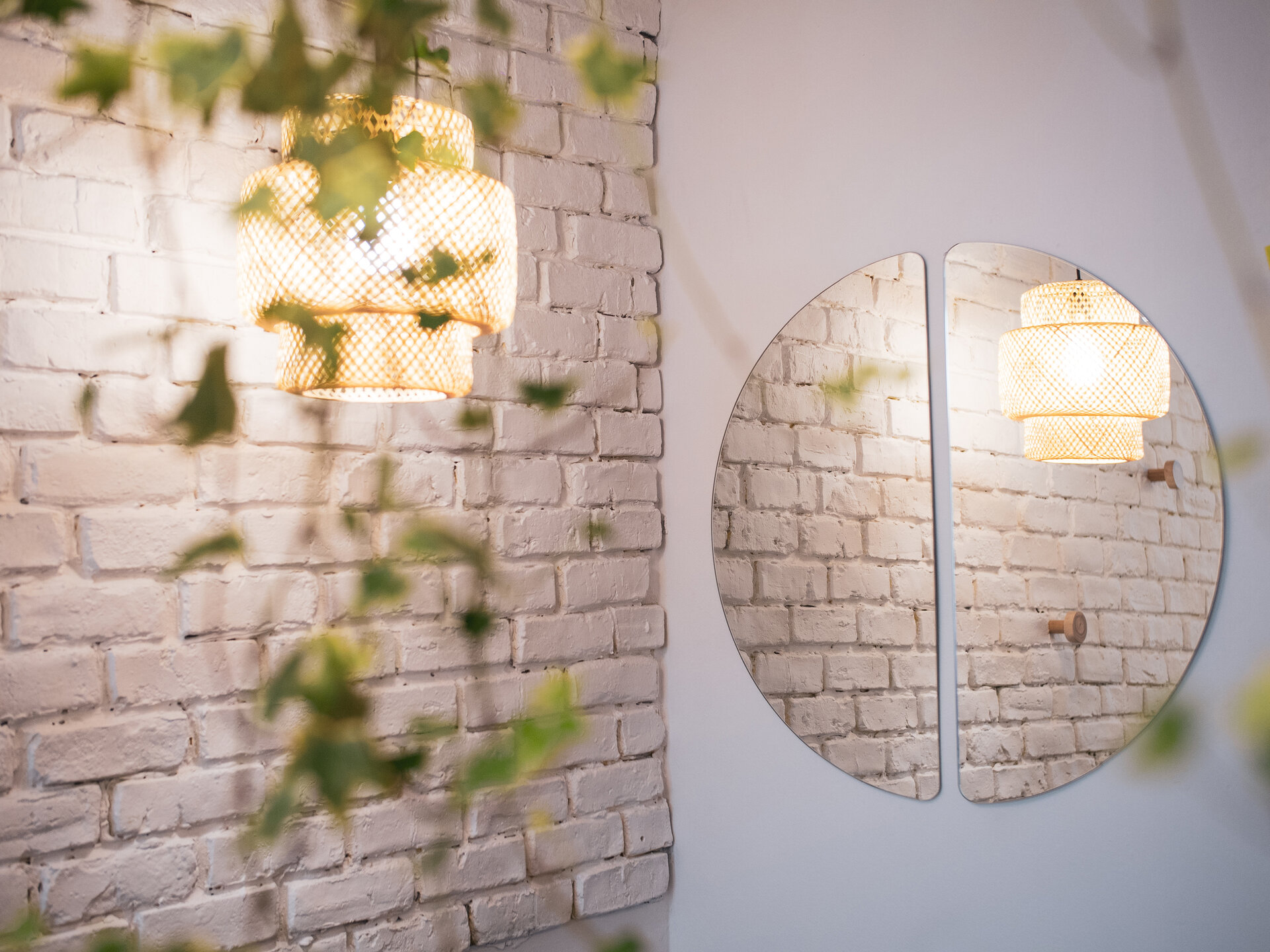 O dimensiune jucăușă și distinctivă este adăugată de oglinzi. Inspirat de pasiunea proprietarului pentru selfie-uri în oglinzi neobișnuite, designul integrează oglinzi în forma abstractă a boabelor de cafea. Dincolo de rolul decorativ, acestea extind percepția spațiului, multiplică lumina și vegetația și oferă clienților momente de descoperire personală. Totodată, funcționează ca instrumente subtile de promovare: formele lor atrag selfie-uri, transformând vizitatorii în ambasadori informali ai cafenelei.