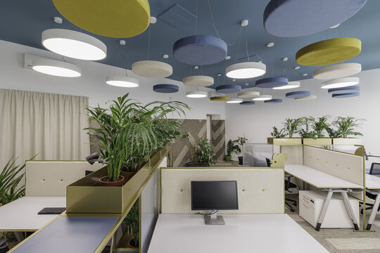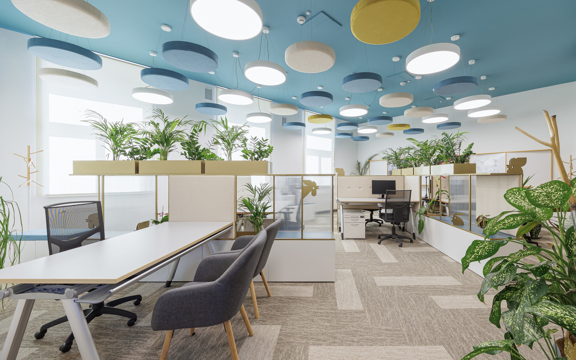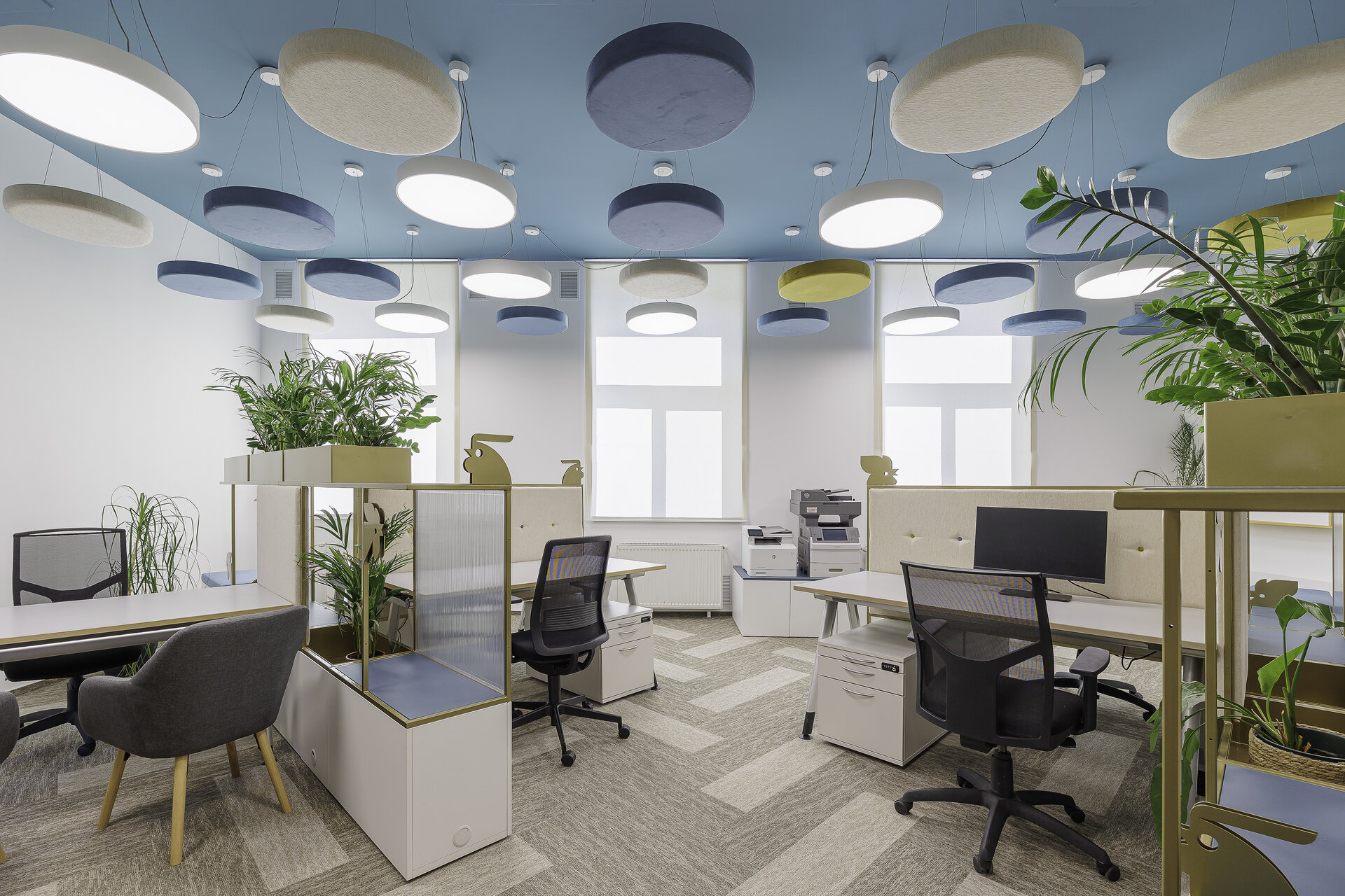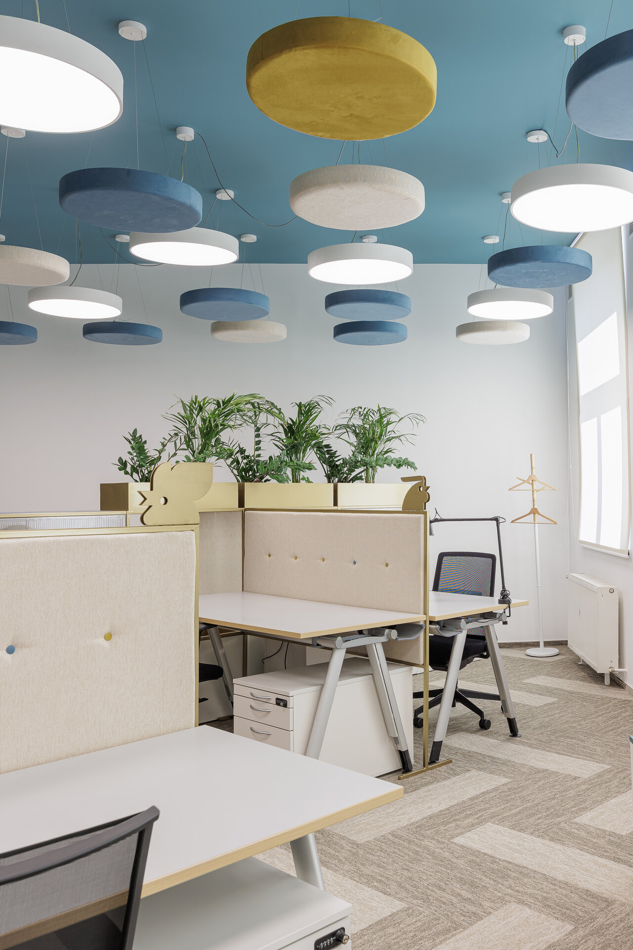 În spațiul deschis, posturile de lucru sunt dispuse astfel încât să maximizeze lumina naturală și circulația, menținând totodată concentrare și intimitate. Divizoarele funcționale și panourile acustice structurează spațiul, absorb zgomotul ambiental și sporesc confortul fără a-l închide complet, creând zone care echilibrează concentrarea individuală cu interacțiunea colaborativă.