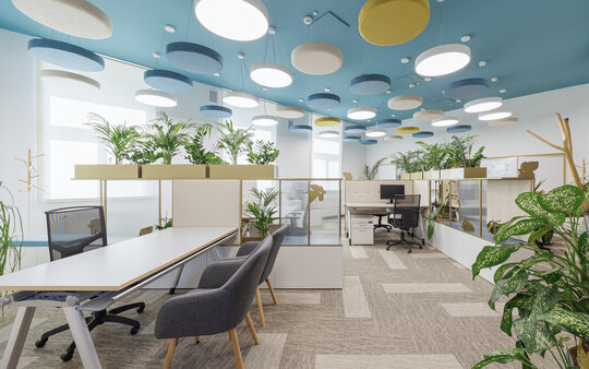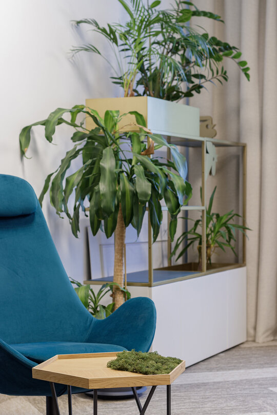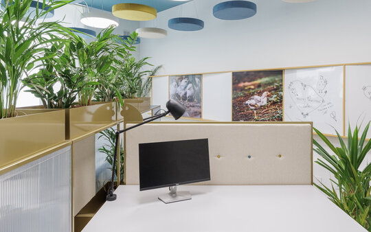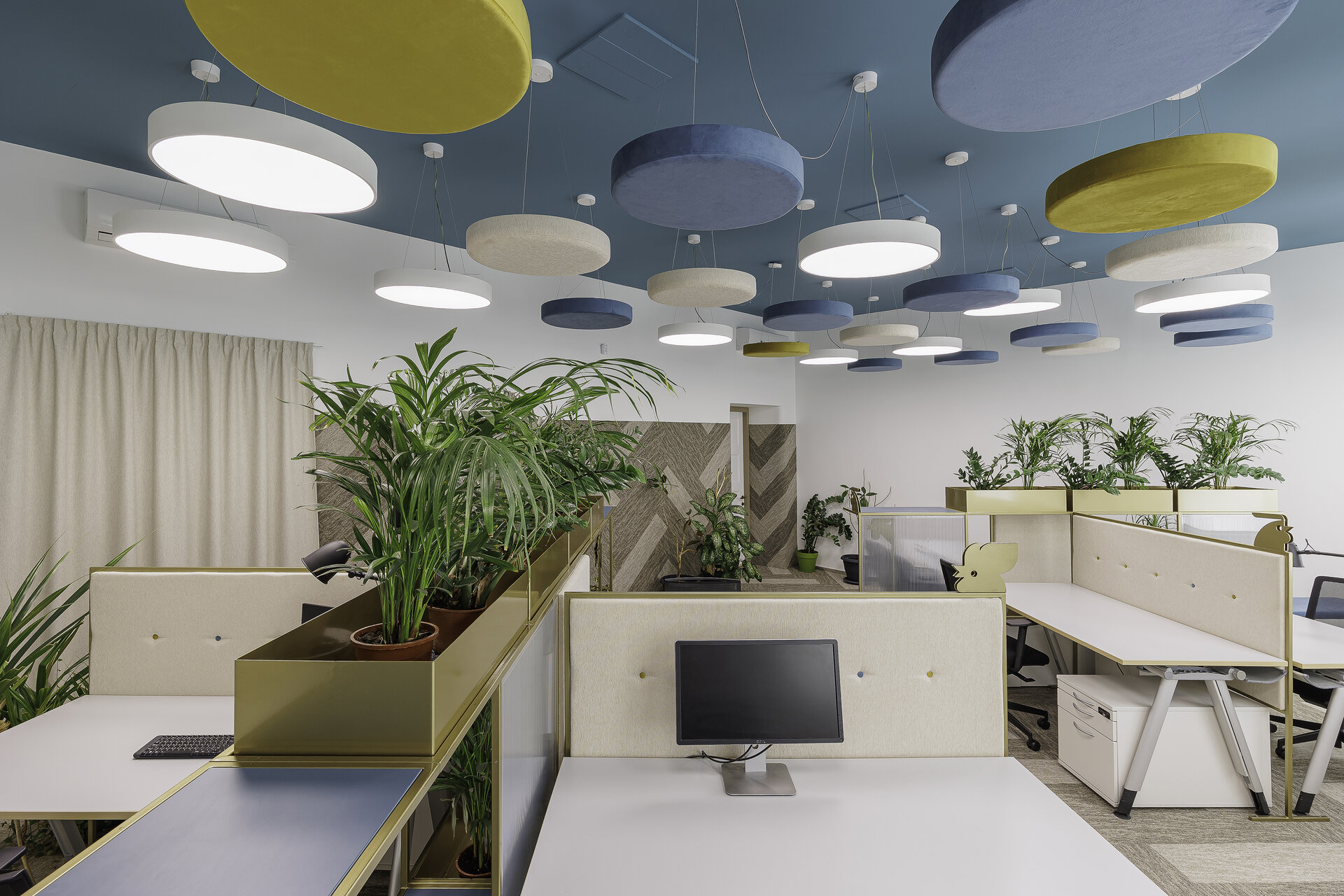 Plantele acționează de asemenea ca amortizoare vizuale și acustice, atenuând geometria spațiului și stabilind o legătură cu natura. Ele oferă o referință subtilă către domeniul de activitate al companiei, creează un ritm organic și contribuie la o atmosferă confortabilă, vie și stimulativă.