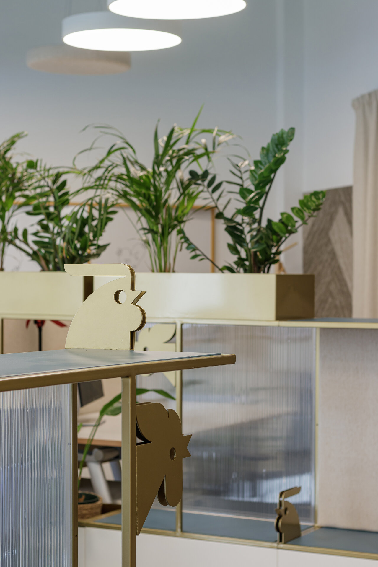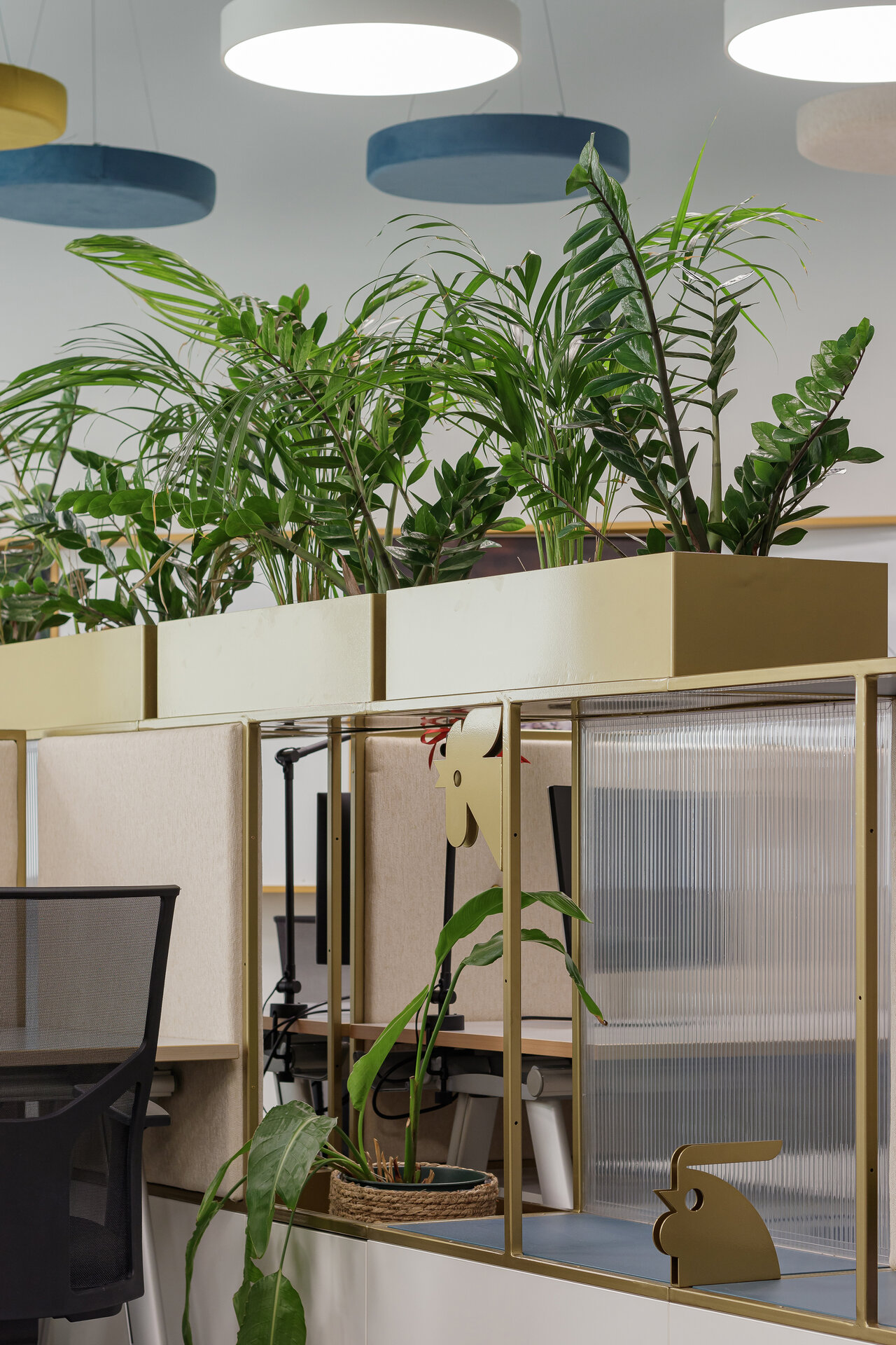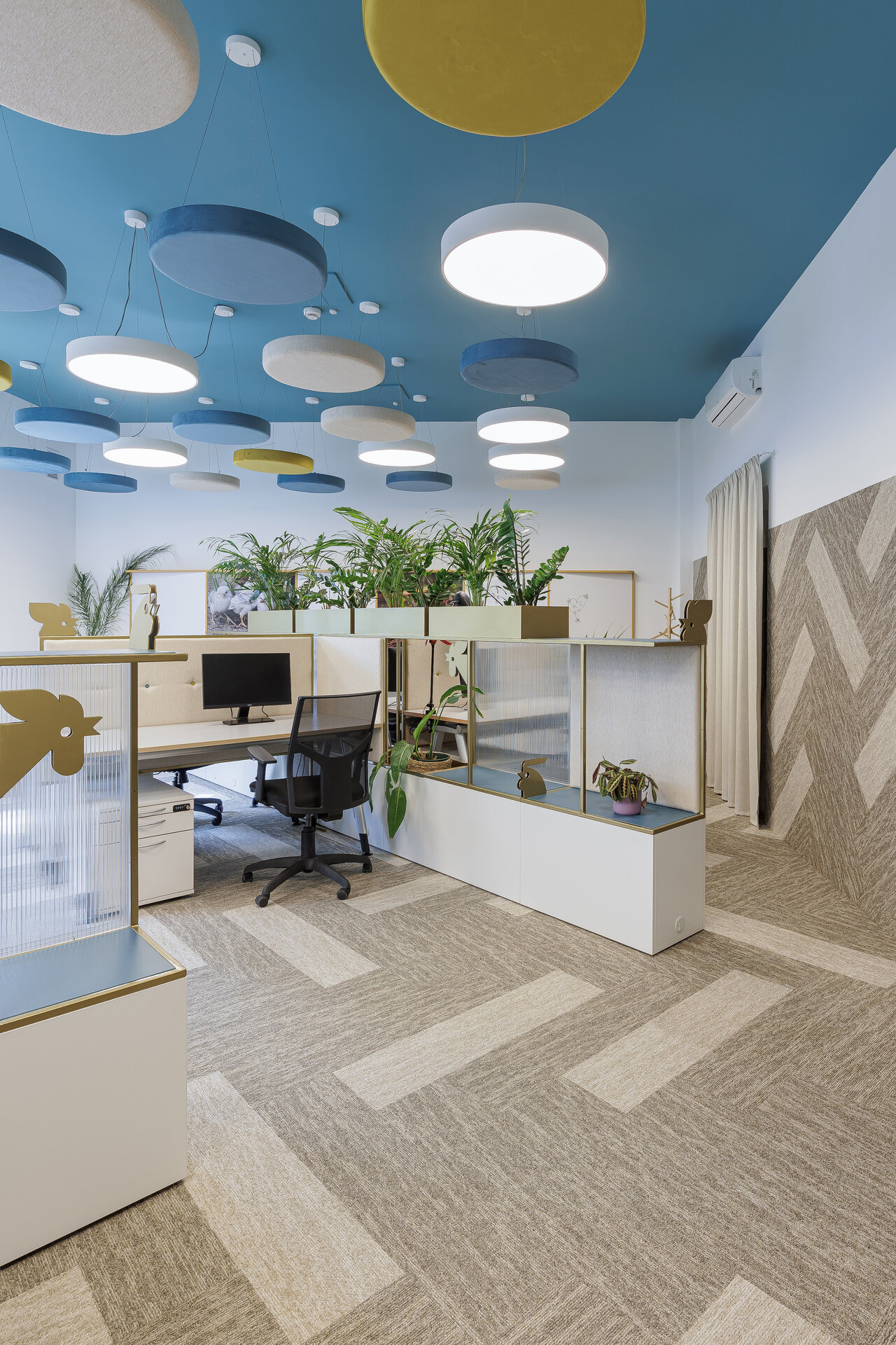 Turcoazul, culoarea dominantă a brandului, asigură ierarhia vizuală și continuitatea în întregul birou, oferind prospețime și identitate. Alama apare subtil, ca accent, adăugând rafinament și eleganță fără a domina paletarul. Sistemul personalizat de mobilier completează acestă logică cromatică: cadre metalice subțiri combinate cu corpuri din lemn creează o compoziție stratificată și versatilă. Nivelul inferior oferă depozitare și locuri ocazionale pentru colaborare, nivelul median include rafturi, divizoare acustice și panouri translucide care estompează conexiunile vizuale, menținând în același timp linii de vedere controlate, iar nivelul superior găzduiește jardiniere generoase cu vegetație abundentă. Această organizare verticală sporește intimitatea, transparența și prezența elementelor naturale, creând o experiență spațială bogată și stratificată.