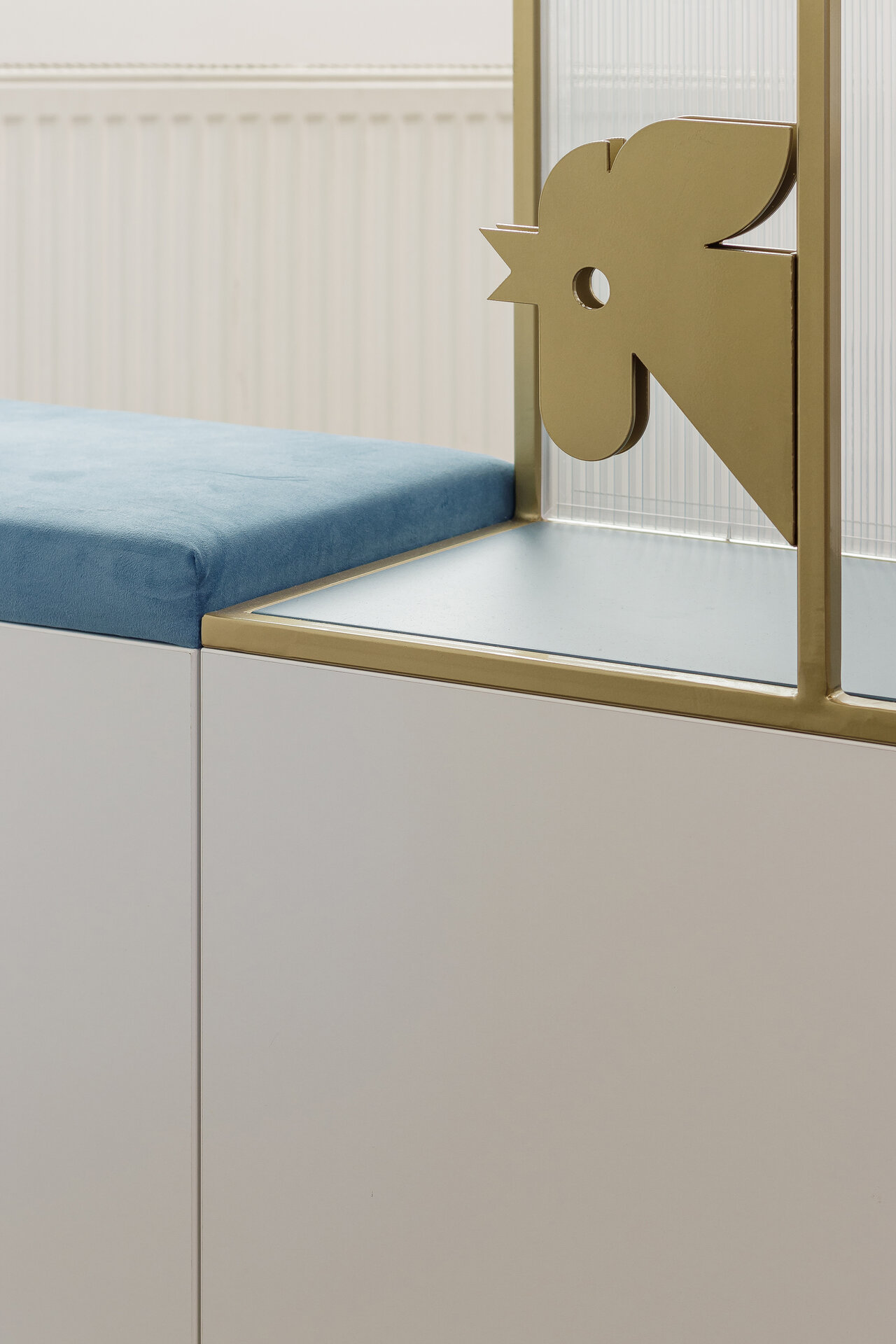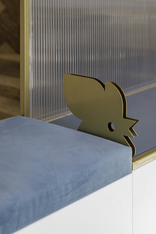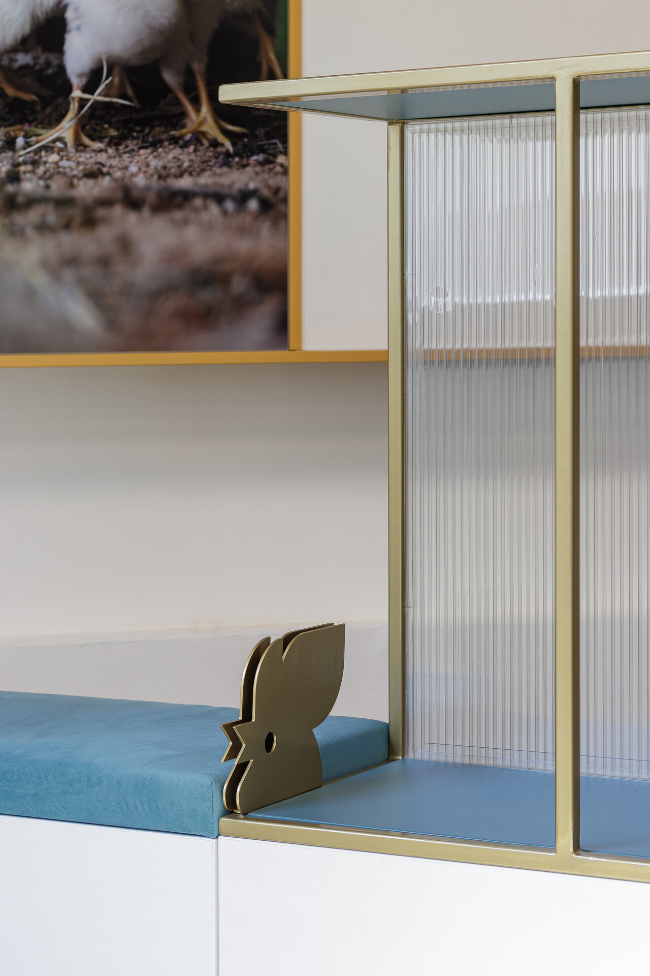 Turcoazul, culoarea dominantă a brandului, asigură ierarhia vizuală și continuitatea în întregul birou, oferind prospețime și identitate. Alama apare subtil, ca accent, adăugând rafinament și eleganță fără a domina paletarul. Sistemul personalizat de mobilier completează acestă logică cromatică: cadre metalice subțiri combinate cu corpuri din lemn creează o compoziție stratificată și versatilă. Nivelul inferior oferă depozitare și locuri ocazionale pentru colaborare, nivelul median include rafturi, divizoare acustice și panouri translucide care estompează conexiunile vizuale, menținând în același timp linii de vedere controlate, iar nivelul superior găzduiește jardiniere generoase cu vegetație abundentă. Această organizare verticală sporește intimitatea, transparența și prezența elementelor naturale, creând o experiență spațială bogată și stratificată.