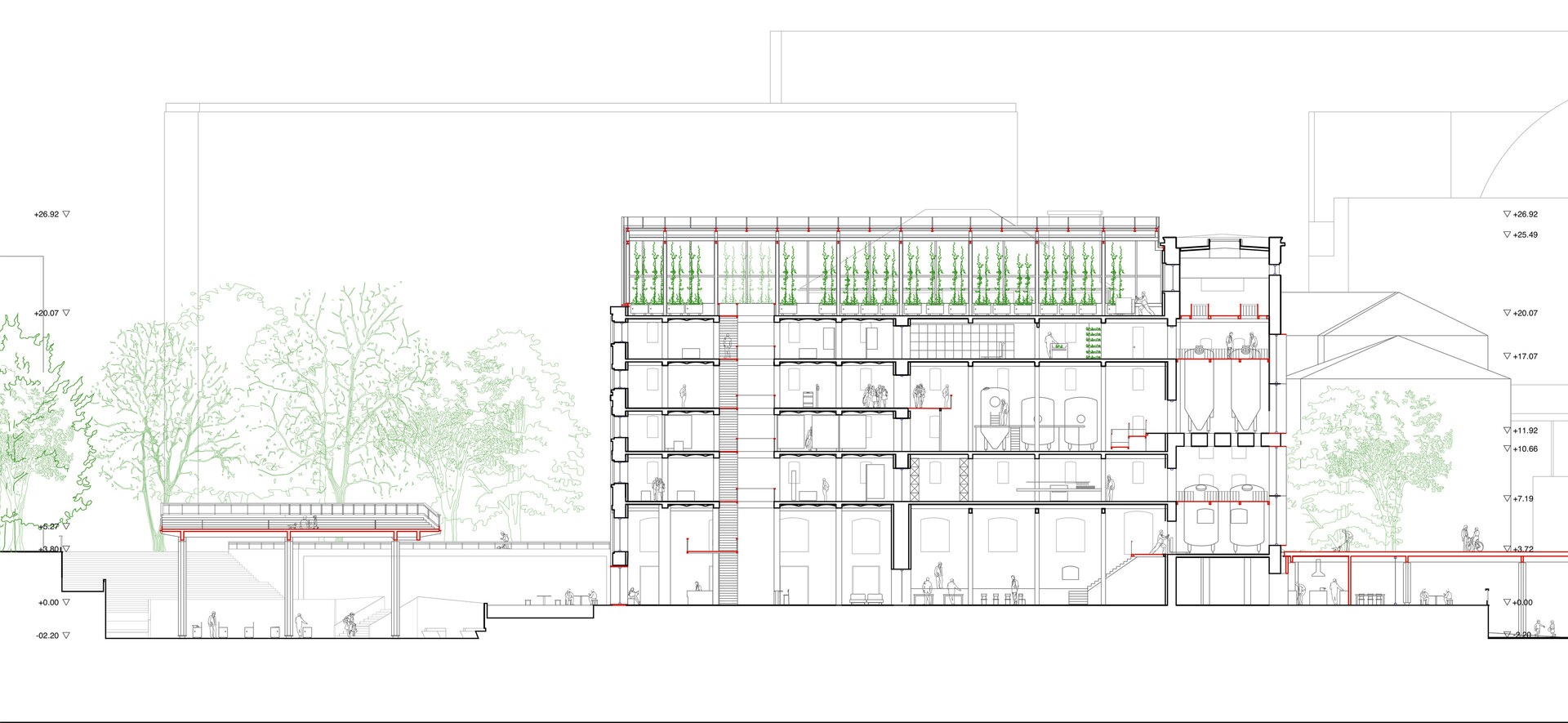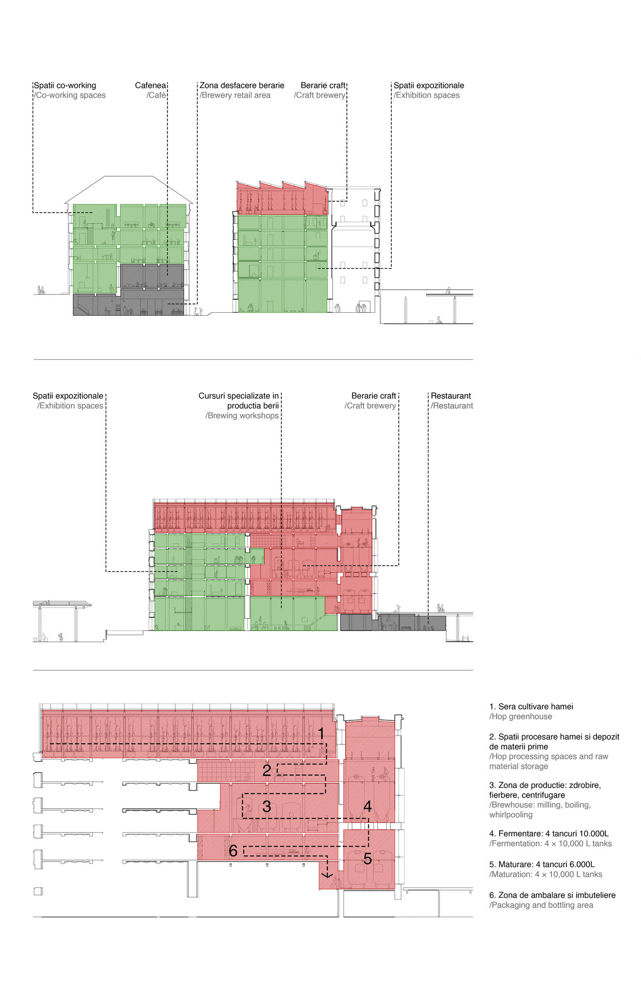Propunerea funcțională adusă prin proiect poate fi împărțită în trei categorii: comercial, educational și agronomic. Dintre acestea, proiectul detaliază polul educational și parțial cel comercial. Cele două corpuri care reprezentau în trecut fierberea și fabrica propriu-zisă datează încă din prima etapă de construcție (1894–1895). Aceste două clădiri recuperate sunt reintegrate în circuitul funcțional și înglobează o fabrică de bere de dimensiuni mici care permite experiențe cu publicul și o zonă de desfacere la parter, spații de co-working, școală culinară, restaurant și o structură exterioară cu multiple posibilități de uz, precum piață volantă, evenimente sau extindere a pieței de răsaduri cu care este conectată.