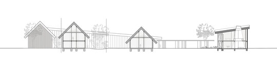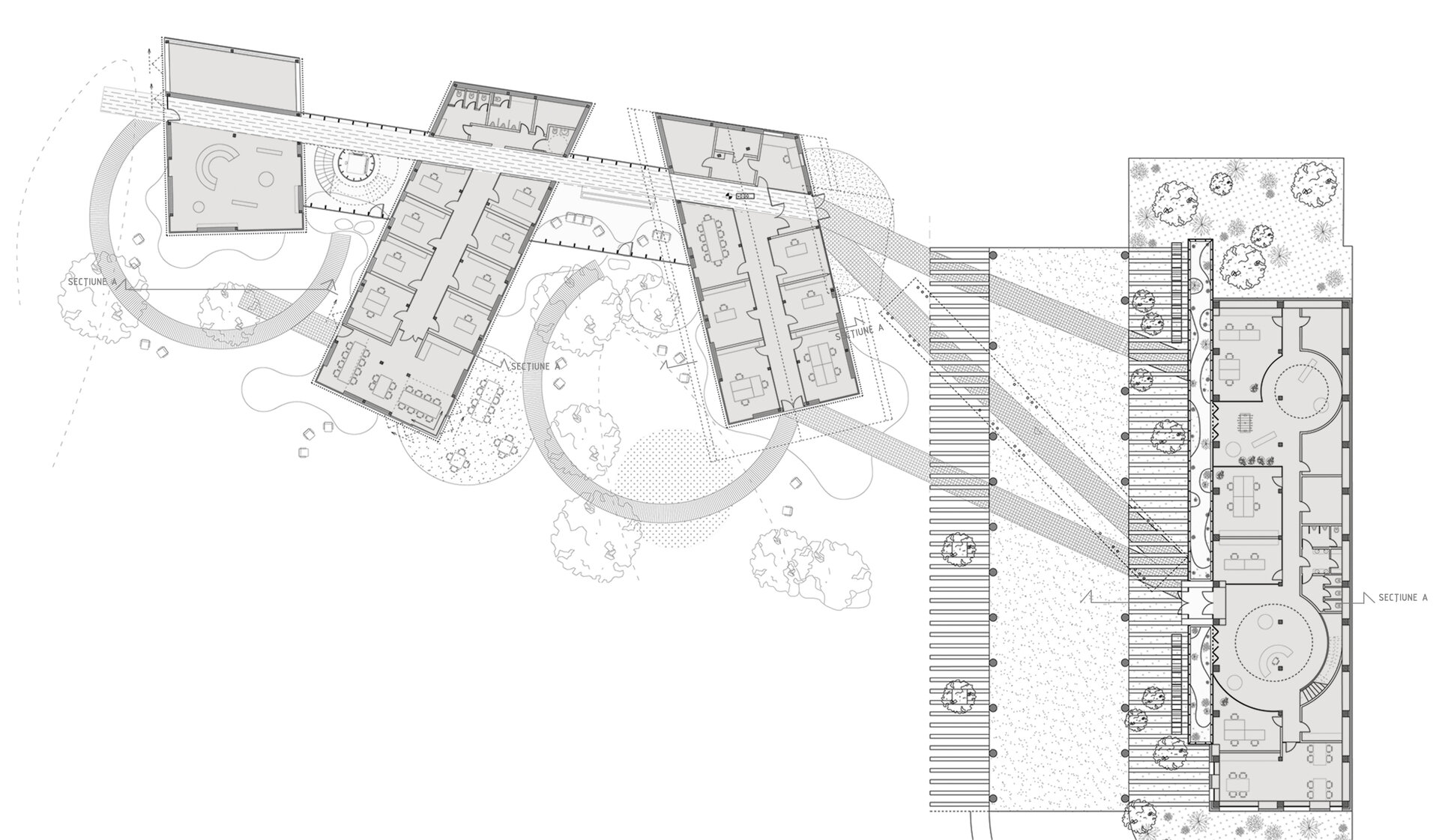Proiectul propune două entități construite, clădirea existentă și cea nouă, între care natura devine un element activ si conector. Volumele noi sunt dispuse asemenea unor degete care ating și cuprind grădina interioară, generând o succesiune de spații intermediare care conectează vizual și funcțional interiorul cu exteriorul. Fațadele spre drumul de acces evocă arhitectura tradițională a caselor secuiești, amintind prin silueta acoperișului în două ape și proporțiile volumetrice ale clădirii, de imaginea primară a locuinței rurale. Golurile dintre volume invită natura în interior, spații intermediare care permit pătrunderea luminii, aerului și vegetației, creând o serie de experiențe senzoriale care fac ca arhitectura să fie percepută nu doar vizual, ci și prin simțuri și emoții. Clădirea nouă este alcătuită din trei volume simple, unite printr-un pridvor vitrat care funcționează ca ax central al ansamblului, o coloană vertebrală care leagă funcțional și vizual toate componentele clădirii, facilitând circulația și legătura între spații. Orientarea cardinală a clădirii optimizează lumina naturală, asigurând atât iluminare corespunzătoare pentru birouri și spații de lucru, cât și priveliști deschise către grădini, râul Olt și peisajul cultural înconjurător. Spre nord, grădinile se deschid către o seră vitrată, un spațiu de tranziție și contemplare, unde natura și arhitectura se întâlnesc, permițând utilizatorilor să experimenteze schimbările de lumină, culoare și miros în funcție de anotimp. Clădirea existentă va fi reconfigurată printr-o fațadă dublă cu grădină verticală și un pridvor verde, creând un dialog subtil între trecut și prezent, între interior și exterior, între structura construită și vegetația care o învelește, conferind spațiilor un caracter viu și sensibil la mediul înconjurător.