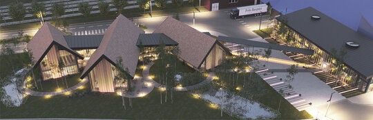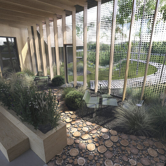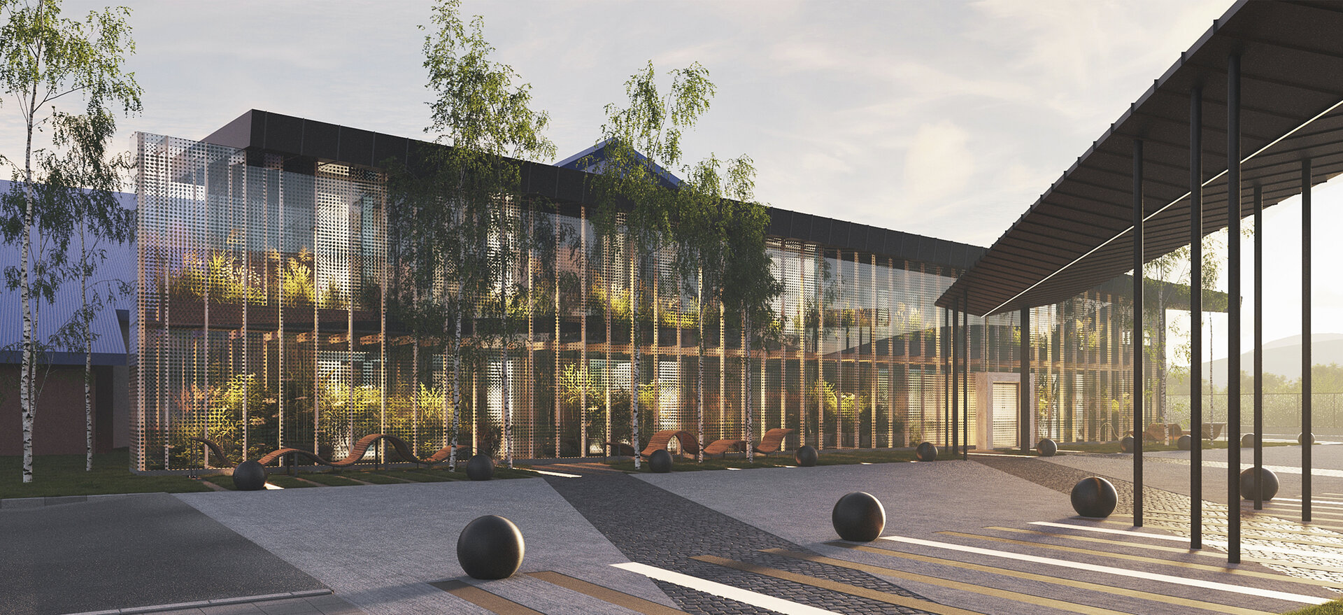 Clădirea existentă va găzdui birouri, spații recreative și tehnice, iar fațada va fi completată cu un pridvor vitrat și o grădină verticală densă care transformă pereții în filtre vii între exterior și interior. Clădirea nouă, alcătuită din trei volume tip „șură” unite prin pridvor vitrat, include recepție, birouri, săli de ședințe, expoziții și spații tehnice, iar spațiile intermediare sunt reprezentate de pridvoare vitrate pentru relaxare și circulație verticală, grădini cu vegetație locală și grădini de ploaie care generează habitat pentru fauna locală și gestionează apa. În întreg ansamblul, grădinile și spațiile verzi sunt gândite pentru a oferi continuitate între natură și arhitectură, pentru a crea un mediu care inspiră conectare și armonie.