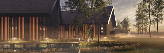 Materialitatea ansamblului exprimă un dialog între tradiție și inovație, între căldura lemnului și transparența sticlei. Lemnul, folosit ca structură și element estetic principal, evocă meșteșugul local și memoria arhitecturii vernaculare, în timp ce sticla, asociată unei dimensiuni mai tehnologice și contemporane, aduce luminozitate, deschidere și transparență. Fațadele sunt articulate prin riflaje din lemn inspirate de paternul gardurilor tradiționale secuiești, reinterpretat într-o cheie modernă, ceea ce conferă ansamblului atât profunzime vizuală, cât și un ritm arhitectural recognoscibil. Acest joc între opac și transparent, între materialitatea caldă și tactilă a lemnului și suprafețele vitrate netede și reflectante, creează o tensiune echilibrată și o continuitate subtilă între patrimoniul local și limbajul arhitecturii contemporane. Deschiderea spațiilor interioare către grădini și peisaj consolidează ideea de permeabilitate și fluiditate între interior și exterior, în timp ce utilizarea materialelor regenerabile și a tehnologiilor eficiente energetic susțin caracterul sustenabil al proiectului, fără a pierde legătura cu contextul cultural și natural.