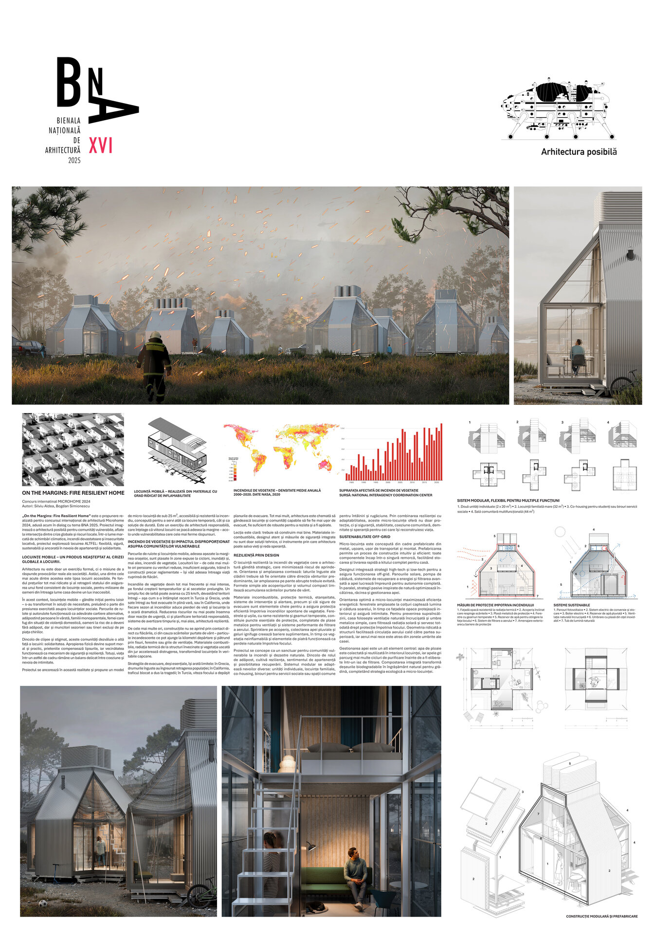 „On the Margins: Fire Resilient Home” este o propunere realizată pentru concursul internațional de arhitectură Microhome 2024, adusă acum în dialog cu tema BNA 2025. Proiectul imaginează o arhitectură posibilă pentru comunități vulnerabile, aflate la intersecția dintre crize globale și riscuri locale. Într-o lume marcată de schimbări climatice, incendii devastatoare și insecuritate locativă, proiectul explorează locuirea ALTFEL: flexibilă, sigură, sustenabilă și ancorată în nevoia de apartenență și solidaritate.