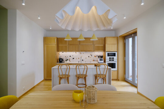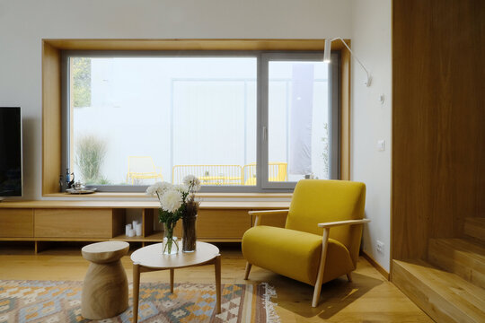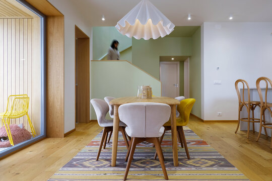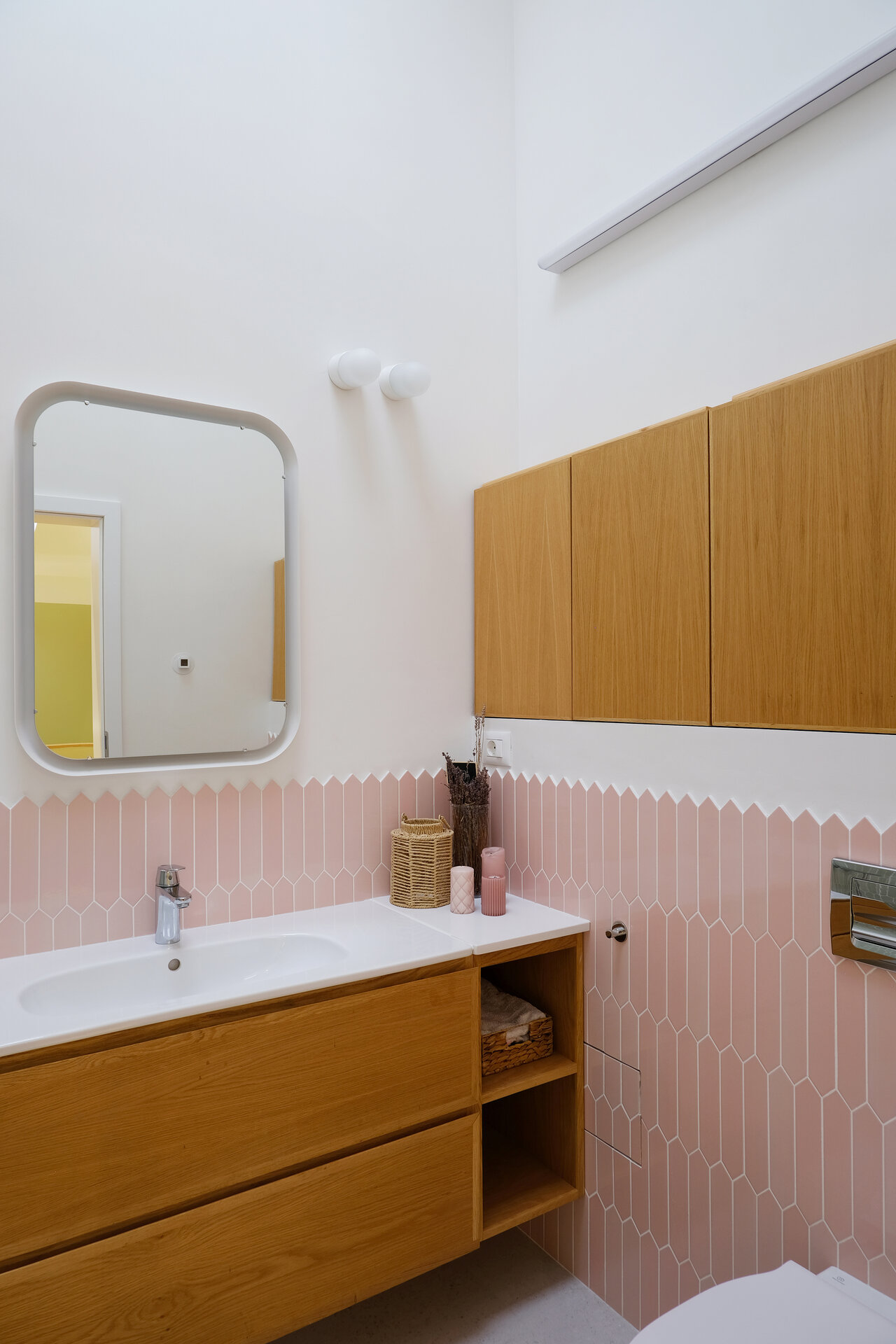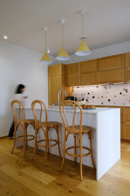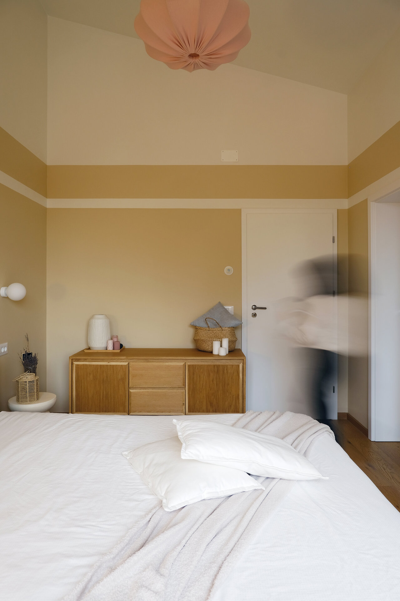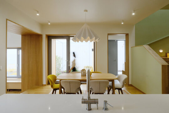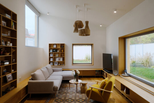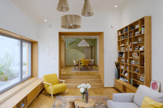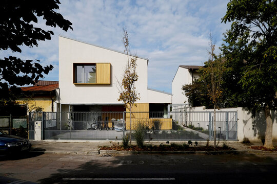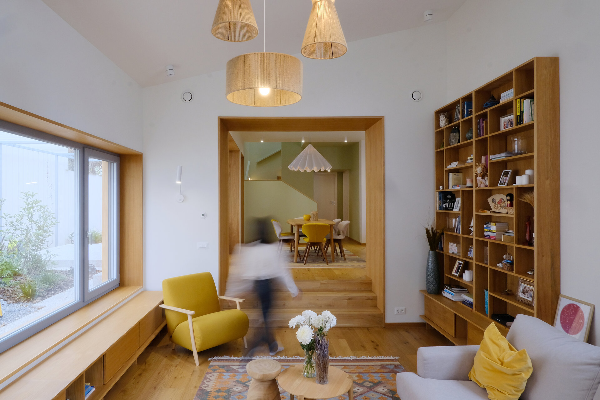 Parterul cu formă organică cuprinde biroul de acasă, bucătăria cu zona de dining și spațiile de servicii. Deasupra, un etaj compact adăpostește trei dormitoare, două băi și un mic hol central. Livingul este conceput ca un volum distinct, atașat casei pe o singură parte, creând o secțiune arhitecturală diferită, unde atât podeaua, cât și tavanul au cote diferite față de restul casei, subliniind rolul important al acestui spațiu. Din motive juridice, casa a fost construită lipită de zidul de delimitare sudic, ceea ce a limitat orientarea ideală a camerelor. Prin separarea livingului într-un volum distinct, detașat de limita de proprietate, am putut integra o fereastră înaltă orientată spre sud, care aduce multă lumină naturală directă.