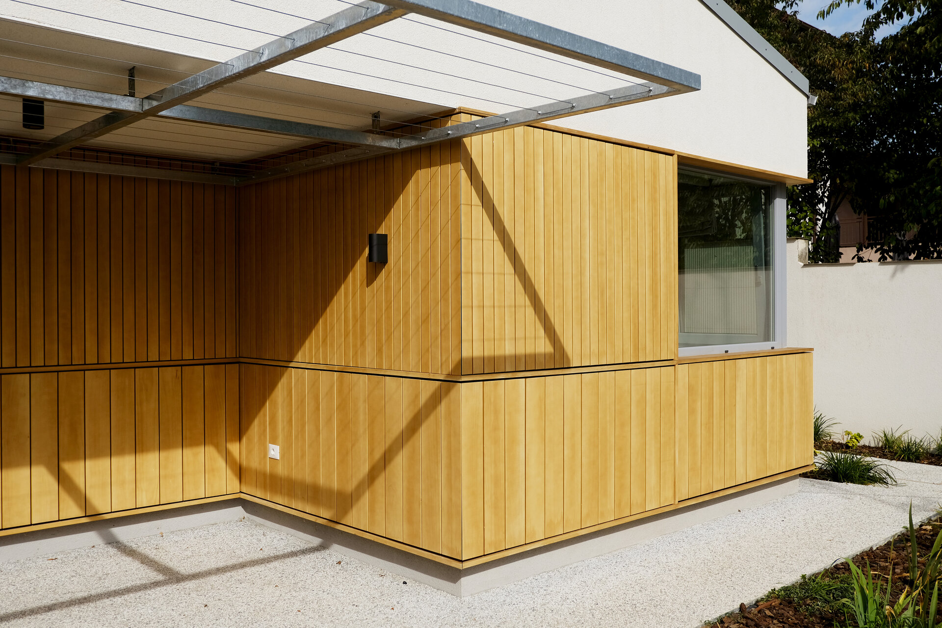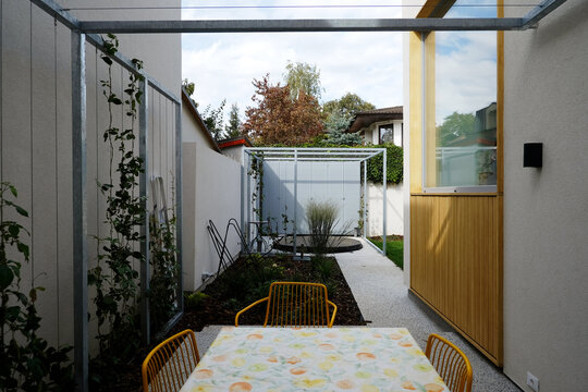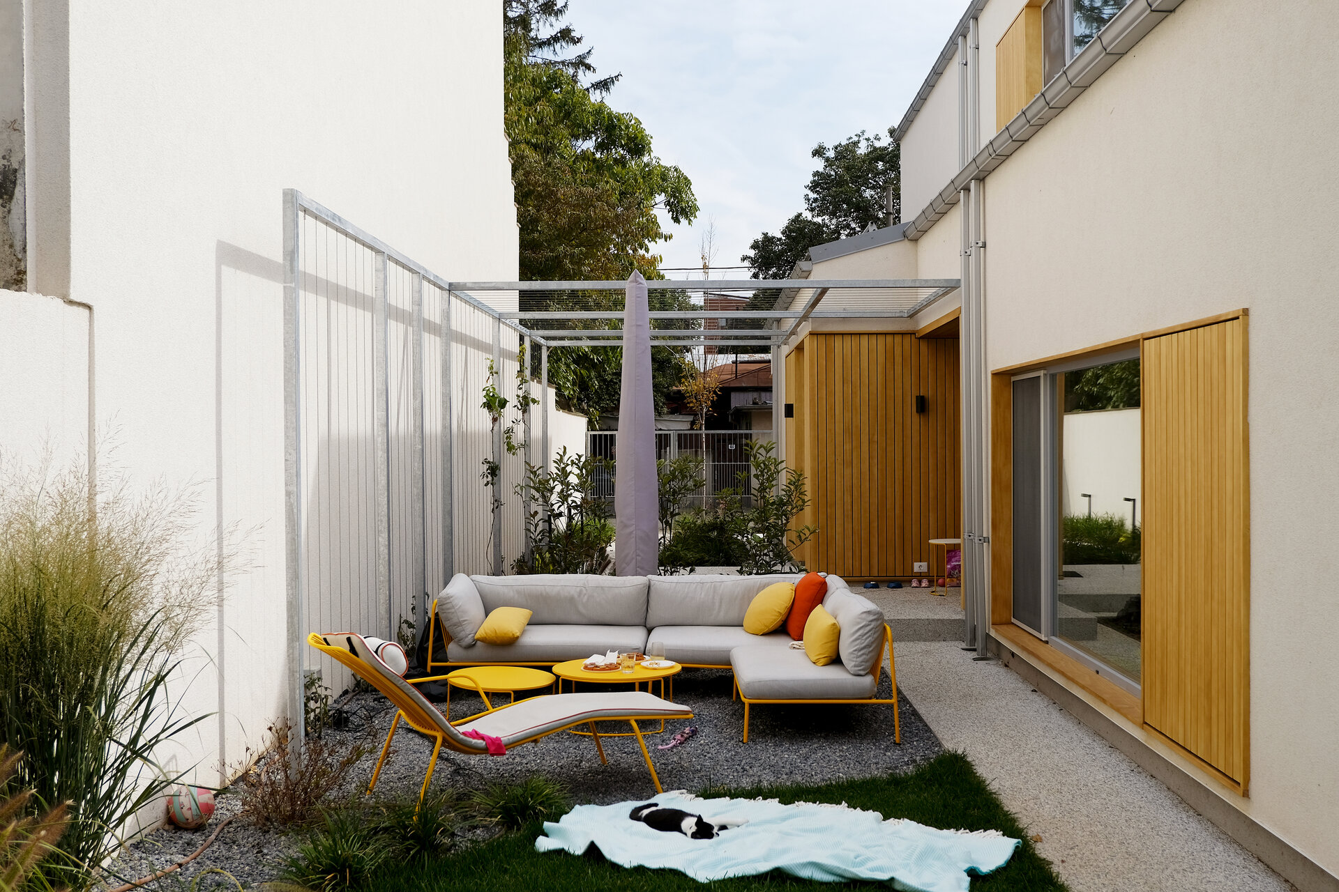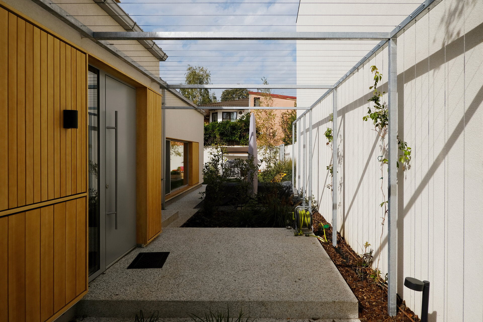 Pentru a consolida această legătură, am integrat structuri din oțel galvanizat atașate casei, care permit plantelor cățărătoare să se dezvolte și să ofere umbră mai multor spații exterioare, precum intrarea, colțul cu jacuzzi, terasa de dining și carportul. Aceste elemente fac referire la structurile vernaculare din oțel, des întâlnite în sudul României, unde vița-de-vie crește pentru a proteja terasele exterioare, un detaliu ce se regăsește și în cartier.