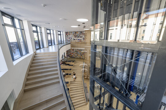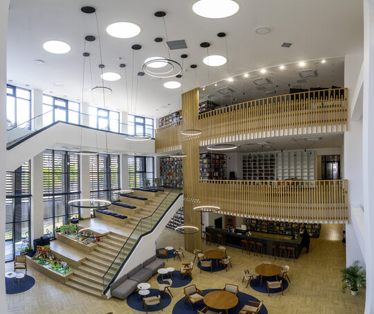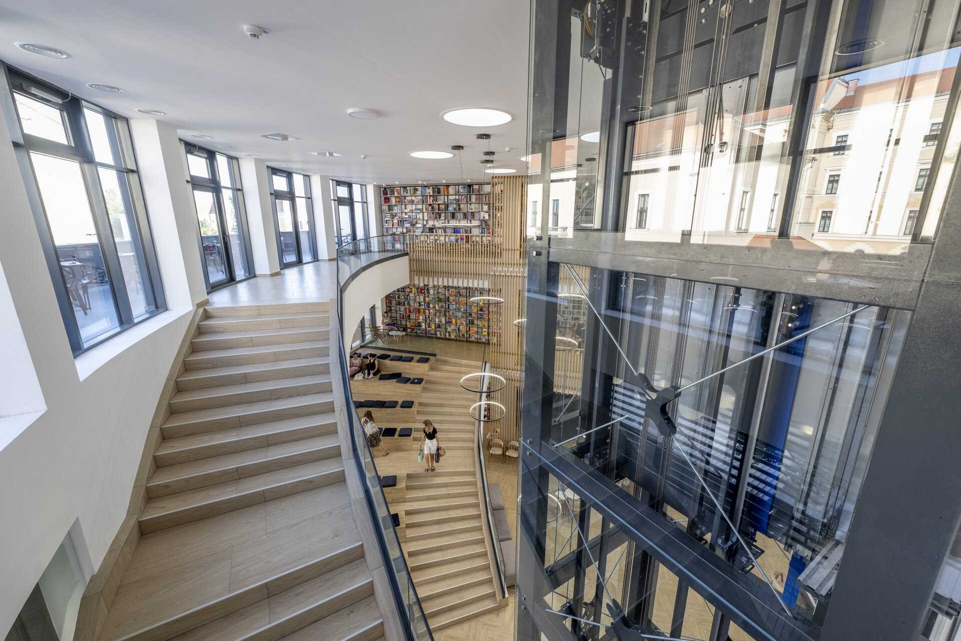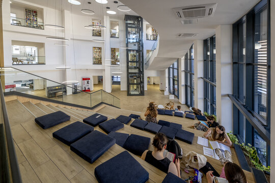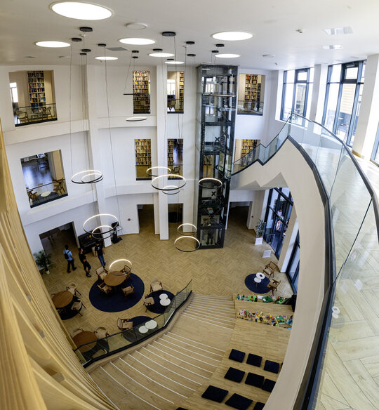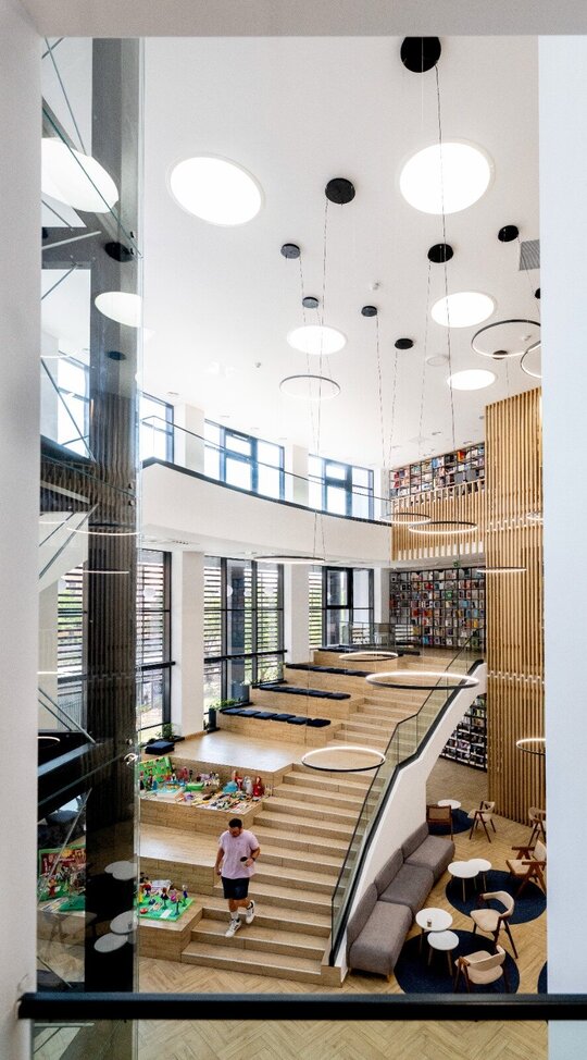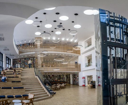 Mai mult, acest lobby central democratizează accesul la carte atât prin spațiile comune pentru citit, cât și prin amplasarea cărților pe traseul vizitatorului, ce poate accesa cartea rapid datorită digitalizării. Atriumul devine astfel un tăvălug de legătură culturală.