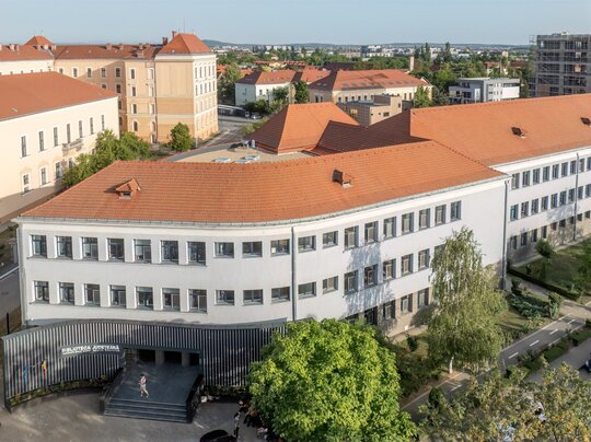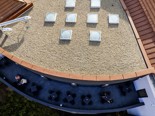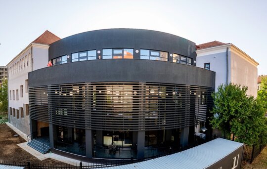 și să se „desfășoare vizual”, rezultând totodată o terasă panoramică în dreptul retragerii de la etajul al 2-lea. Forma curbată la nivel planimetric și volumetric a atriumului dintre corpurile existente vine să întărească această idee de unificare și lipsă a intruziunii.