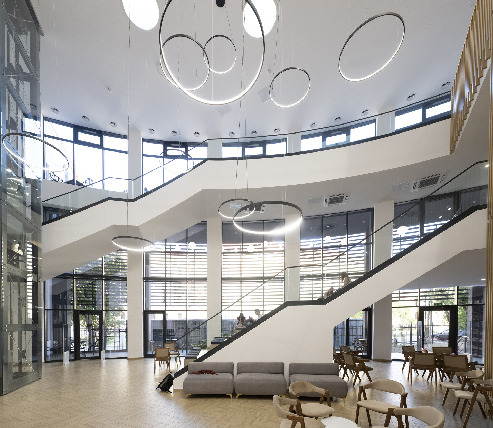 Din punct de vedere conceptual și funcțional, lobby-ul central este gândit ca principalul spațiu de primire, de distribuire spre nivele – parter, etaj 1 și etaj 2 – dar și spre spațiile interioare de pe nivele destinate publicului. La nivelul parterului este gândit un spațiu