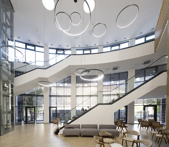 angajat, iar alta deschisă în totalitate publicului, compusă dintr-un atrium/lobby central curol de interconectare a spațiilor, atât pe orizontală și pe verticală, cât și vizuală.