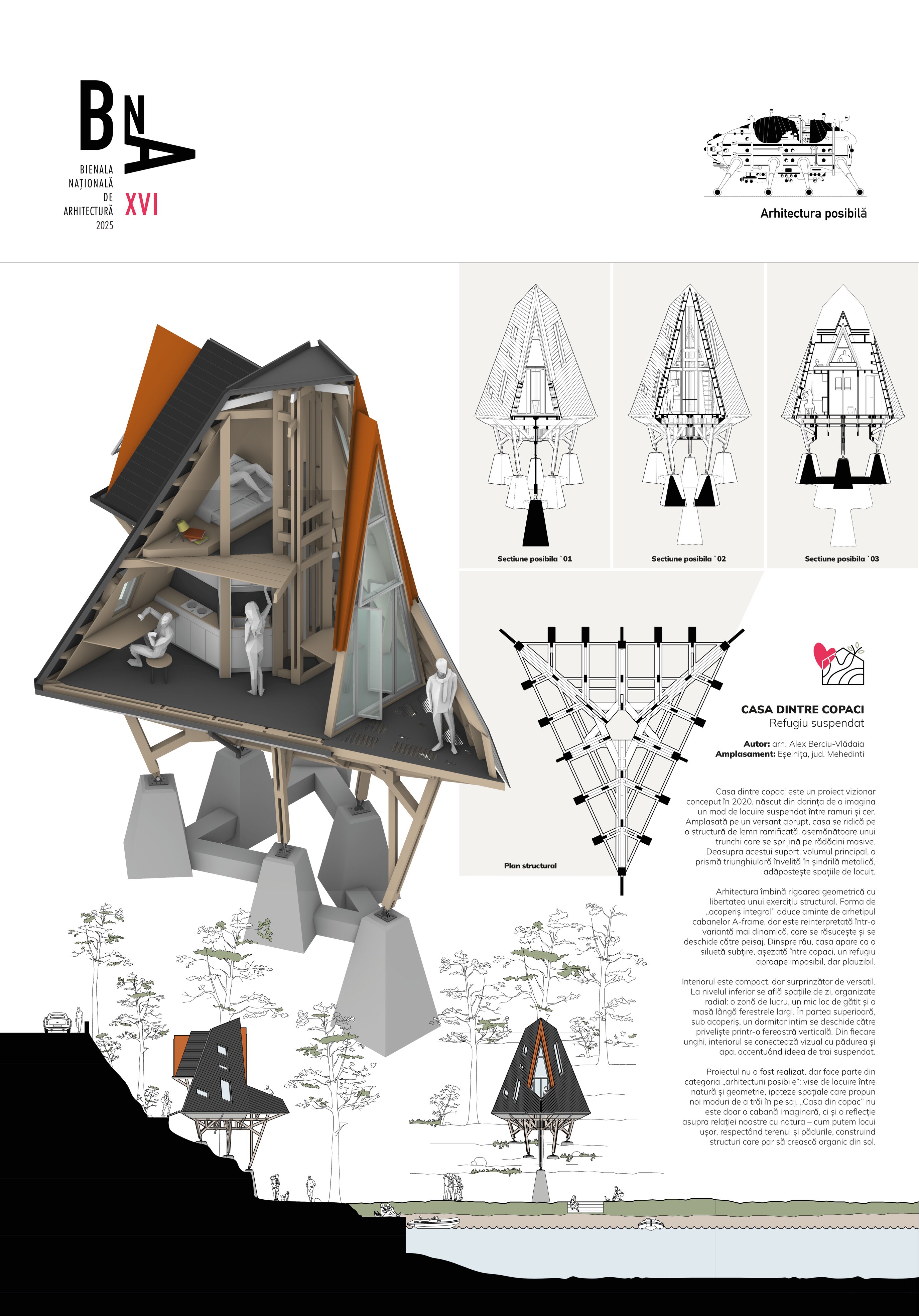 „Casa dintre copaci” este un proiect conceptual născut în 2020 din dorința de a imagina un mod de locuire suspendat, la granița dintre ramuri si cer. Arhitectura face parte din acea categorie care testează limitele limbajului formal, explorând ipoteze constructive și scenarii de viață altfel.