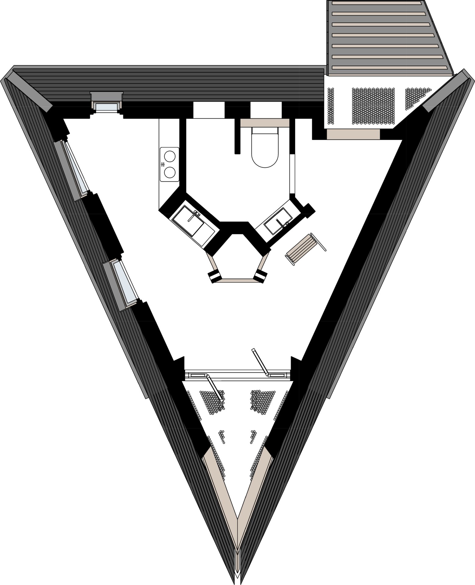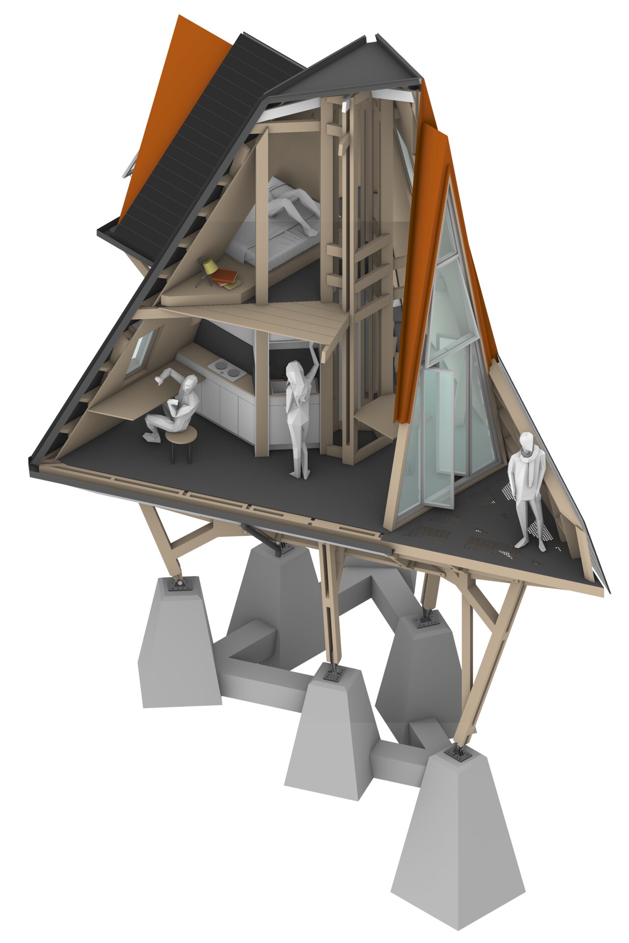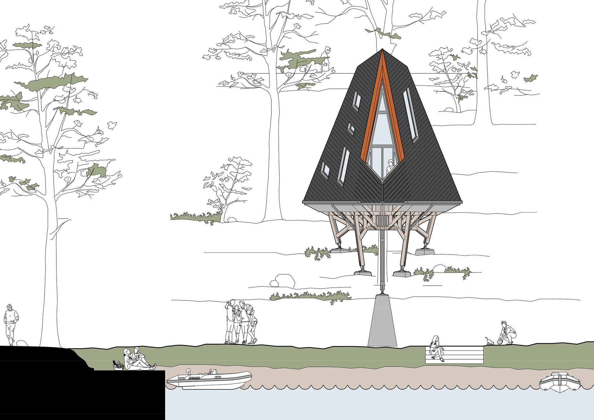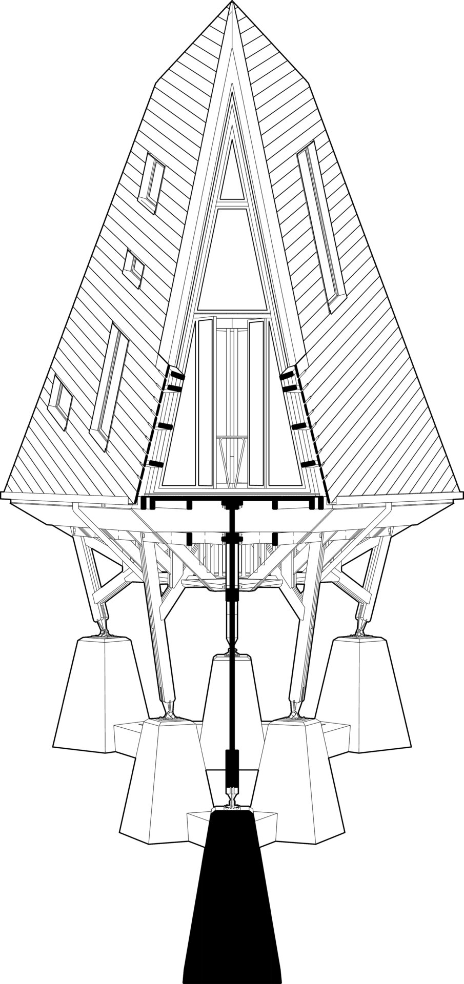 Locul imaginar al casei este un versant abrupt, cu vedere spre un râu liniștit. Acolo, între copaci și stânci, se ridică o structură de lemn ramificată, care funcționează asemenea unui trunchi. Din această bază se dezvoltă volumul principal: o prismă triunghiulară, o casă-acoperiș, învelită integral în șindrilă metalică. Forma sa trimite la arhetipul cabanelor A-frame, dar într-o interpretare mai radicală. Acoperișul nu este doar protecție, ci însăși expresia arhitecturii: totul se subscrie geometriei sale clare și tensionate.