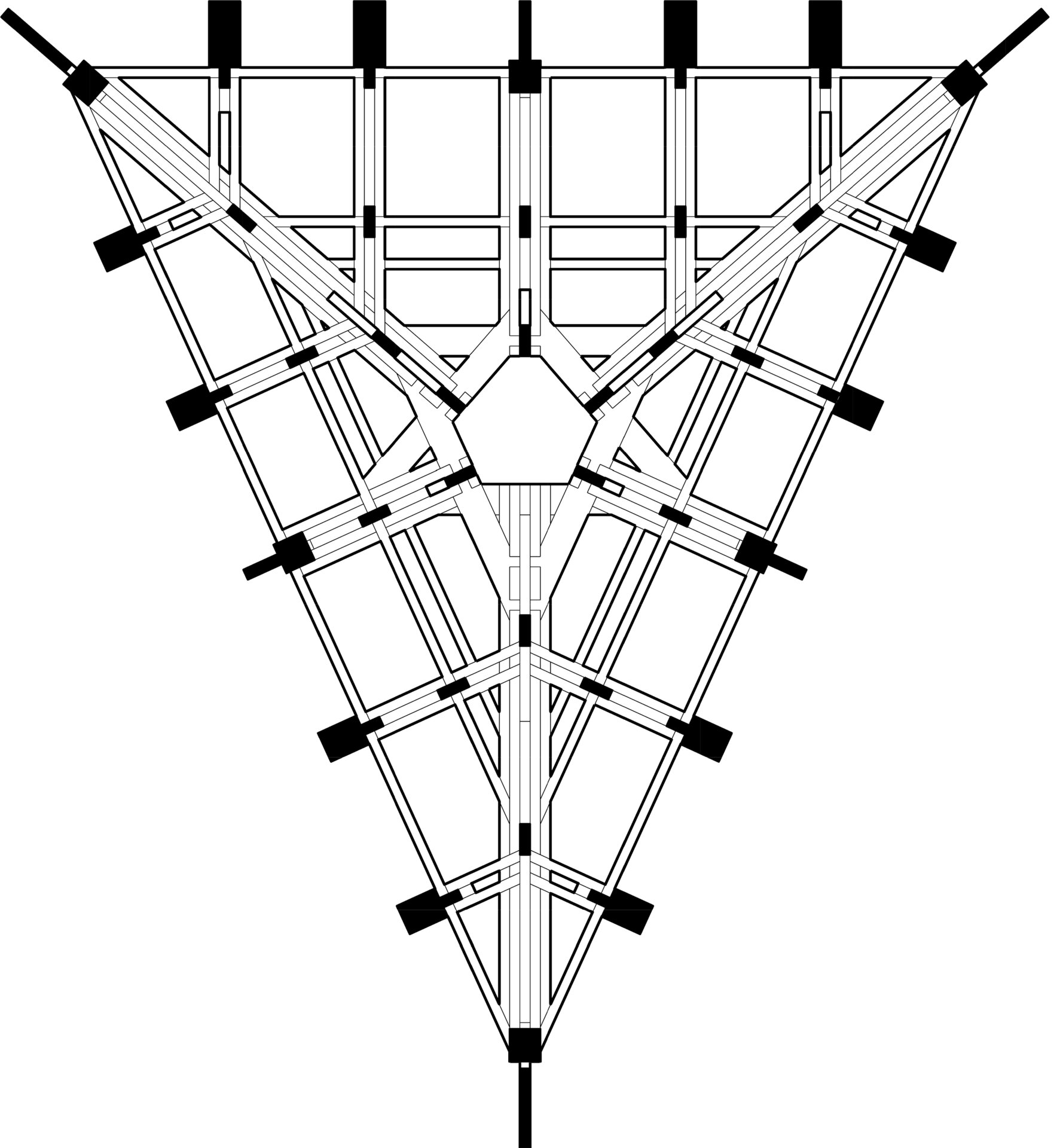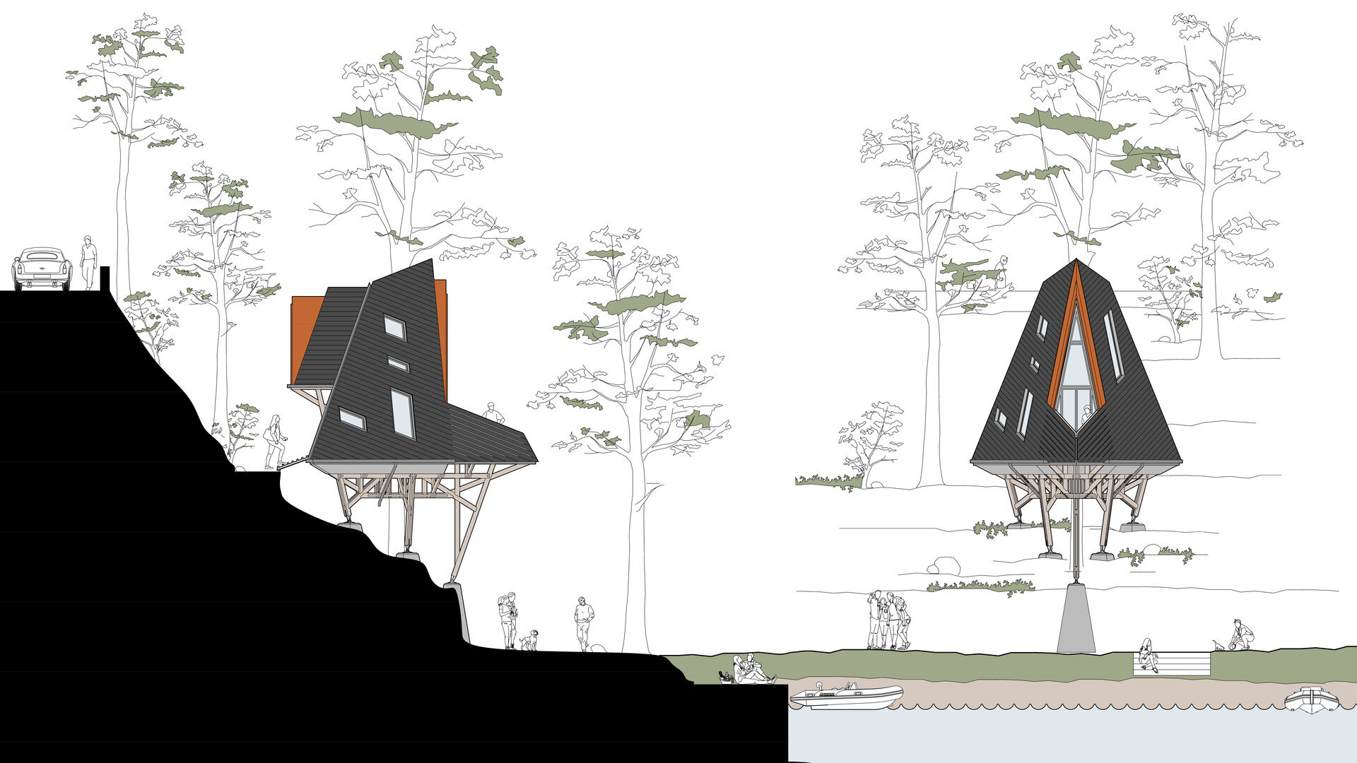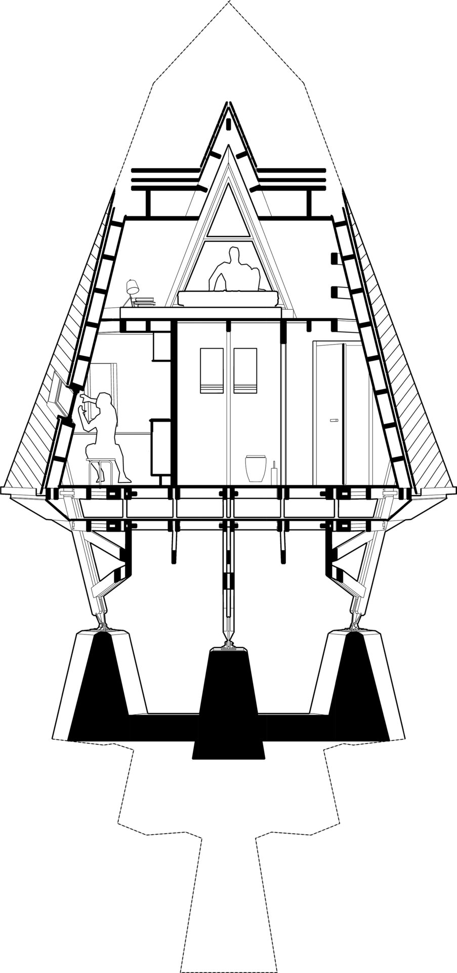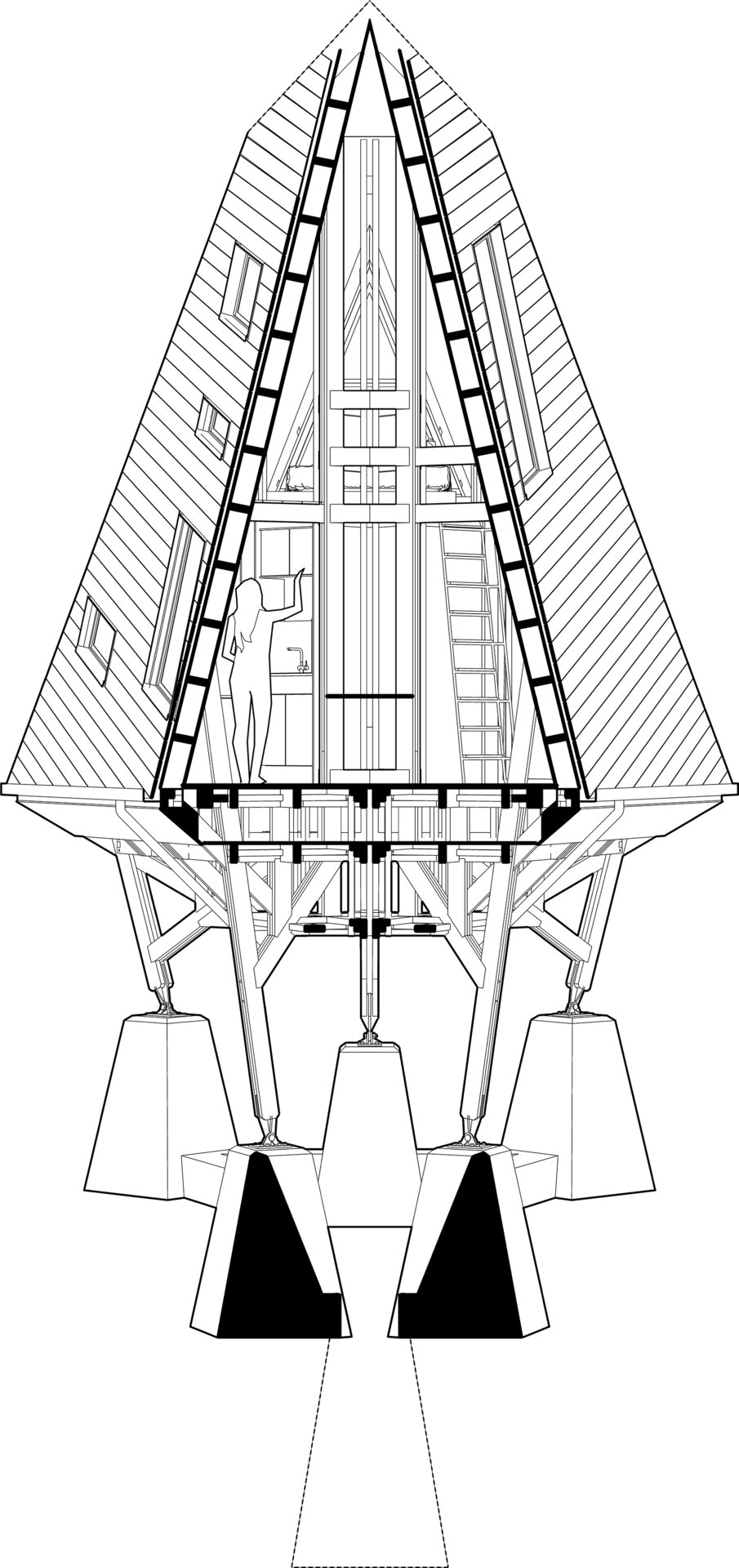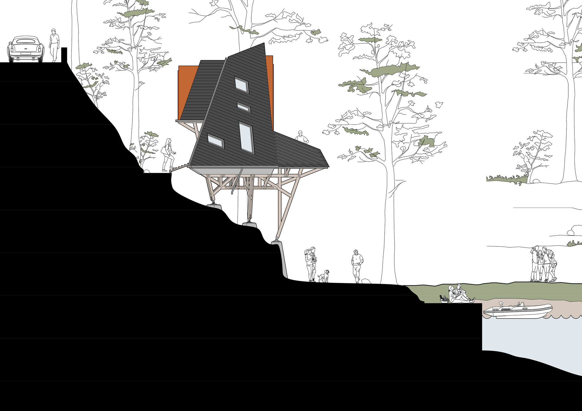 Locul imaginar al casei este un versant abrupt, cu vedere spre un râu liniștit. Acolo, între copaci și stânci, se ridică o structură de lemn ramificată, care funcționează asemenea unui trunchi. Din această bază se dezvoltă volumul principal: o prismă triunghiulară, o casă-acoperiș, învelită integral în șindrilă metalică. Forma sa trimite la arhetipul cabanelor A-frame, dar într-o interpretare mai radicală. Acoperișul nu este doar protecție, ci însăși expresia arhitecturii: totul se subscrie geometriei sale clare și tensionate.
