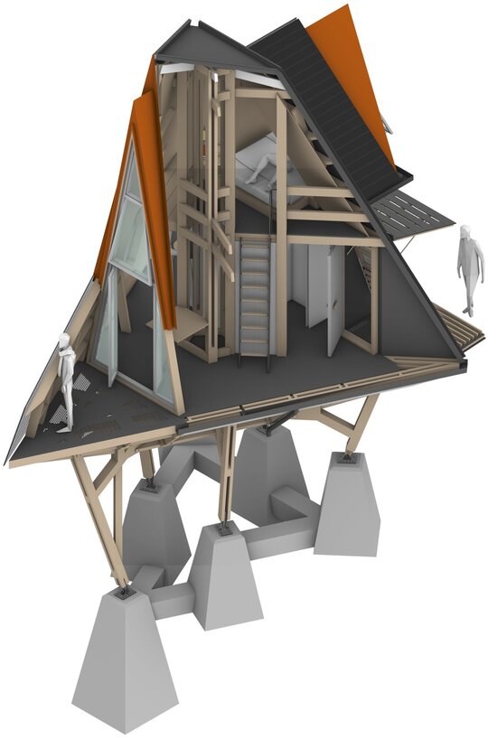 Structura este gândită ca un joc între stabilitate și delicatețe. Baza din lemn masiv, ancorată în teren ca niște rădăcini, contrastează cu silueta subțire a volumului superior. Casa pare o cutie înclinată, sprijinită pe ramuri, balans între fragilitate și forță. Inspirația vine din natură: din modul în care copacii cresc pe pante abrupte, căutând echilibru între verticalitate și teren accidentat.