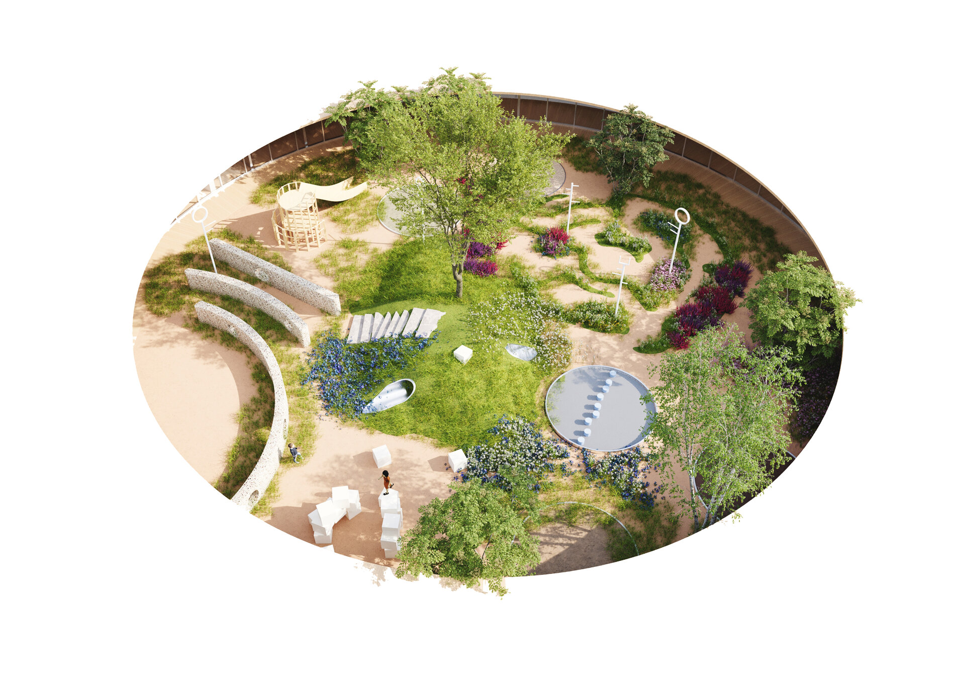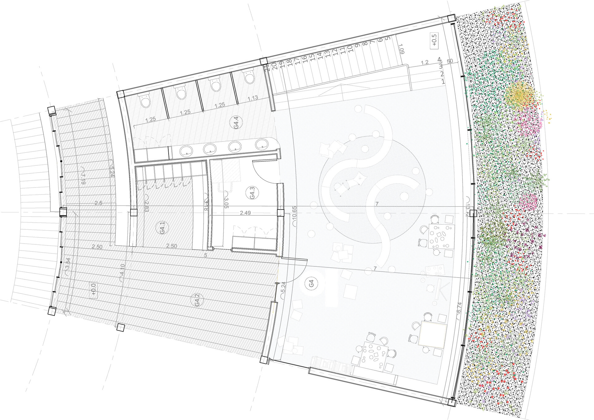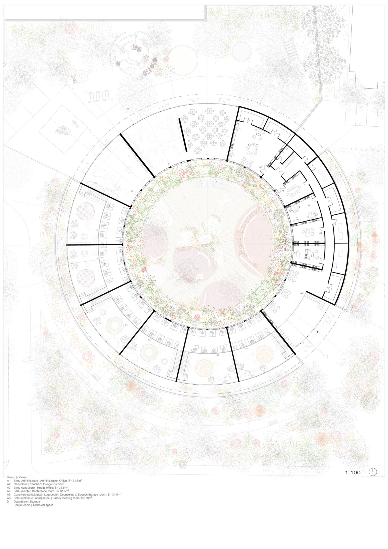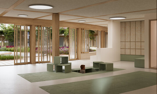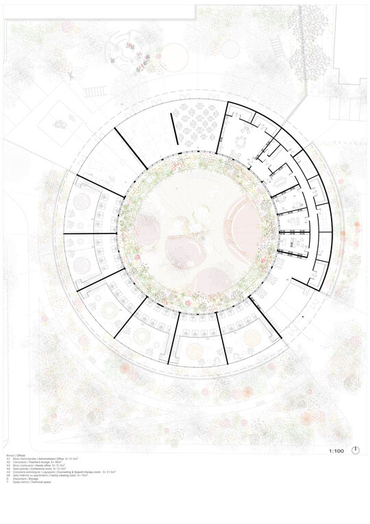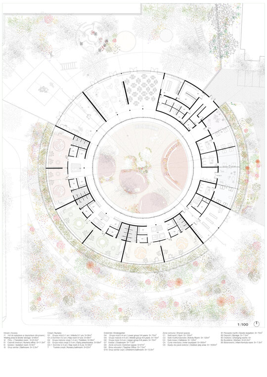 Cercul, diagonalele, urcușurile și coborâșurile, înălțimile spațiilor, trecerile gradate între spațiile private și cele comune - toate acestea fac parte dintr-o serie de gesturi menite să le ofere copiilor noi perspective (și la propriu, și la figurat). Simpla navigare zilnică prin spațiul acestei grădinițe contribuie la însușirea pozitivă a unor aptitudini precum cele sociale, simțul proprietății, sentimentul de apartenență, raportarea la grupuri de diverse mărimi.