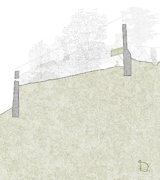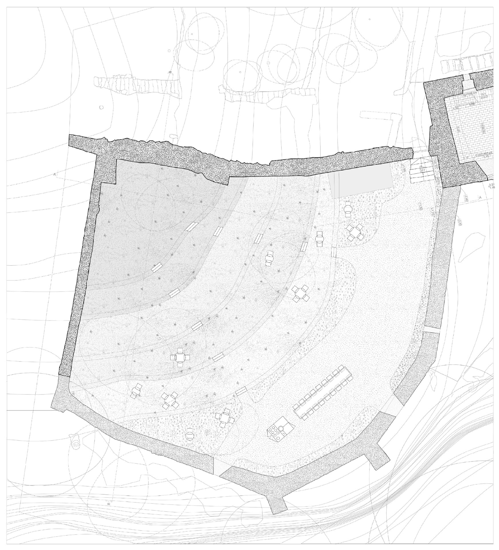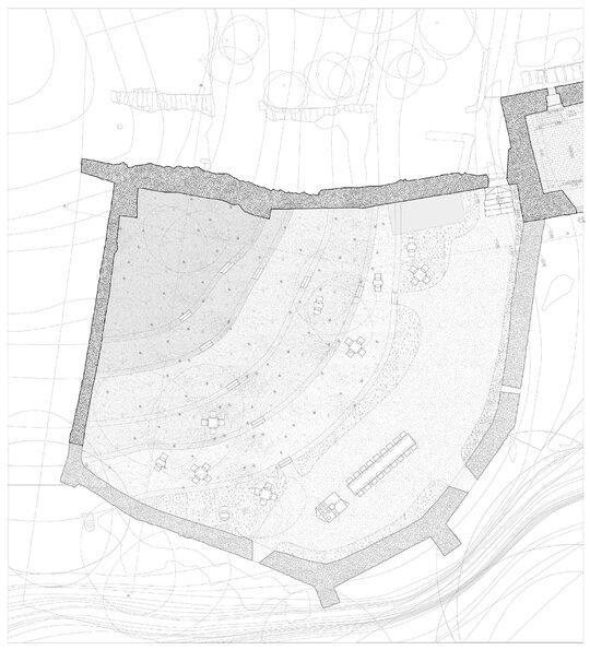 Bastionul, văzut ca un rest lăsat neatins, conține grădina, în interiorul căreia se pot observa însuflețite locuri de odihnă, spații care te invită să pășești praguri și o masă întinsă ca gest de adunare.