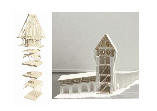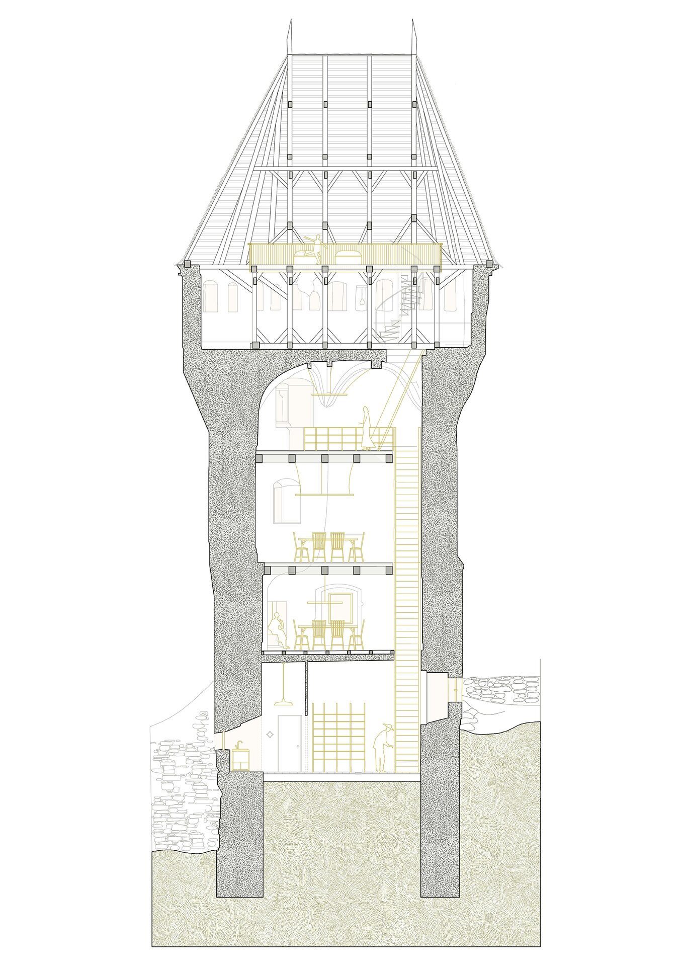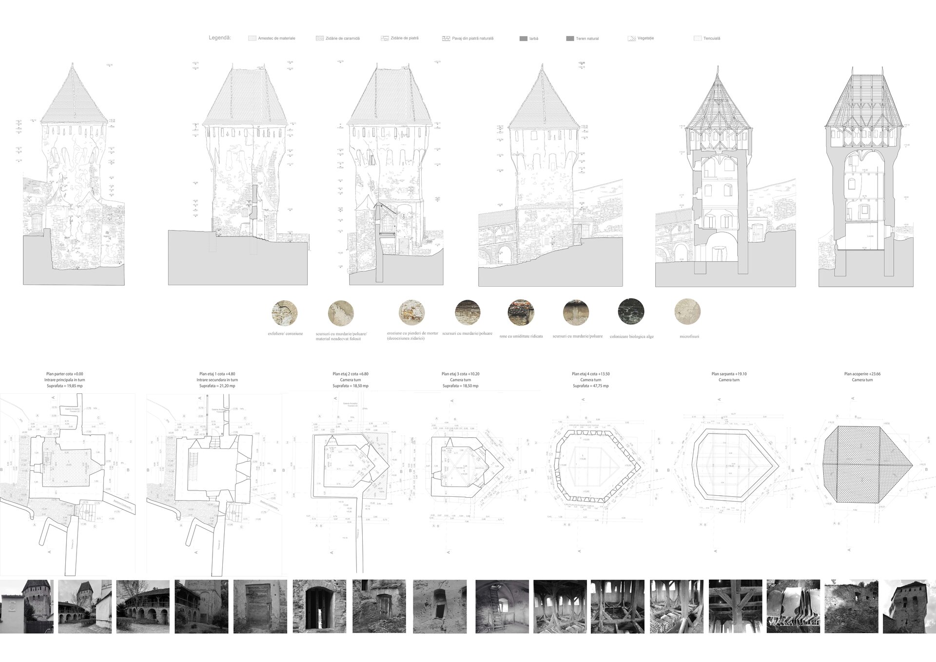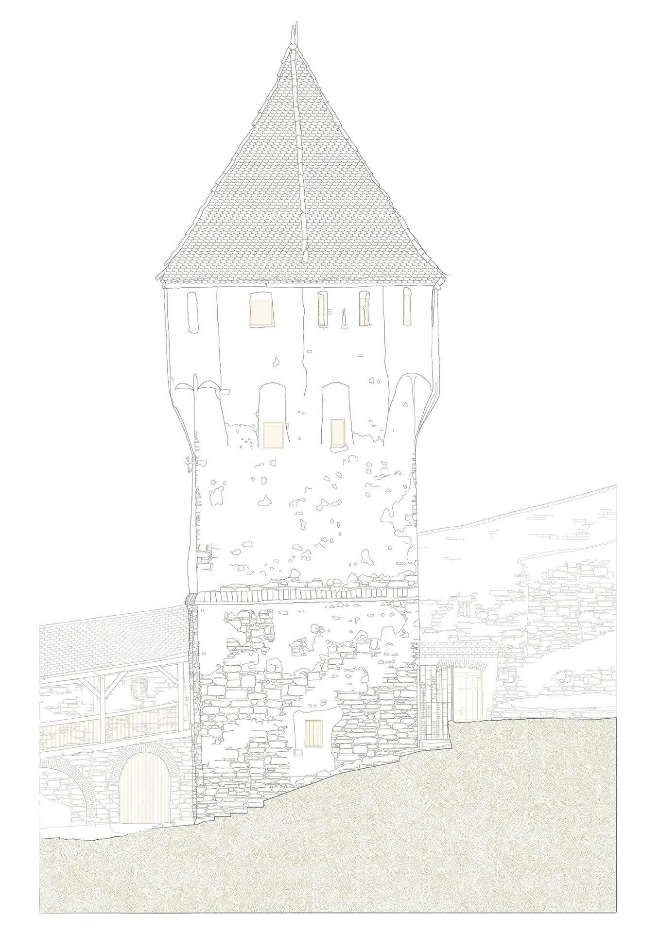 În tectonica sa, turnul își păstrează geometria puternică, incoruptibilă și ideală, dar care radiază în proximități o disponibilitate de negociere, o generozitate citită în consacrarea spațiilor interioare prin păstrarea cotelor inițiale de călcare și completarea cu intervenții minimale a unor inserții funcționale ce ar îmbunătăți arhitectura defensivă, simplă și lipsită de ornamente.