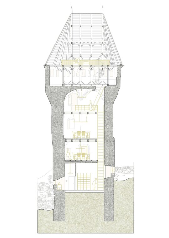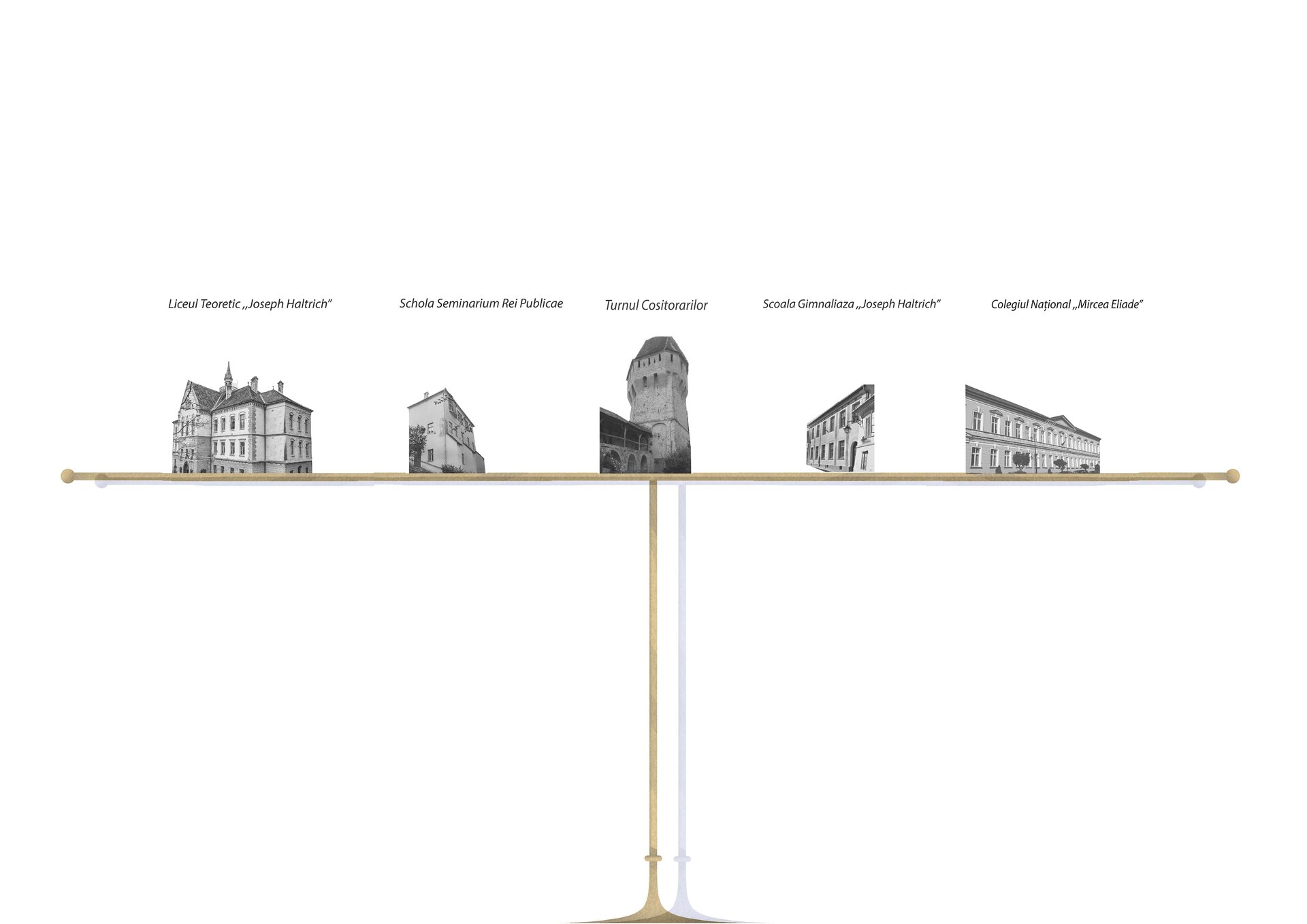 În legătură cu Turnul Cositorarilor se află o serie de instituții de învățământ, care vin în completarea viitoarei funcțiuni ce ar putea lua loc, cât și la revitalizarea orașului. Turnul, prin potențialul său ascuns, aflat la mijlocul acestor instituții, și-ar putea găsi împlinirea prin crearea unui spațiu cu caracter educațional și formator. Propunerea aduce în lumină conversia arhitecturală a unei ruine, ce culminează cu propunerea unei Școli de vară, a unui gest de ospitalitate, primire și grijă.