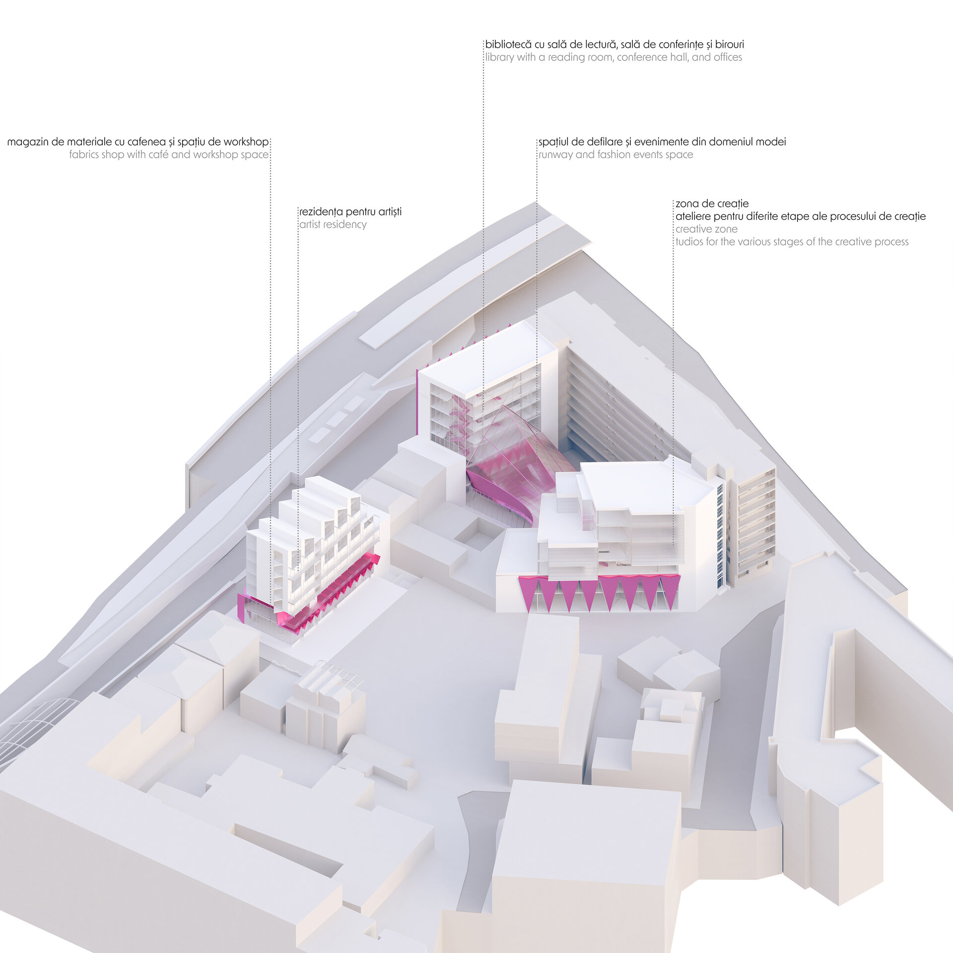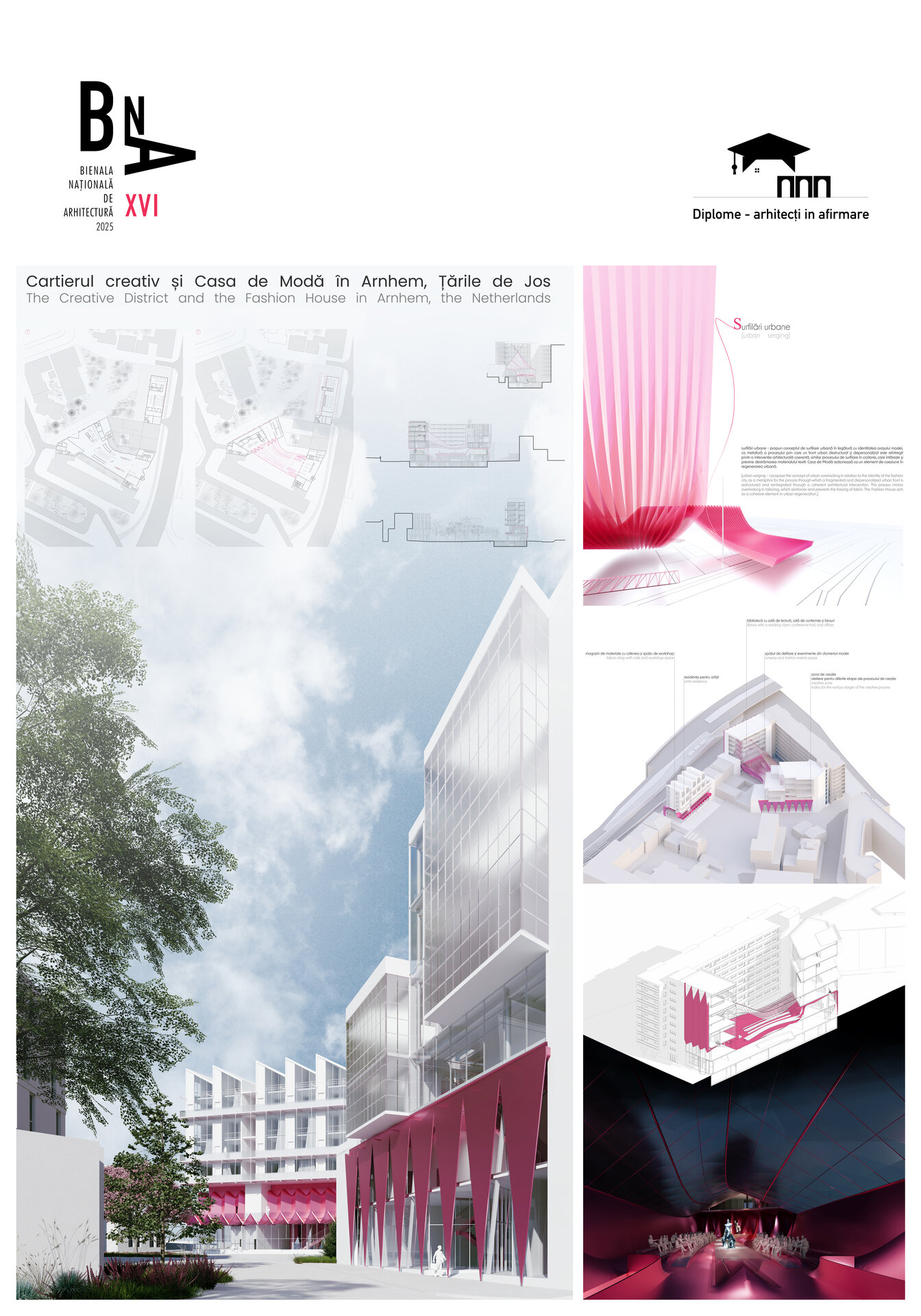 Astfel, Proiectul de Diplomă explorează potențialului Casei de Modă ca obiect arhitectural emblematic în revitalizarea cartierului Coehoorn. Poziționată strategic în imediata vecinătate a centrului istoric și ca parte a traseului modei și designului în oraș, Casa de Modă devine o componentă activă a regenerării urbane, o platformă de inovare și design, o sursă a identității locale. Este o expresie spațială a creativității, o surfilare urbană ca gest de reîntregire a unui context destructurat și depersonalizat. Asemănător unei cusături care oprește destrămarea țesăturii, Casa de Modă și rezidența pentru artiști recompun identitatea urbană și socială a cartierului. Totodată, relația dintre arhitectură și modă este explorată prin conformarea volumelor, pornind de la ideea unui material textil plisat. Țesătura se așterne peste sit, conectând corpurile de clădire într-o compoziție coerentă și fluidă, o compoziție care îmbină conceptul, funcționalitatea și expresia arhitecturală. Această coregrafie spațială se bazează pe conceptul de „dressness”, unde interiorul este definit de formele plisate. Pe fațade, aceste pliuri devin drapaje, care dezvăluie și anunță limbajul interior al clădirii.