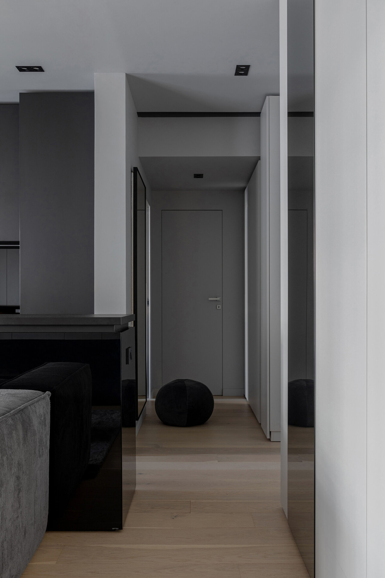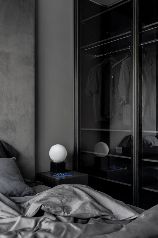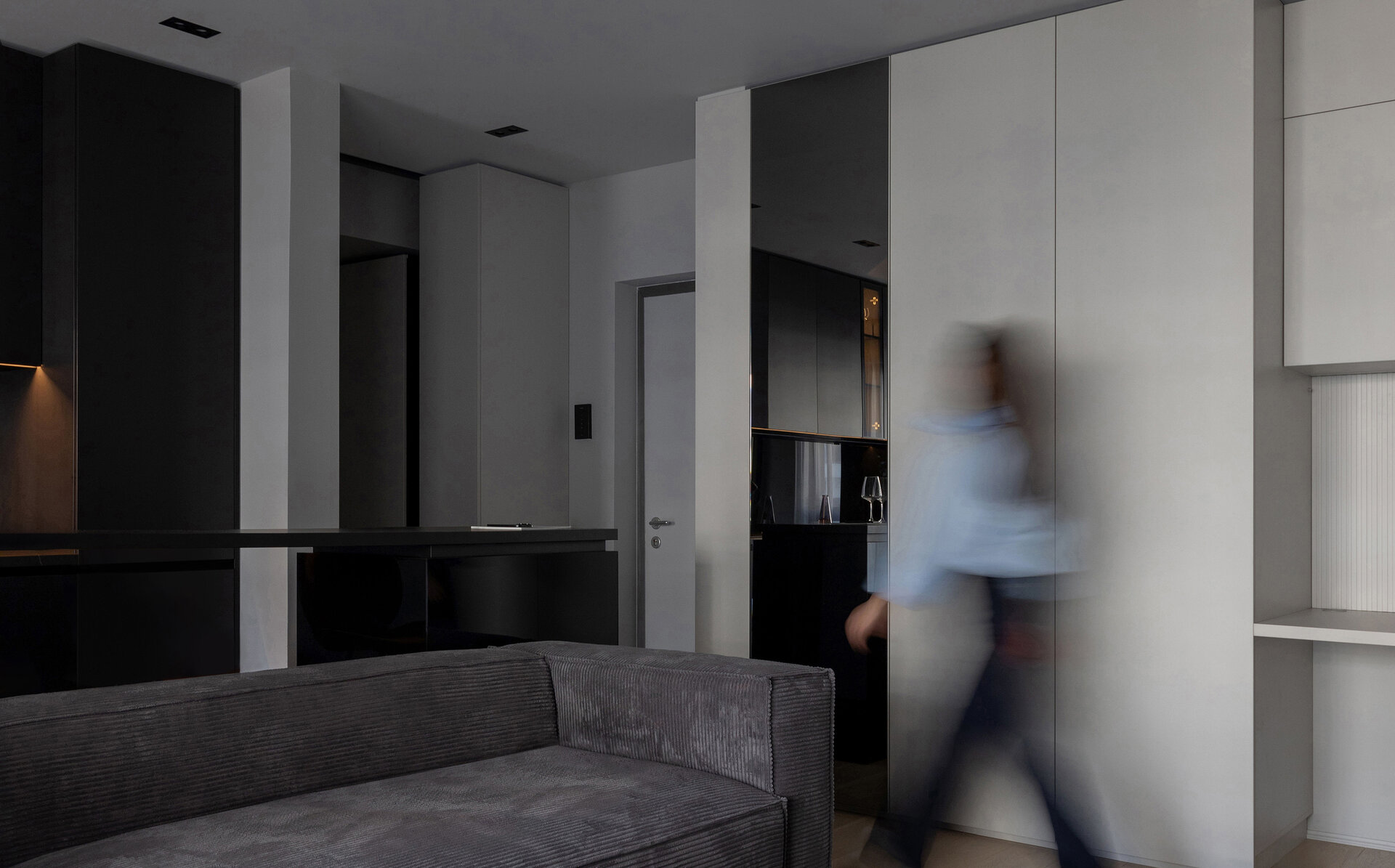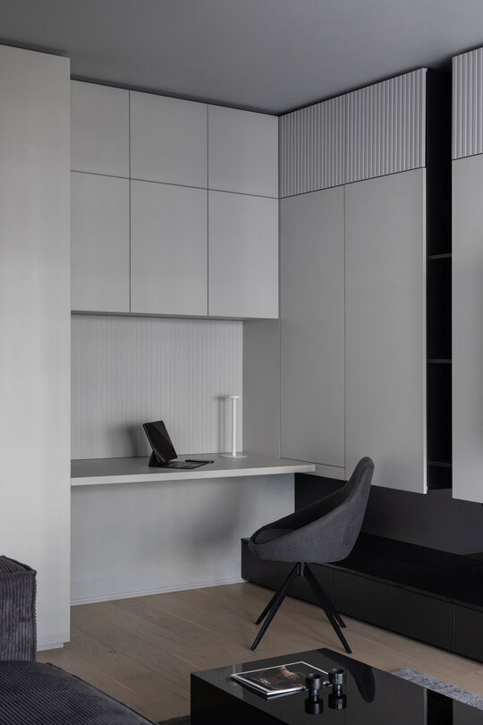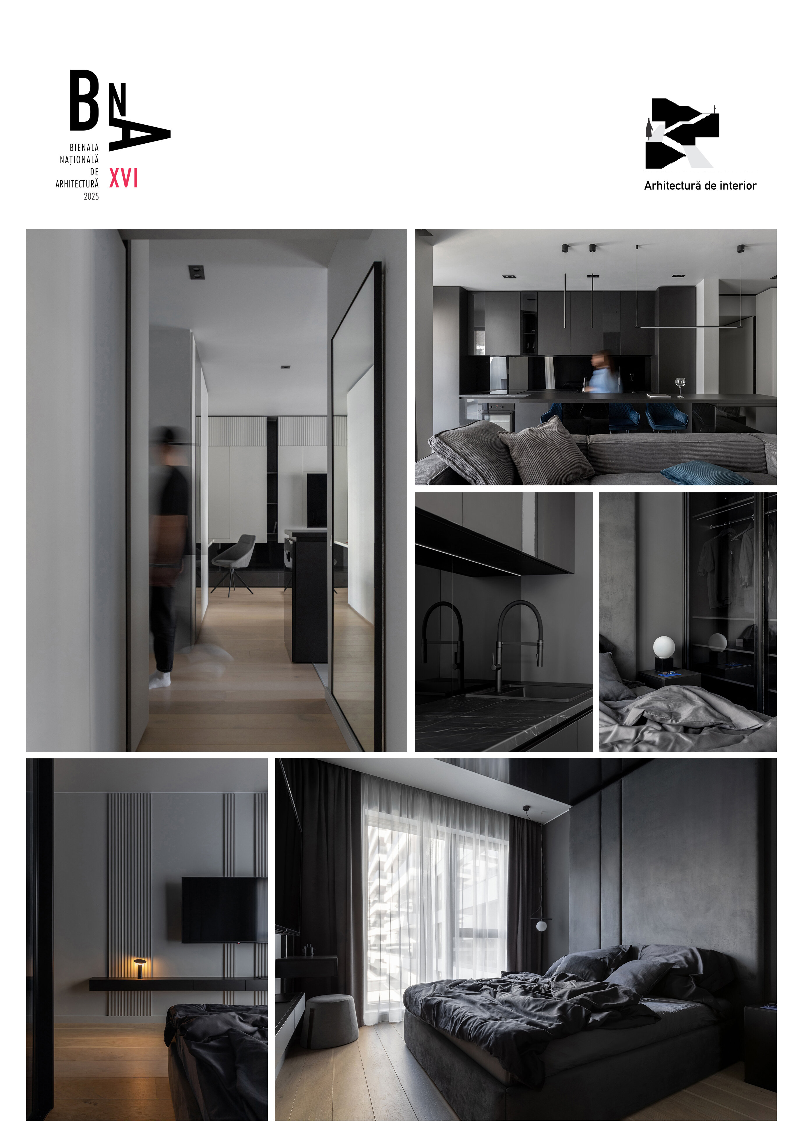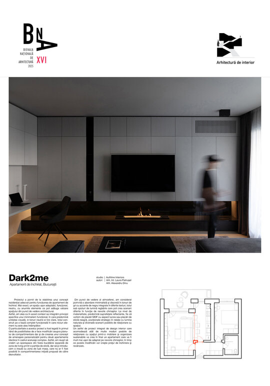 O particularitate a acestui proiect a fost legată în primul rând de posibilitatea de a face modificări asupra planului de compartimentare dar şi de crearea unui concept de amenajare personalizabil pentru două apartamente identice în cadrul aceluiaşi complex. Astfel, am reuşit să creăm un openspace din fosta bucătărie separată de zona de living printr-o partiţie de sticlă, dar să şi introducem o insulă cu zona de luat masa, care nu ar fi fost posibilă în compartimentarea iniţială propusă de către dezvoltator. Din punct de vedere al atmosferei, am considerat potrivită o abordare minimalistă şi discretă în tonuri de gri cu accente de negru integrate în diferite texturi, totul sub spoturi de lumină reglabile care pot crea scenarii diferite în funcţie de nevoile chiriaşilor. La nivel de materialitate, predomină suprafeţele reflectante, fie că vorbim de placări MDF cu aspect lucios sau placări de sticlă neagră, poziţionate strategic în relaţie cu lumina naturala şi diversele scenarii posibile de relaţionare cu spaţiul.