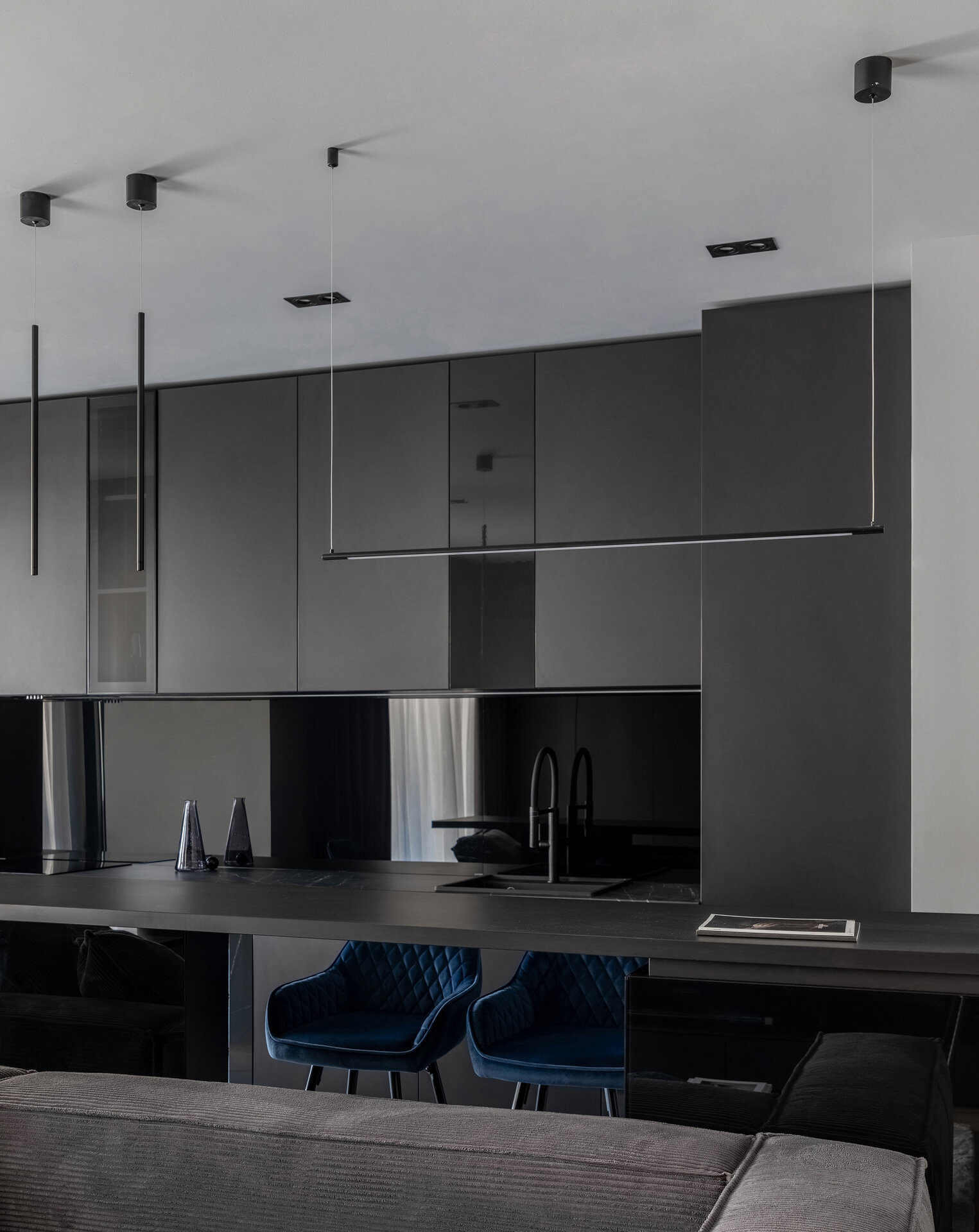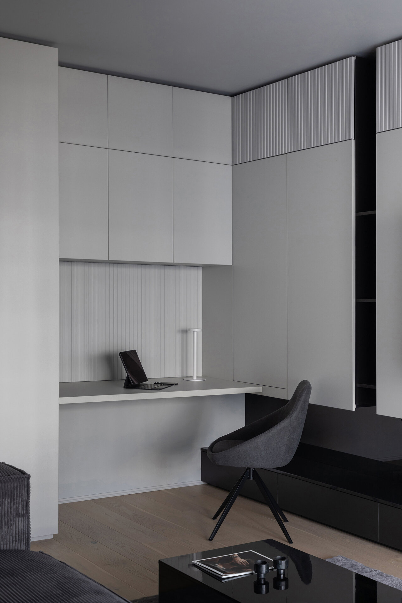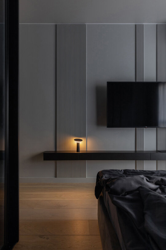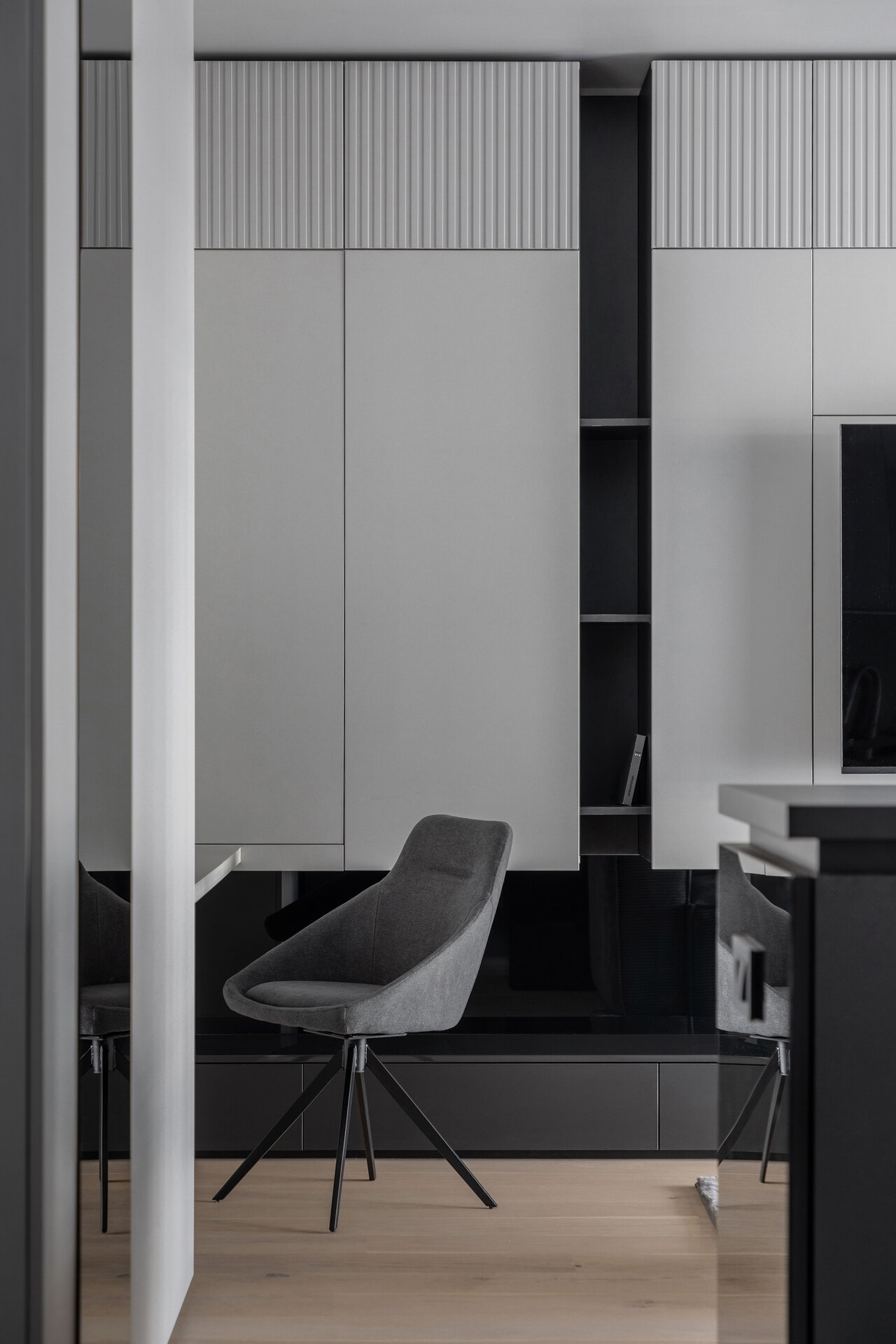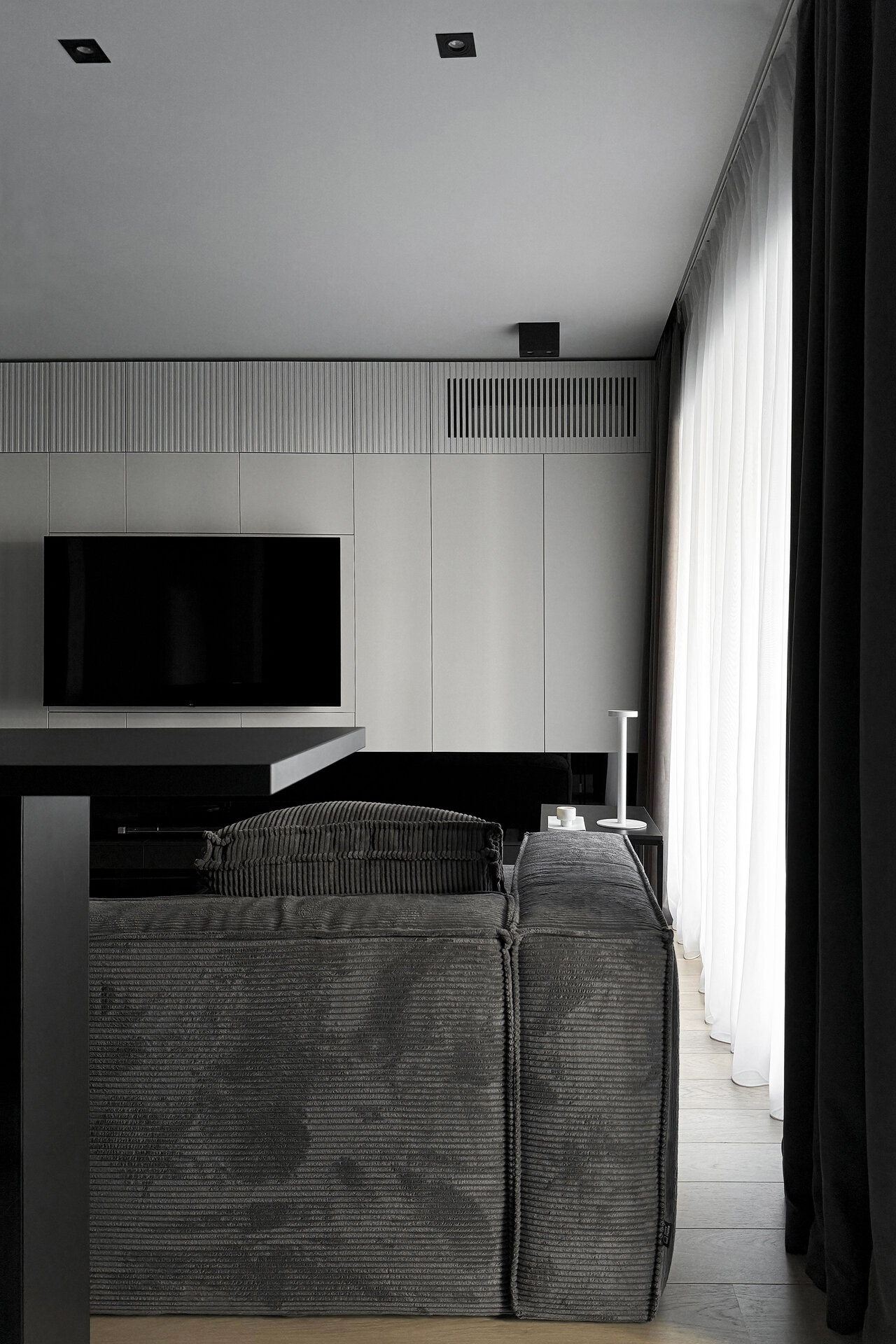 O particularitate a acestui proiect a fost legată în primul rând de posibilitatea de a face modificări asupra planului de compartimentare dar şi de crearea unui concept de amenajare personalizabil pentru două apartamente identice în cadrul aceluiaşi complex. Astfel, am reuşit să creăm un openspace din fosta bucătărie separată de zona de living printr-o partiţie de sticlă, dar să şi introducem o insulă cu zona de luat masa, care nu ar fi fost posibilă în compartimentarea iniţială propusă de către dezvoltator. Din punct de vedere al atmosferei, am considerat potrivită o abordare minimalistă şi discretă în tonuri de gri cu accente de negru integrate în diferite texturi, totul sub spoturi de lumină reglabile care pot crea scenarii diferite în funcţie de nevoile chiriaşilor. La nivel de materialitate, predomină suprafeţele reflectante, fie că vorbim de placări MDF cu aspect lucios sau placări de sticlă neagră, poziţionate strategic în relaţie cu lumina naturala şi diversele scenarii posibile de relaţionare cu spaţiul.